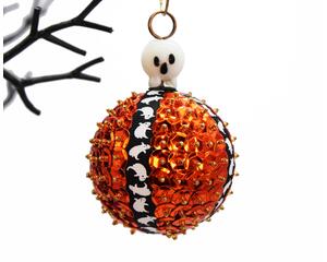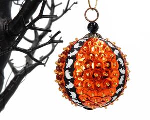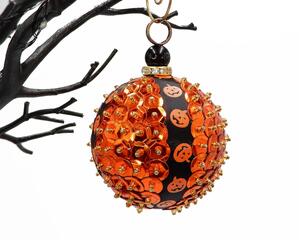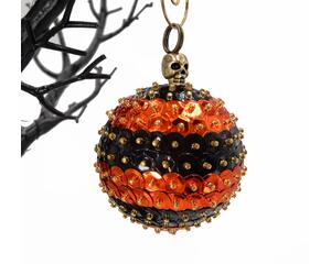 Halloween Ornament. Skull Topped Orange & Black Sequins. Spoo...