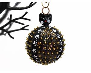 Sequin Black Cat Ornament. Black & White Paw Print Ribbon wit...