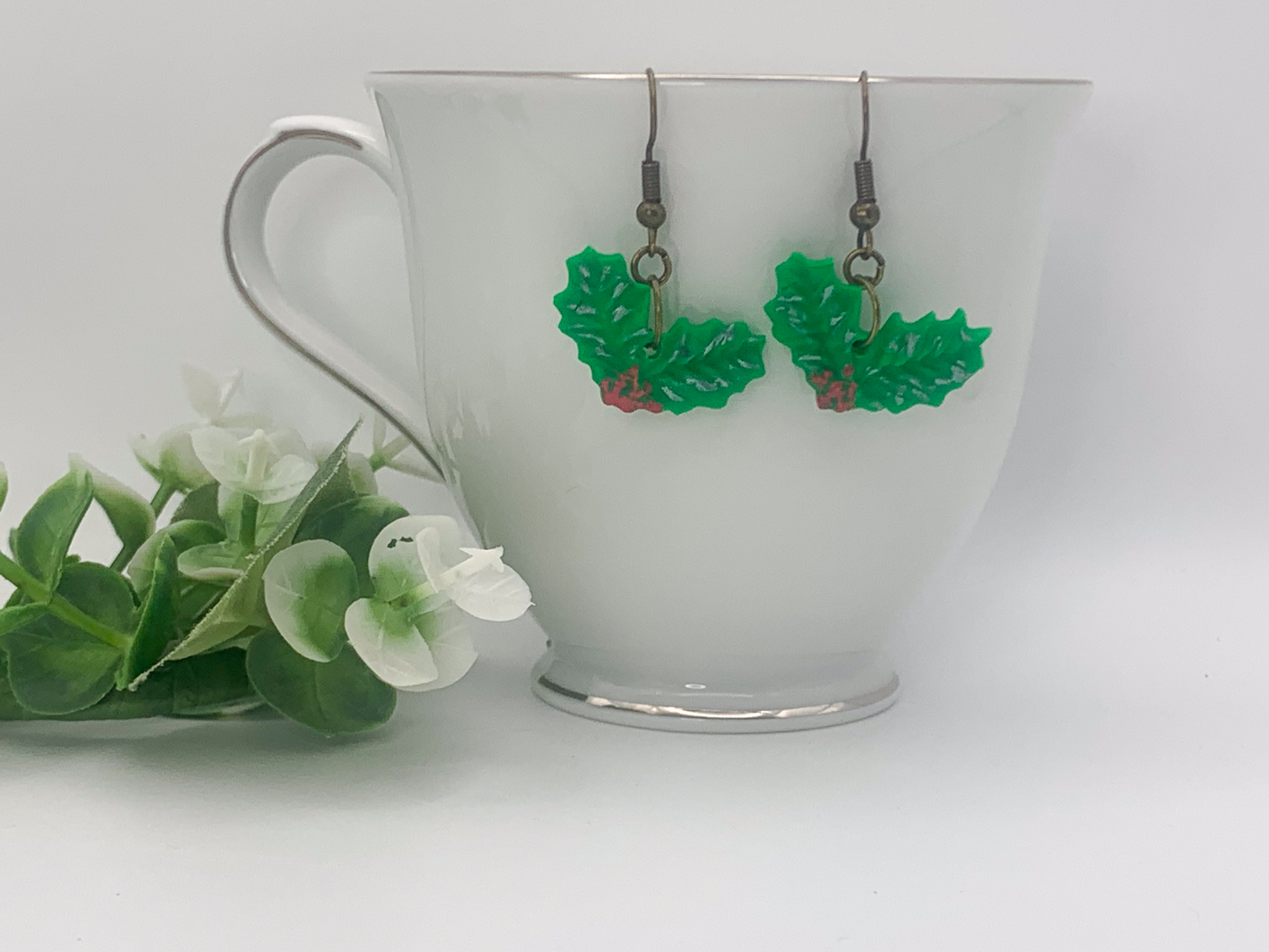 Celebrate the season with these charming holly leaf earrings! Featuring bright green leaves and tiny red berries, they’re a subtle yet festive accessory for any holiday occasion.