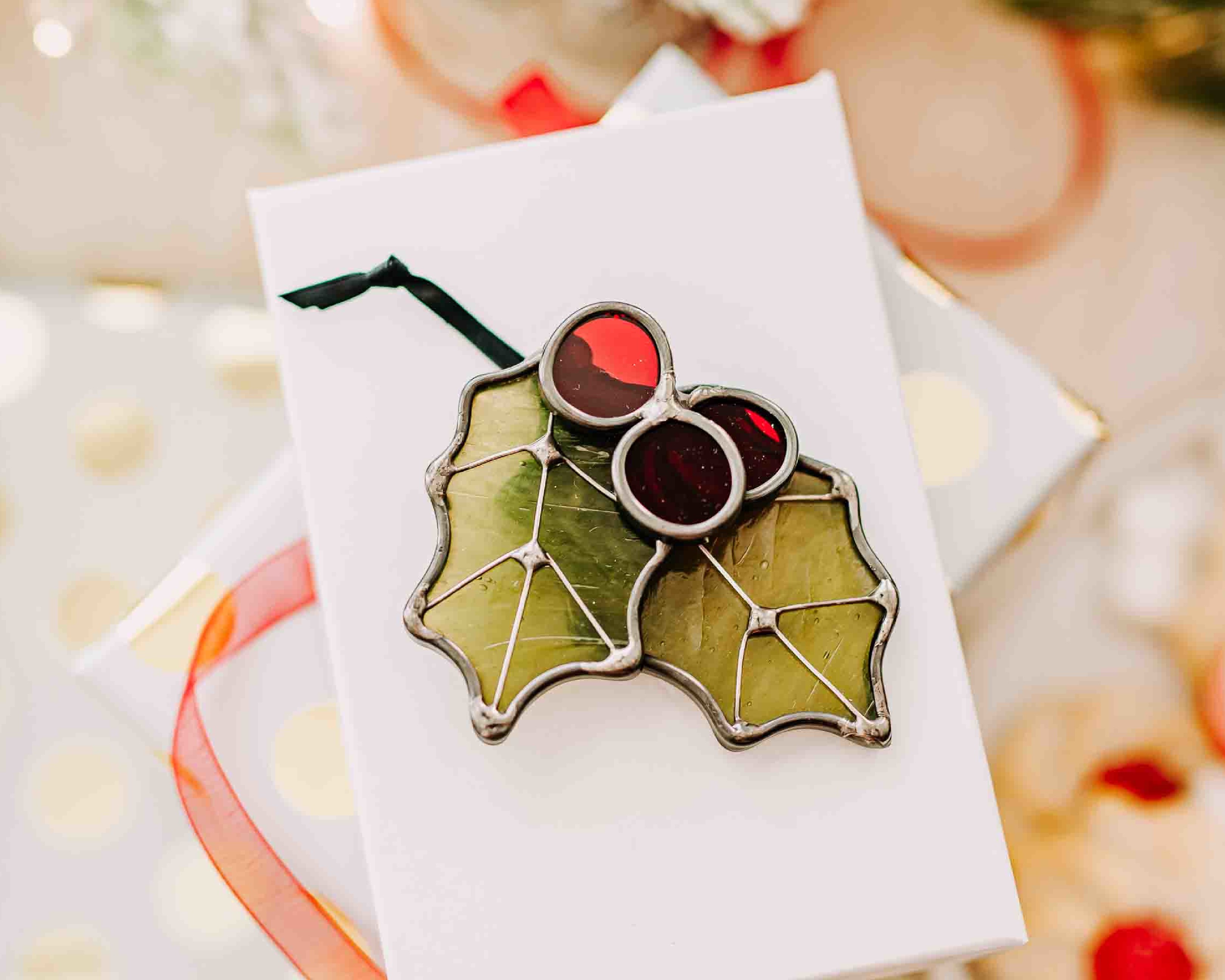 Feeling festive? This Holly stained glass ornament brings a touch of traditional holiday cheer to your space! With three vibrant red berries and streaky green leaves detailed with elegant wire veins, this piece beautifully embodies the essence of the winter season. The leaves and berries are securely soldered, ensuring both durability and lasting beauty.