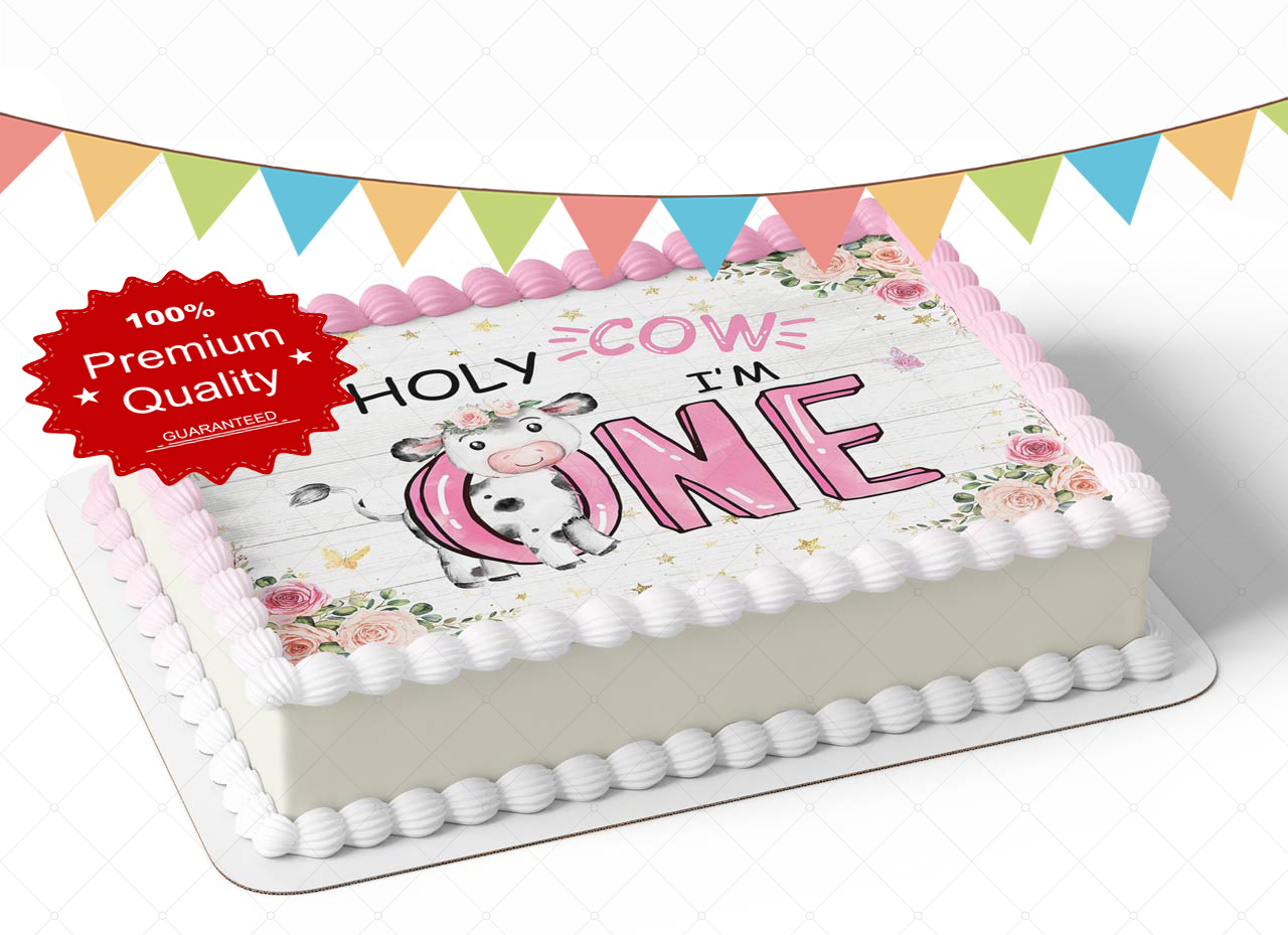 Holy Cow Im One Baby Pink Milk Cow Edible Image Themed Edible Birthday Party Cake Topper Sheet Edible Sticker Decal