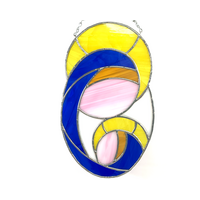 This religious stained glass panel that portrays the Holy Family measures 12.25" X 13.25"–just taller and wider than a sheet of letter size paper. The chain adds approximately 3" to the hanging height. Made of blue, variegated green, flesh tone, brown wispy for hair, yellow for halo and clear textured glass, this is an artistic statement piece with both translucent and reflective qualities. (That means it glows during the day when backlit by sunlight passing through the glass, and at night when indoor lighting bounces off the surface of the glass its colors remain vibrant.)