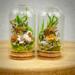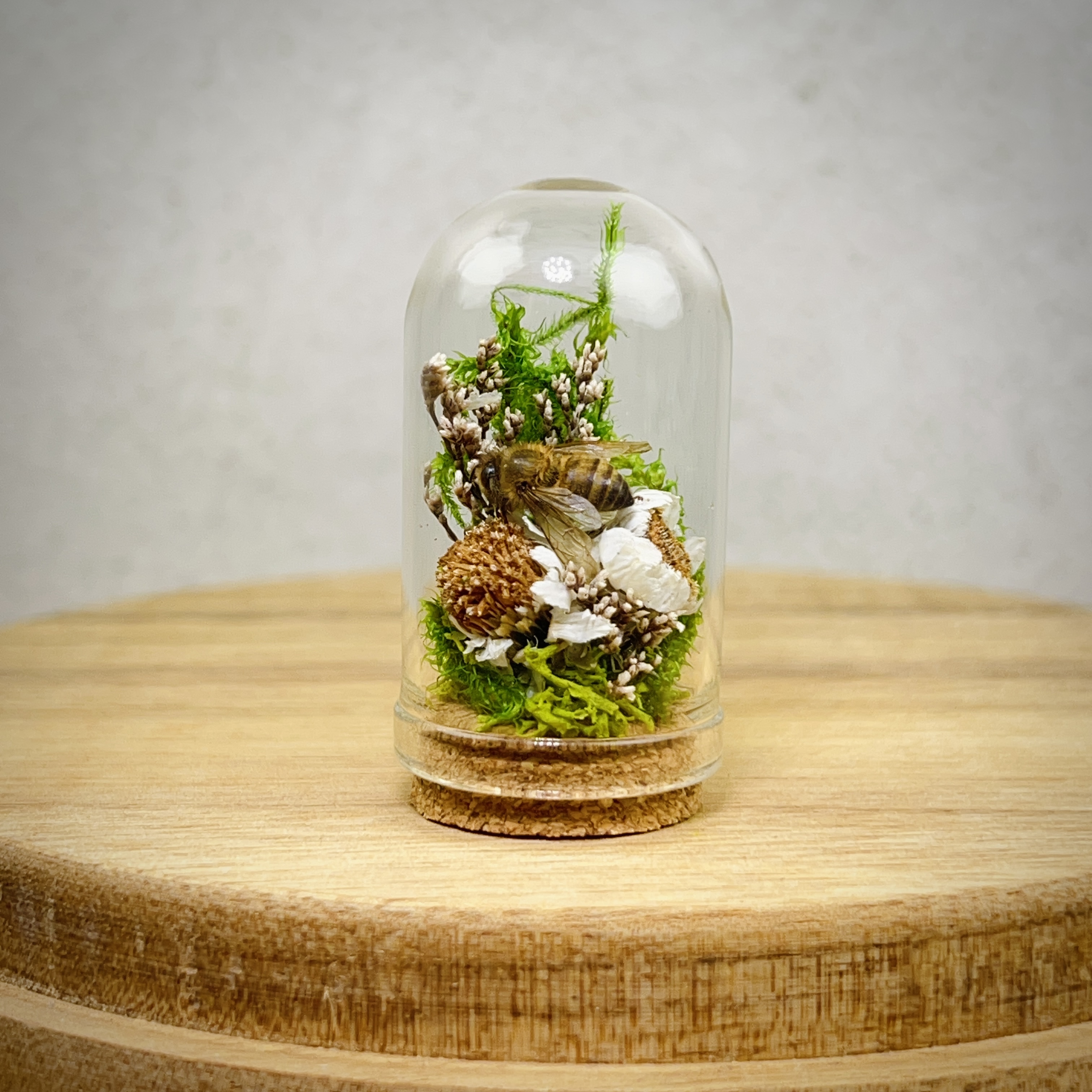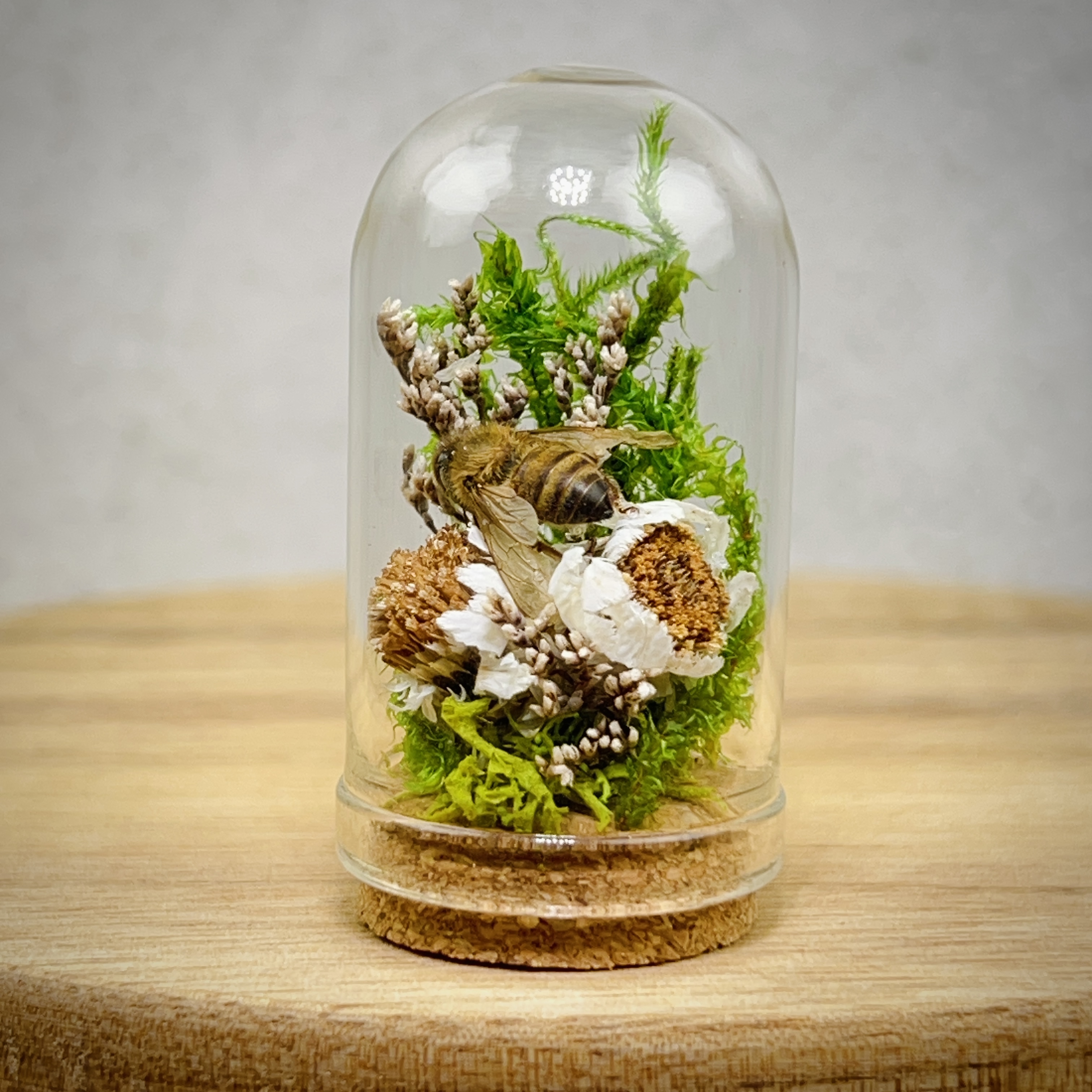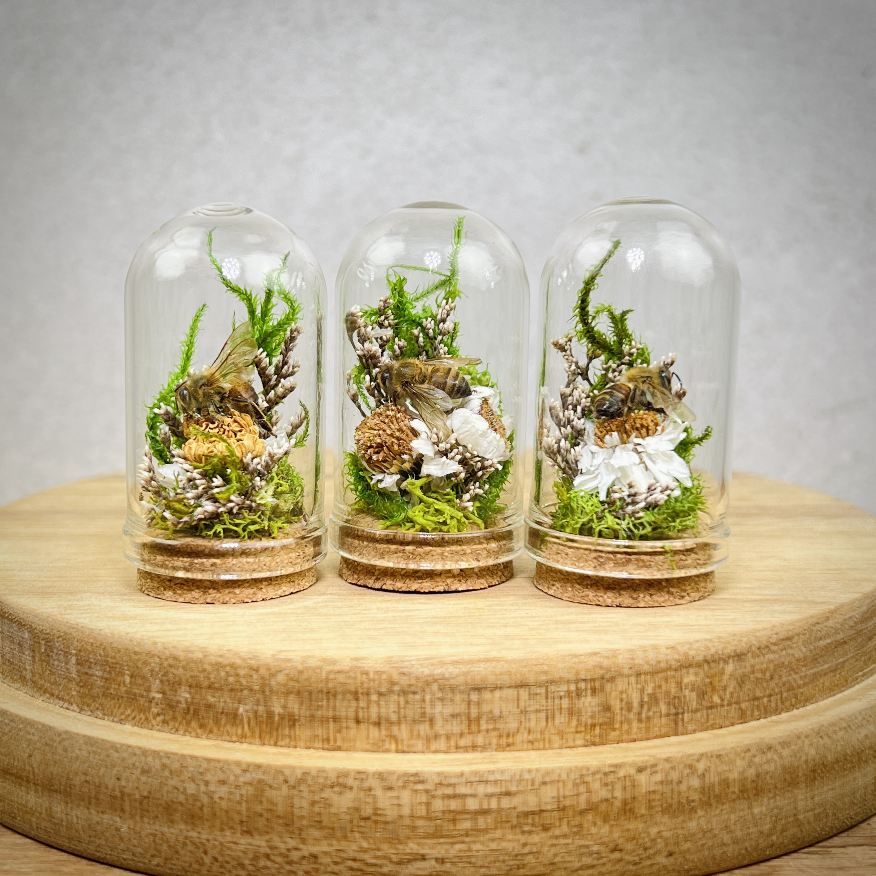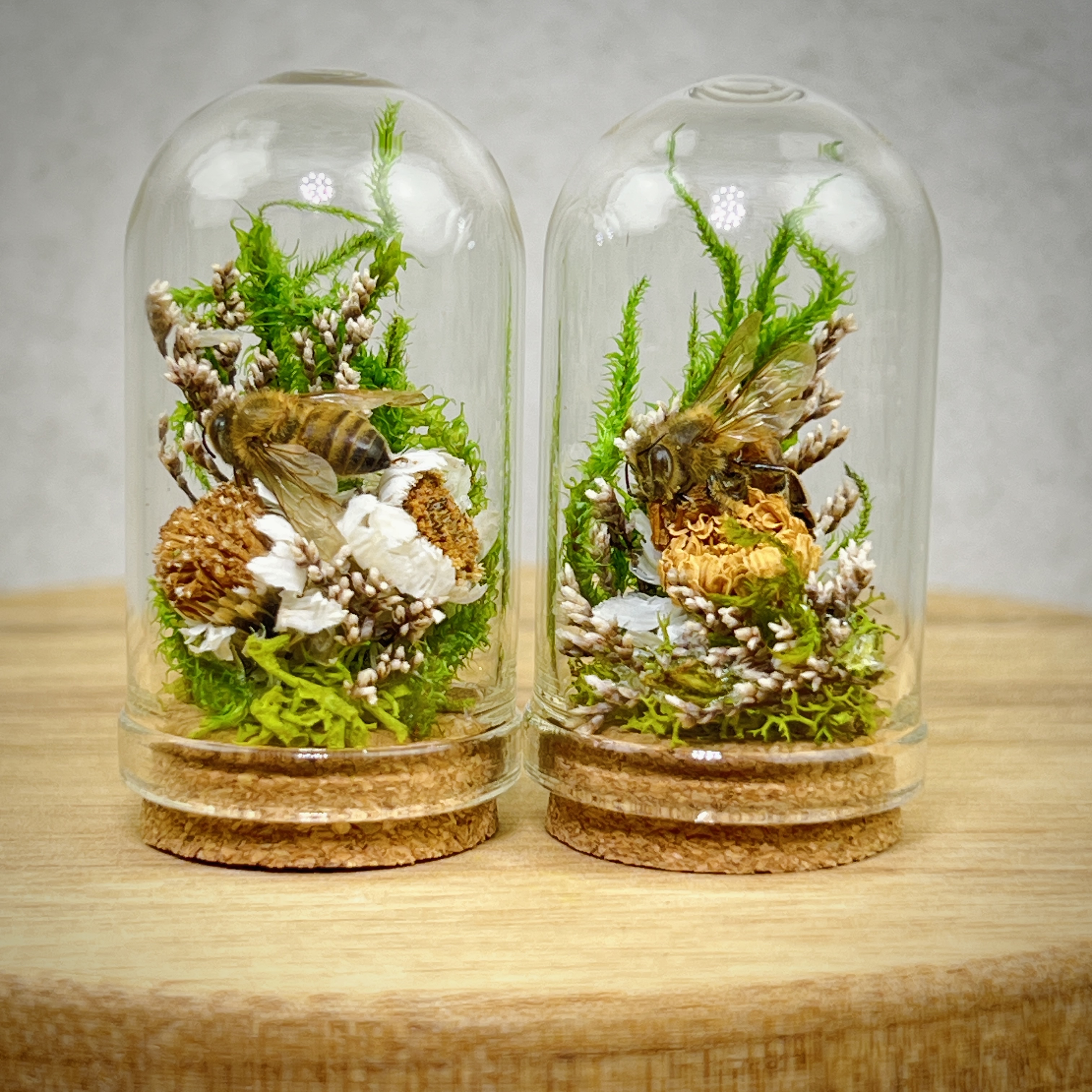 These real honey bees are lovingly nestled and arranged in miniature flower and moss arrangements and sealed in tiny glass dome jars with a cork. Each real bee taxidermy display is one of a kind. Rarely do we get to observe these fascinating animals in such a close up and intimate way. They are perfect gifts for the nature, biology, or science lover, or entomology insect collector in your life.