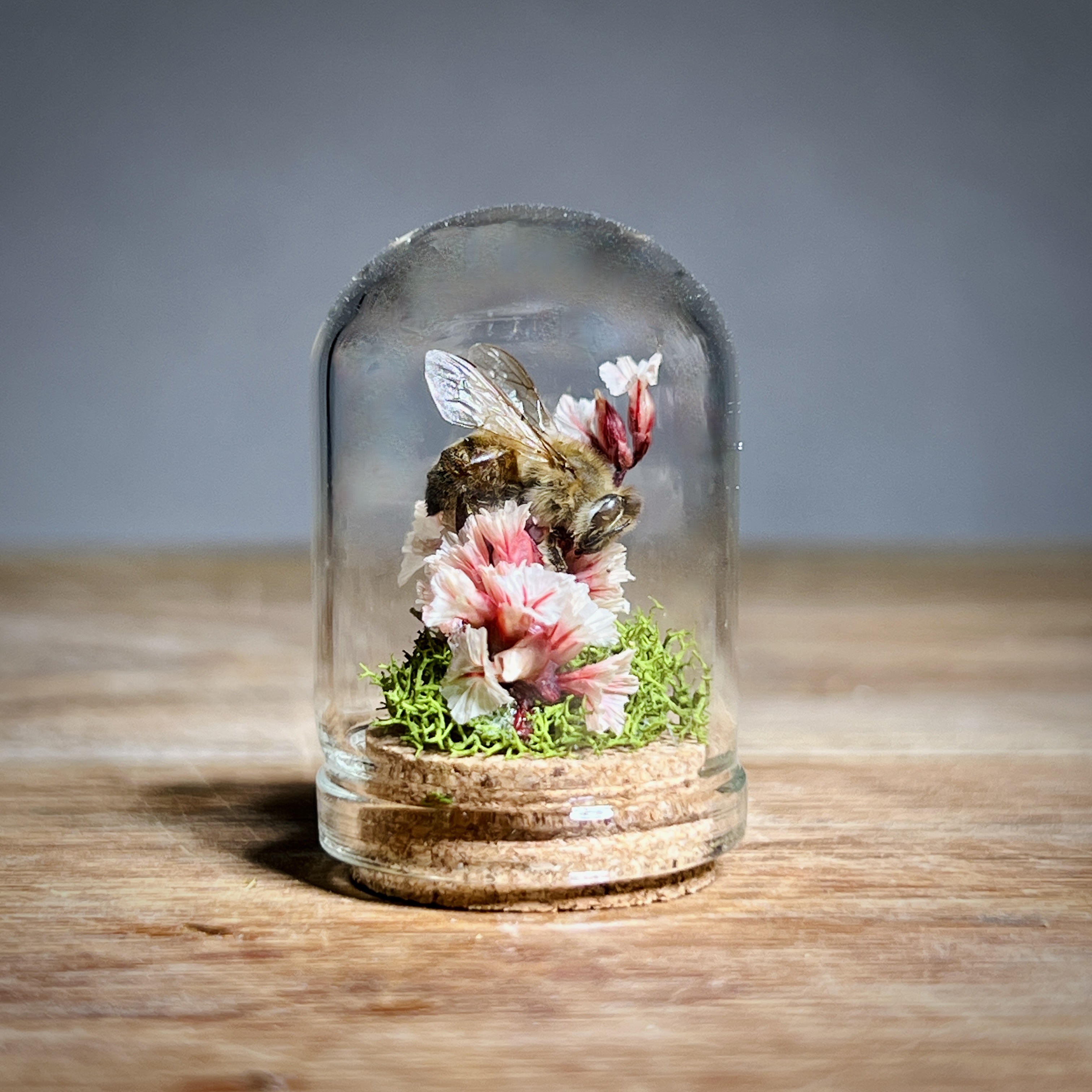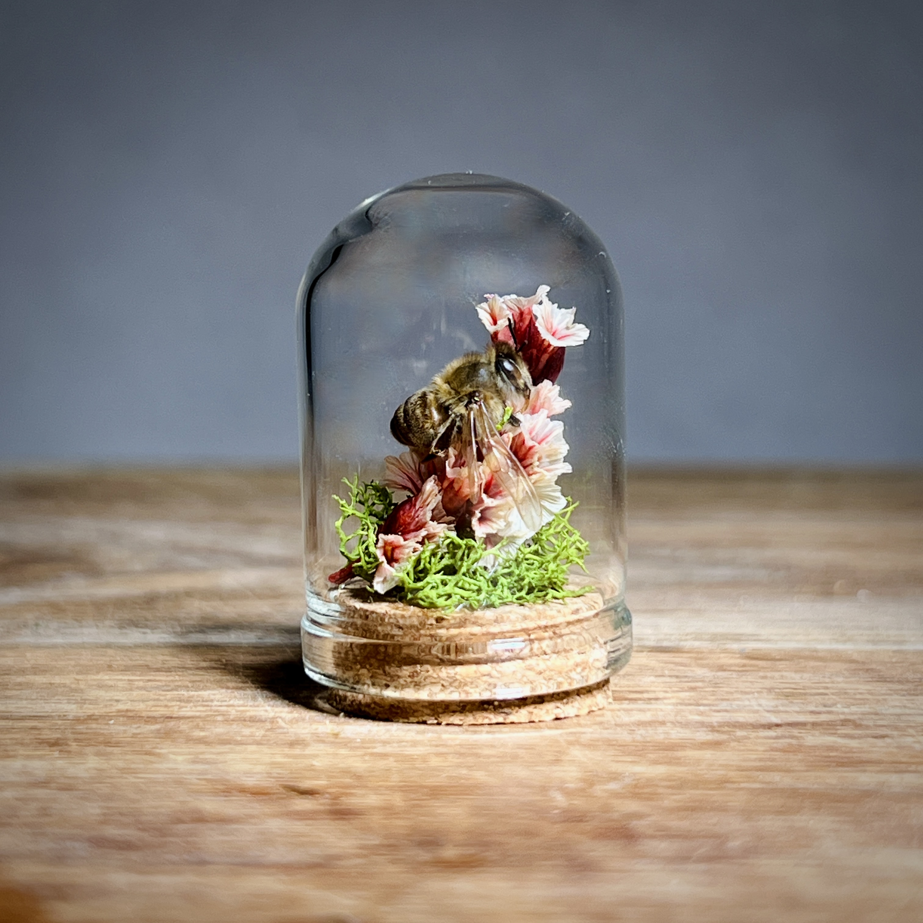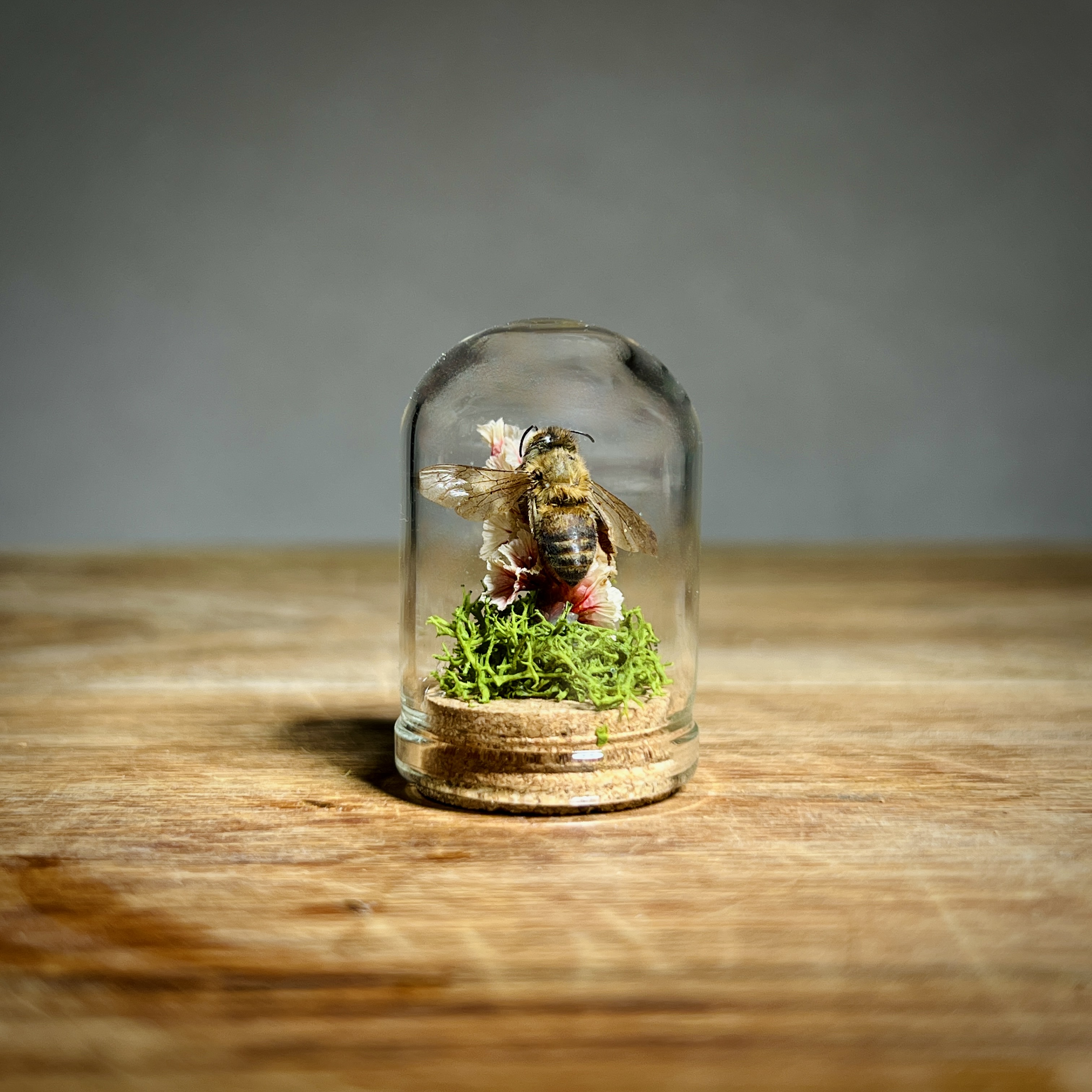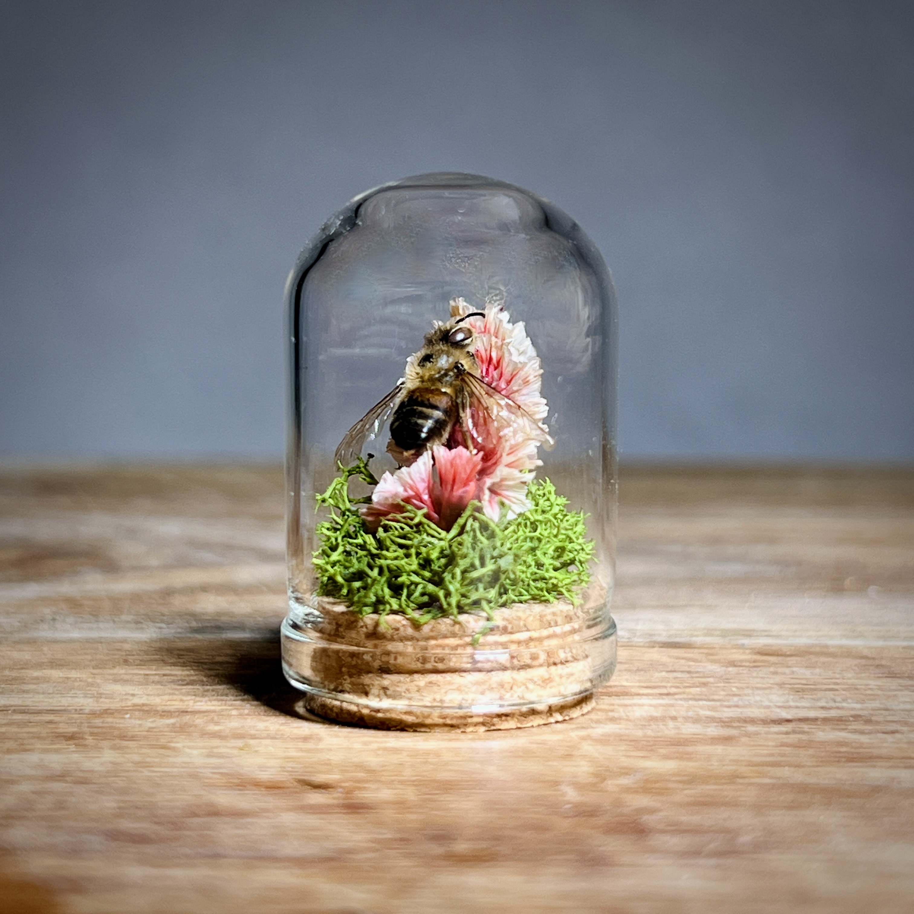 These real honey bees are lovingly nestled and arranged in micro flower and moss arrangements and sealed in tiny 1.3 inch glass micro dome sealed with a cork. Each real bee taxidermy display is one of a kind. Rarely do we get to observe these fascinating animals in such a close up and intimate way. They are perfect gifts for the nature, biology, or science lover, or entomology insect collector in your life.