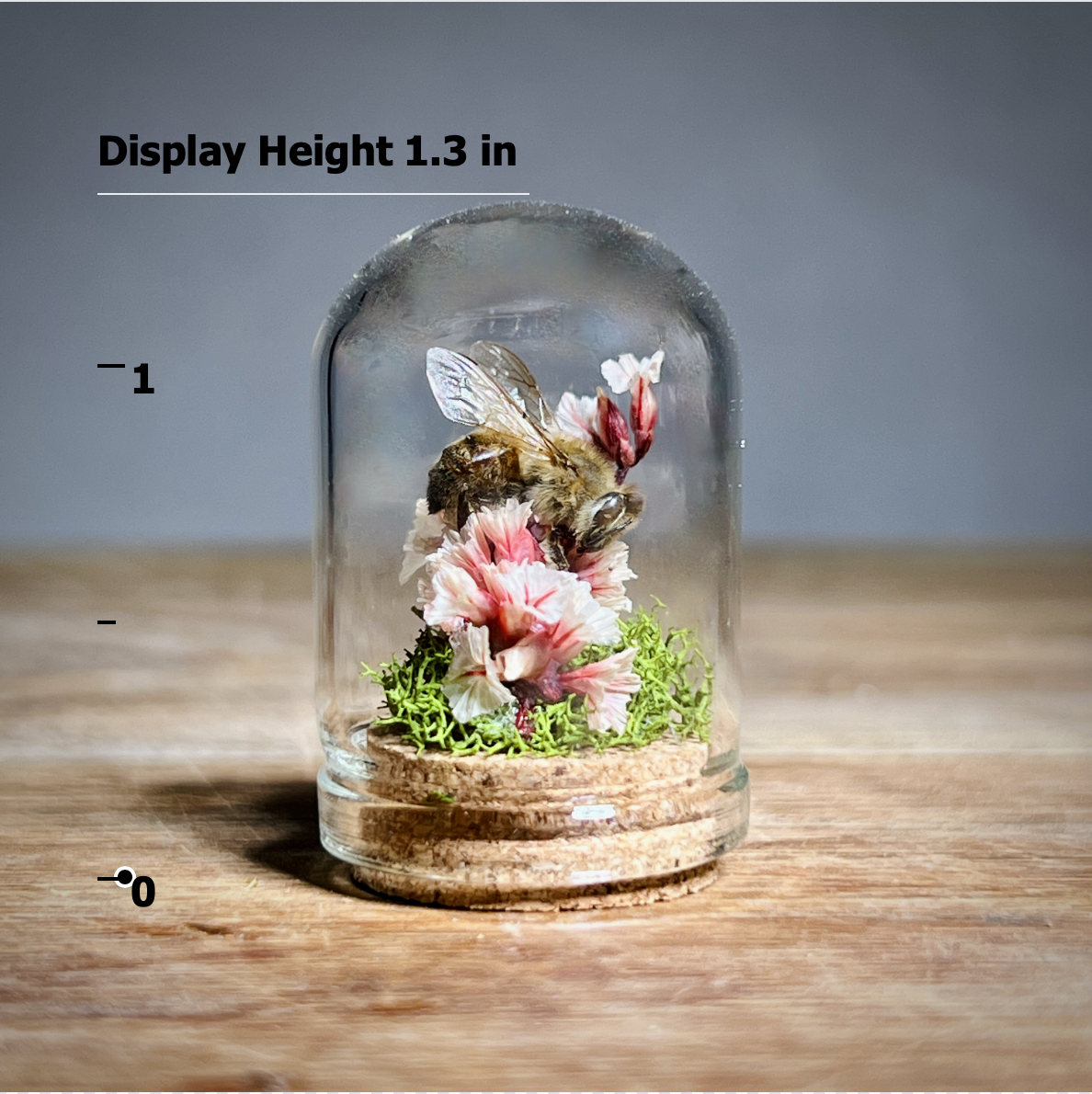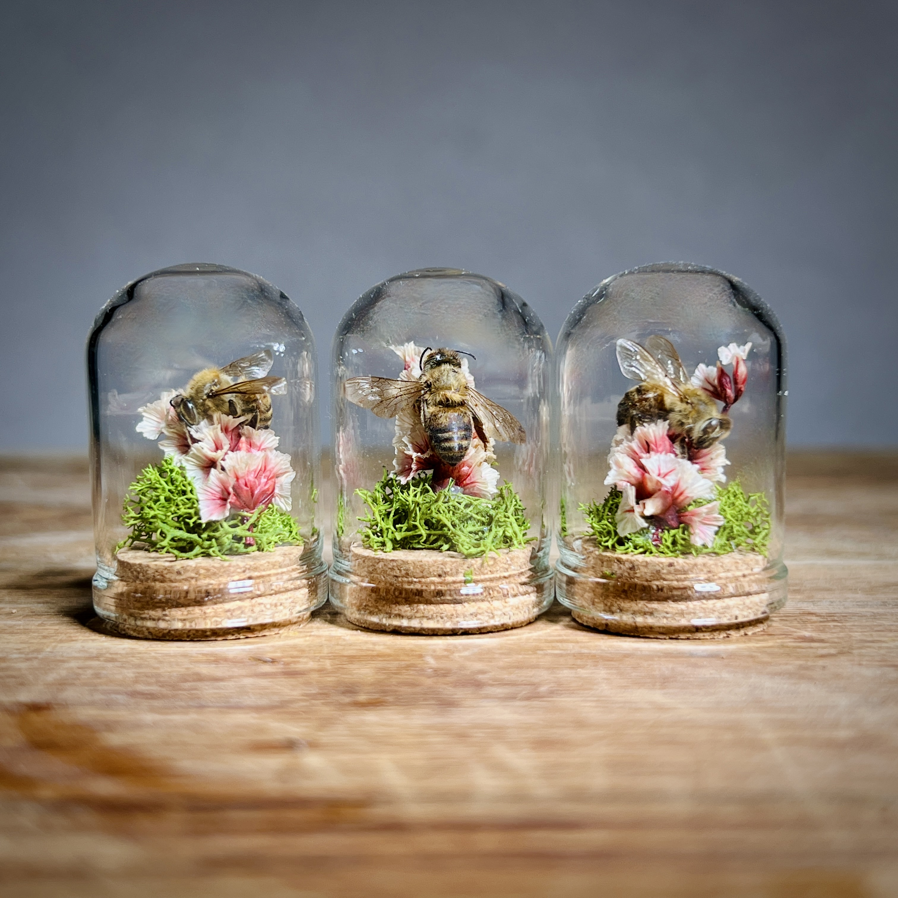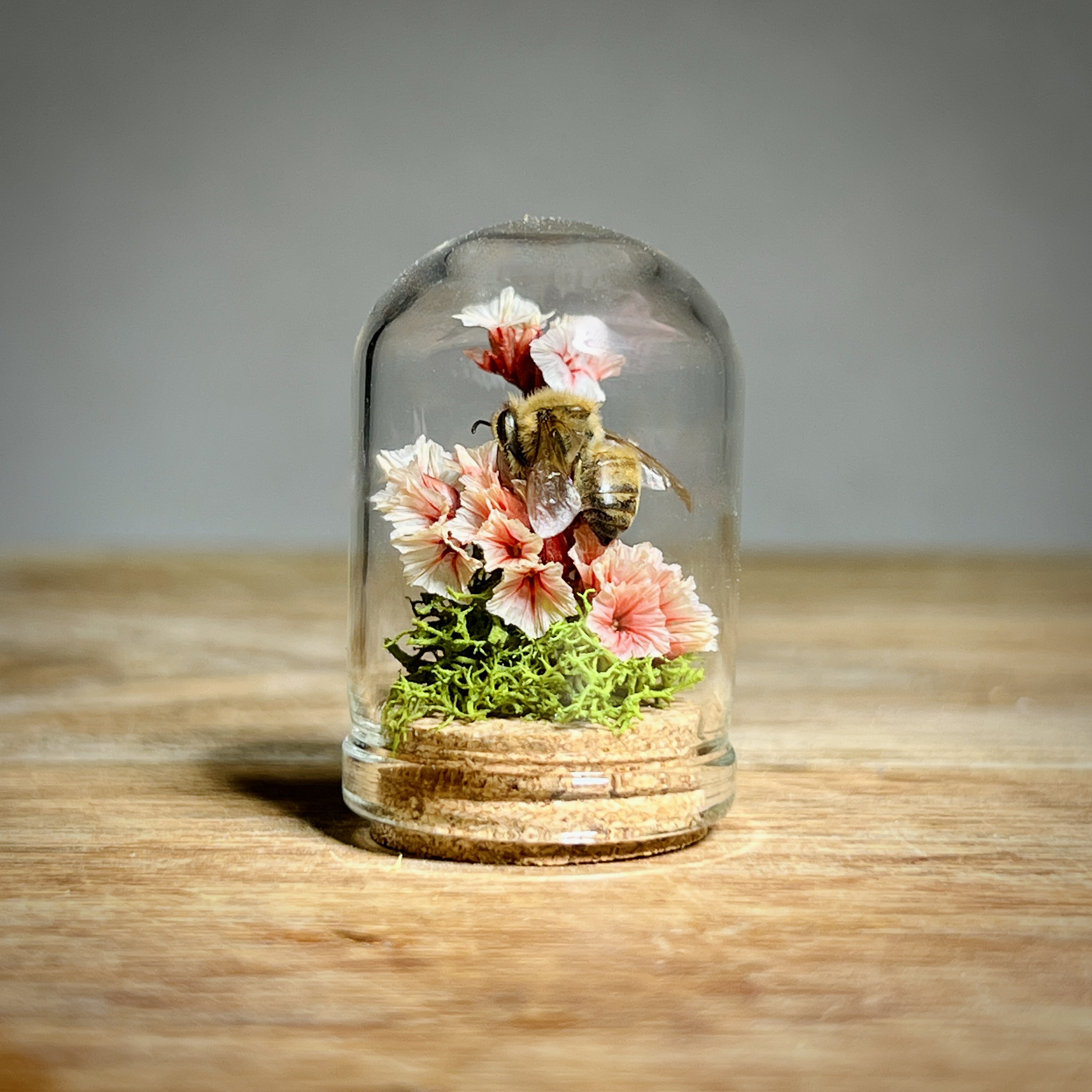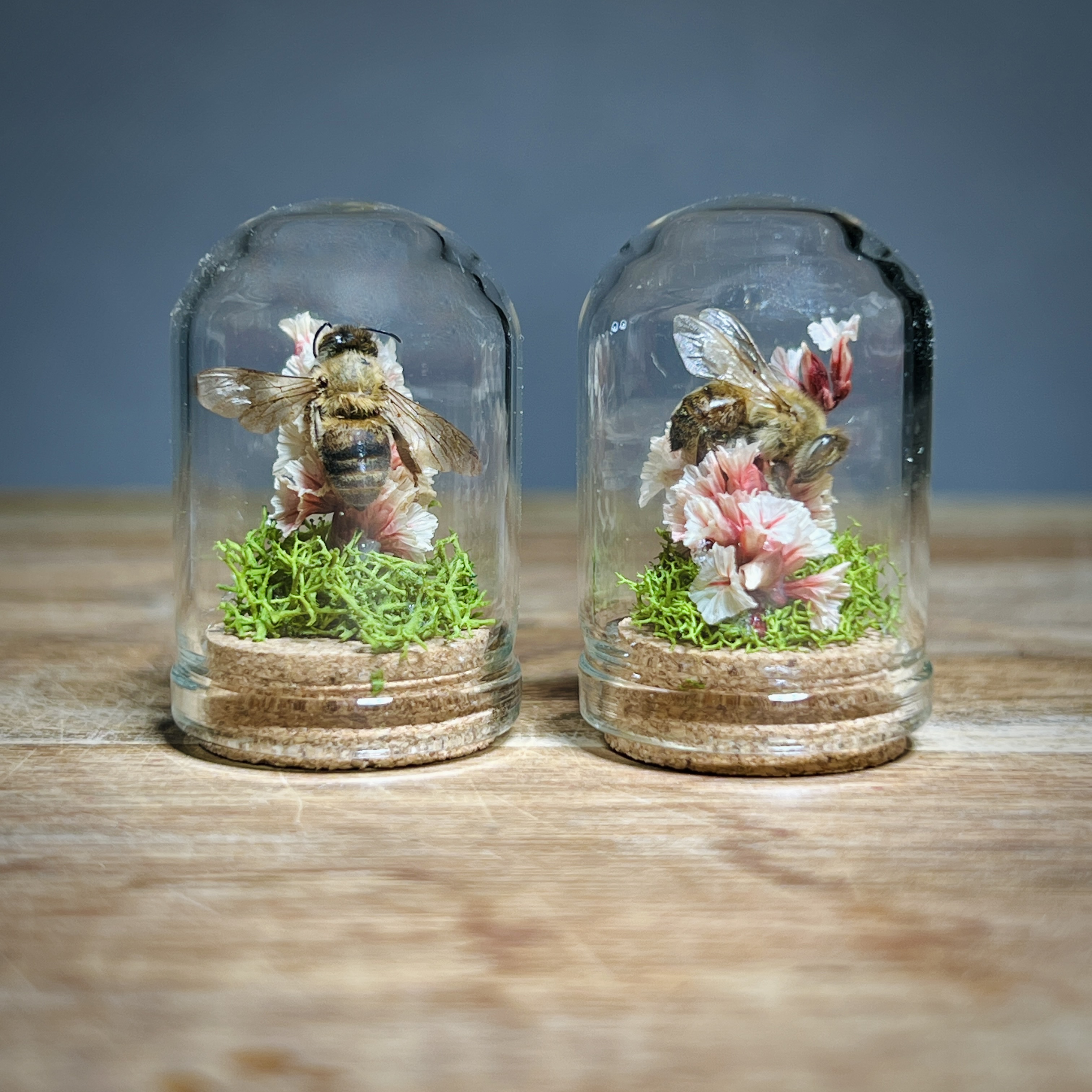 These real honey bees are lovingly nestled and arranged in micro flower and moss arrangements and sealed in tiny 1.3 inch glass micro dome sealed with a cork. Each real bee taxidermy display is one of a kind. Rarely do we get to observe these fascinating animals in such a close up and intimate way. They are perfect gifts for the nature, biology, or science lover, or entomology insect collector in your life.