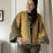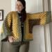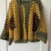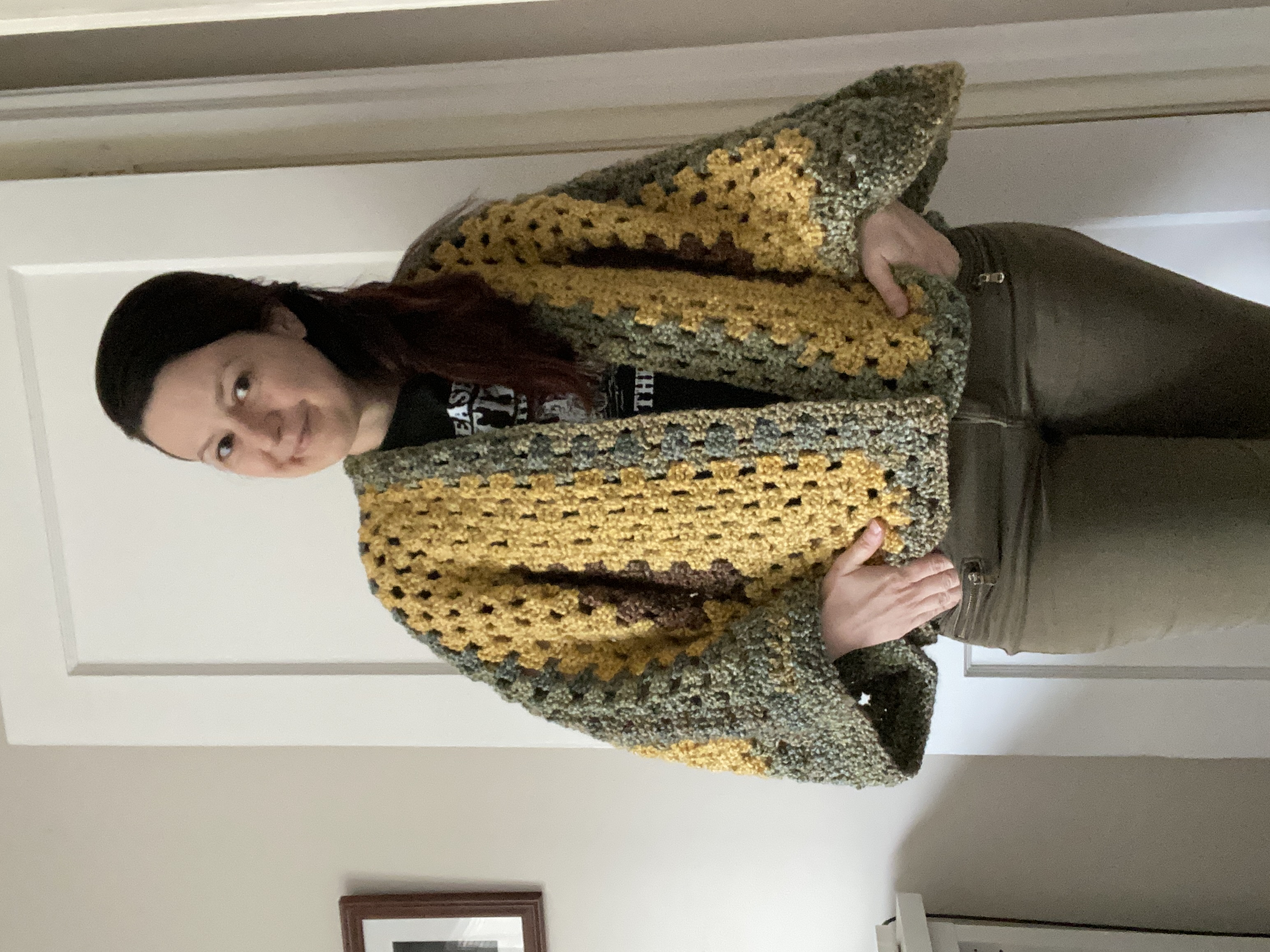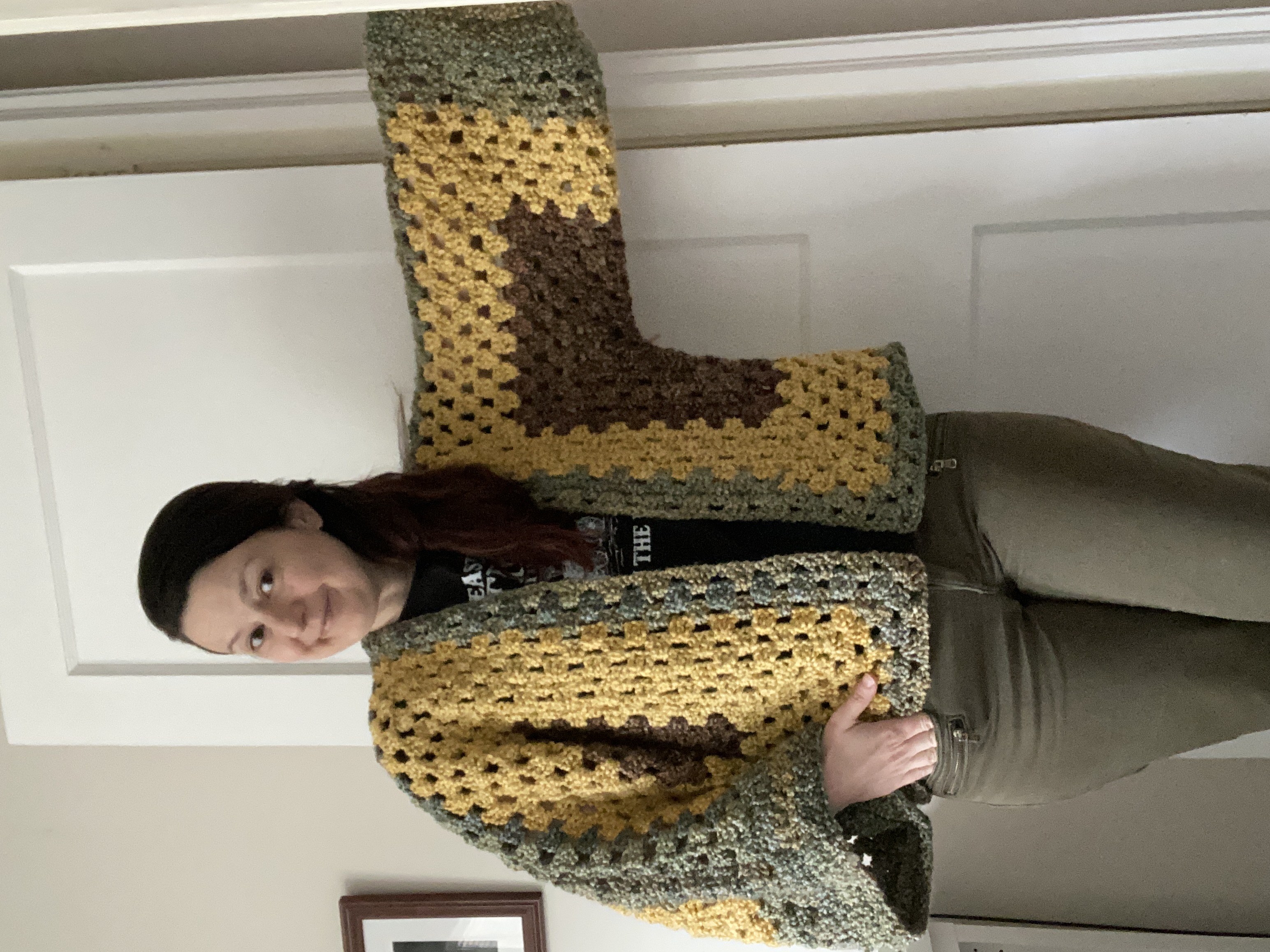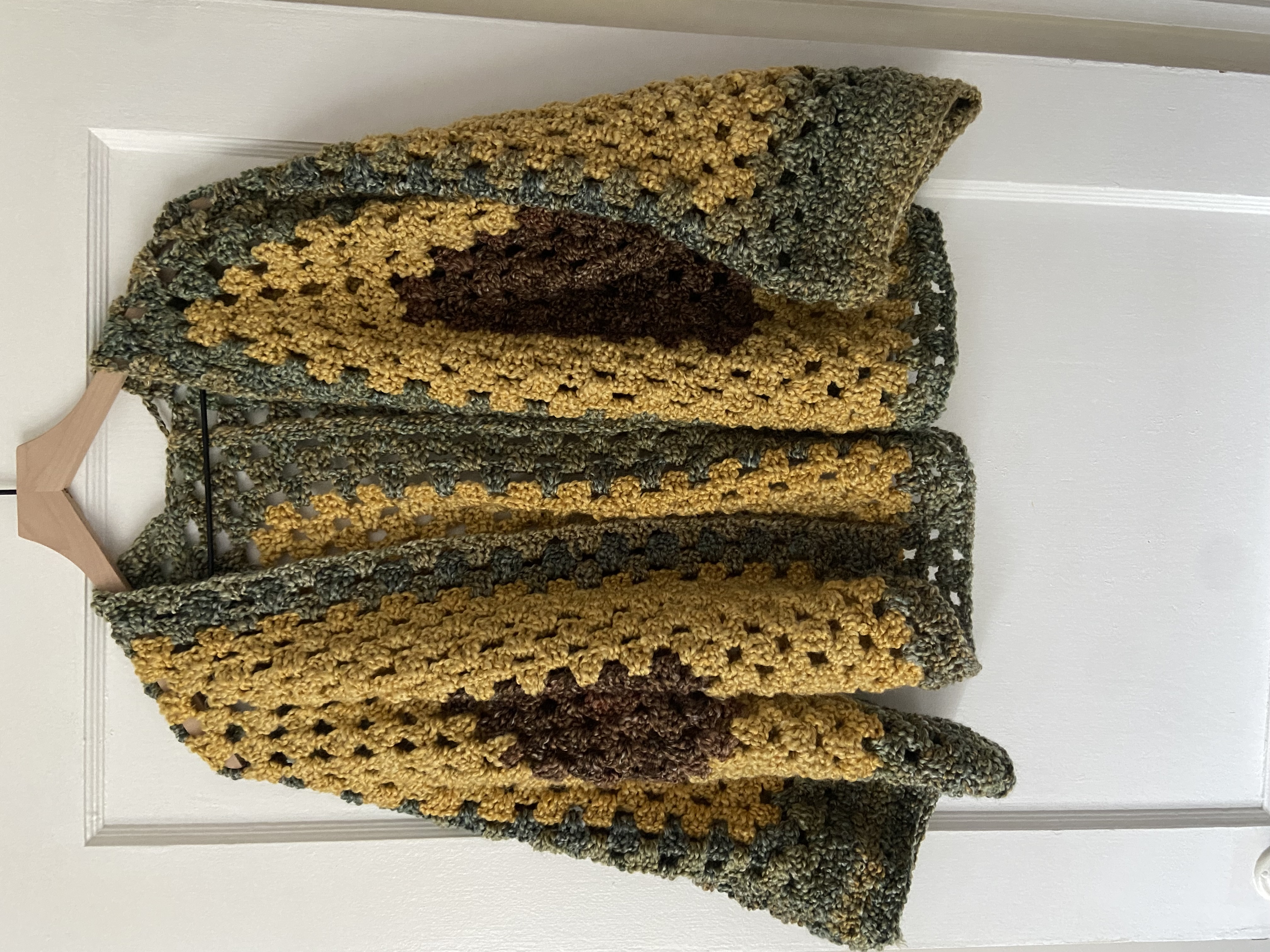 Hand crocheted oversized cardigan in a sunflower inspired color scheme. Cardigan in 21 in wide and 23 in long.