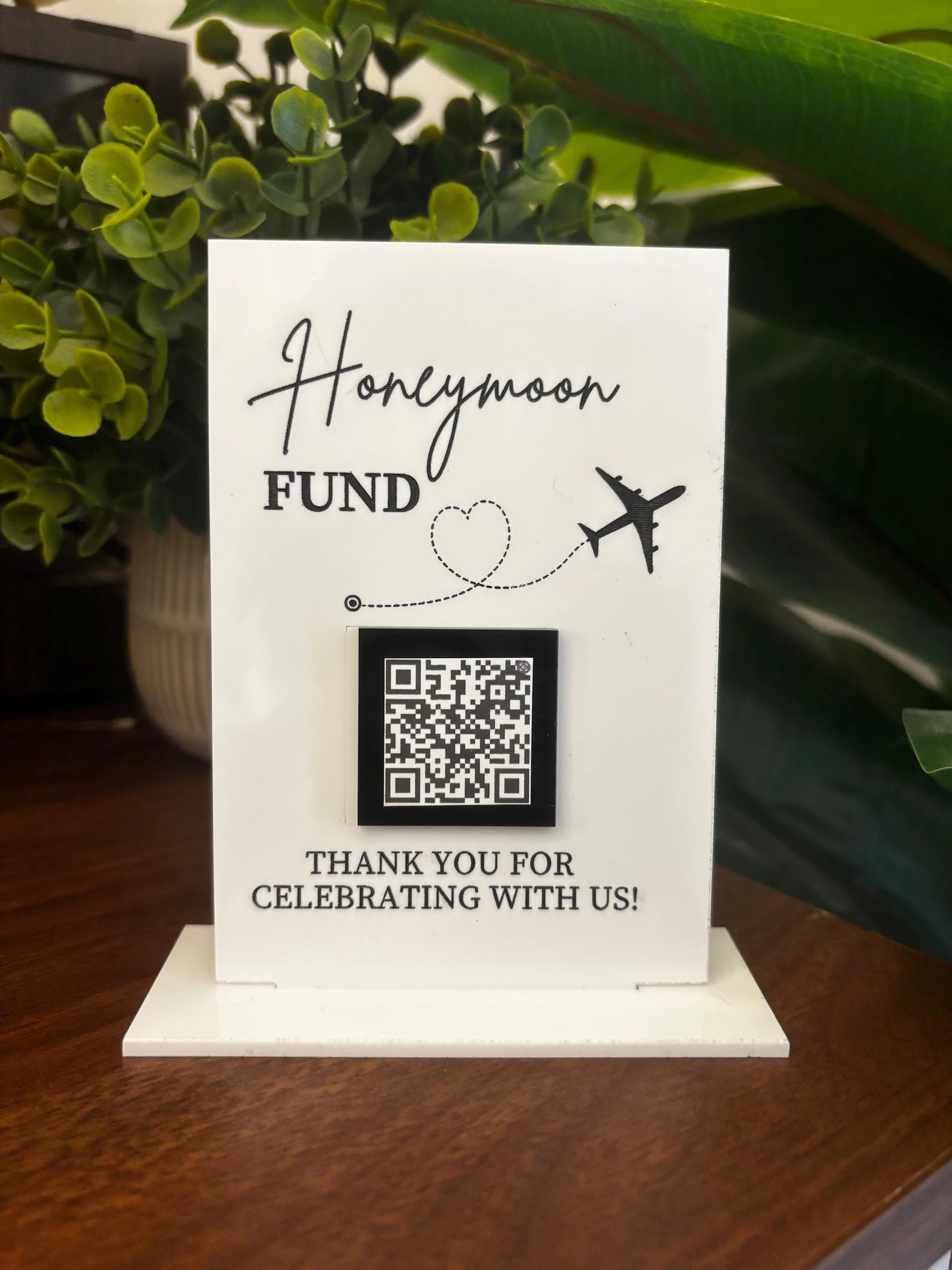 Our honeymoon fund sign is custom-cut from durable acrylic using our precision laser, then carefully engraved and hand-painted for a clean, polished finish. Each piece is made with love to add a stylish, personal touch to your celebration.
