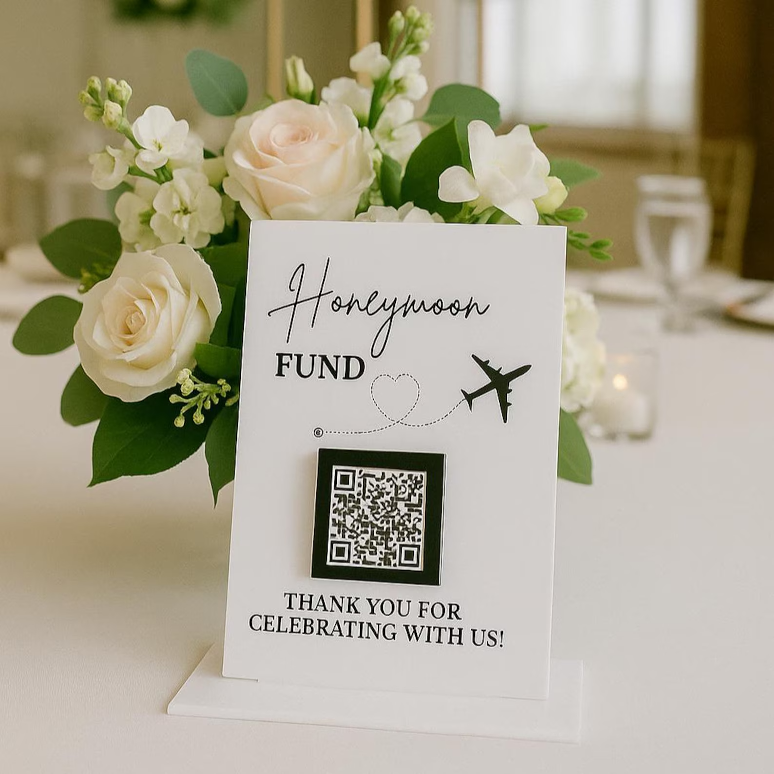 Crafted from durable acrylic, this elegant display features a 3D layered QR code attachment and engraved text that reads, “Thank you for celebrating with us.” It’s a modern and thoughtful addition to your wedding reception — ideal for guest tables, the card box area, welcome table, or guestbook station.