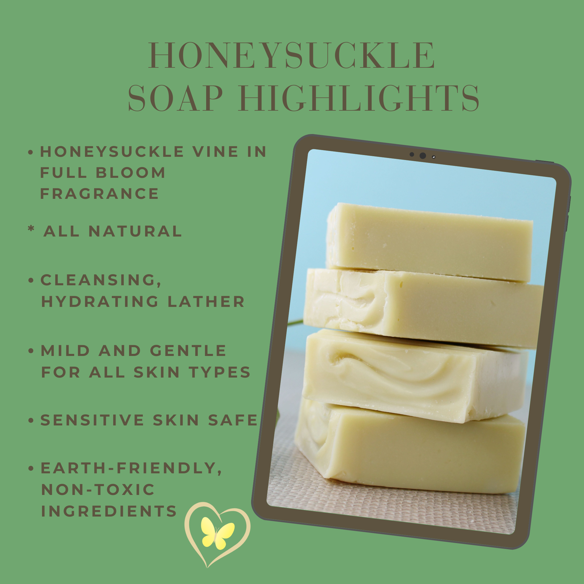 This luxurious, moisturizing, handcrafted Honeysuckle soap bar has a very sweet, calming aroma. This soap smells just like a honeysuckle vine in full bloom. The 100% pure and natural non-toxic ingredients used in this soap are known to have skin nourishing benefits, leaving your skin feeling pampered. You will appreciate the size and shape of this soap bar, making it easy to hold onto.