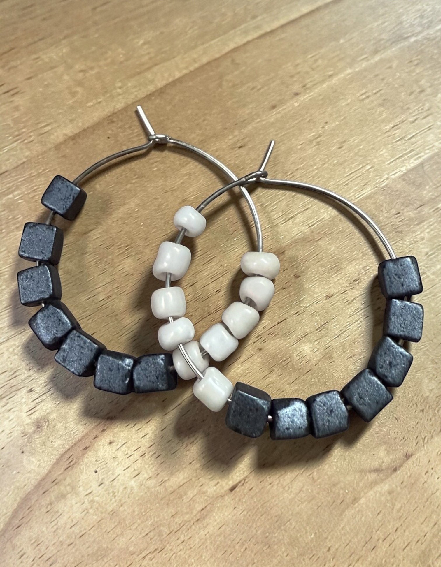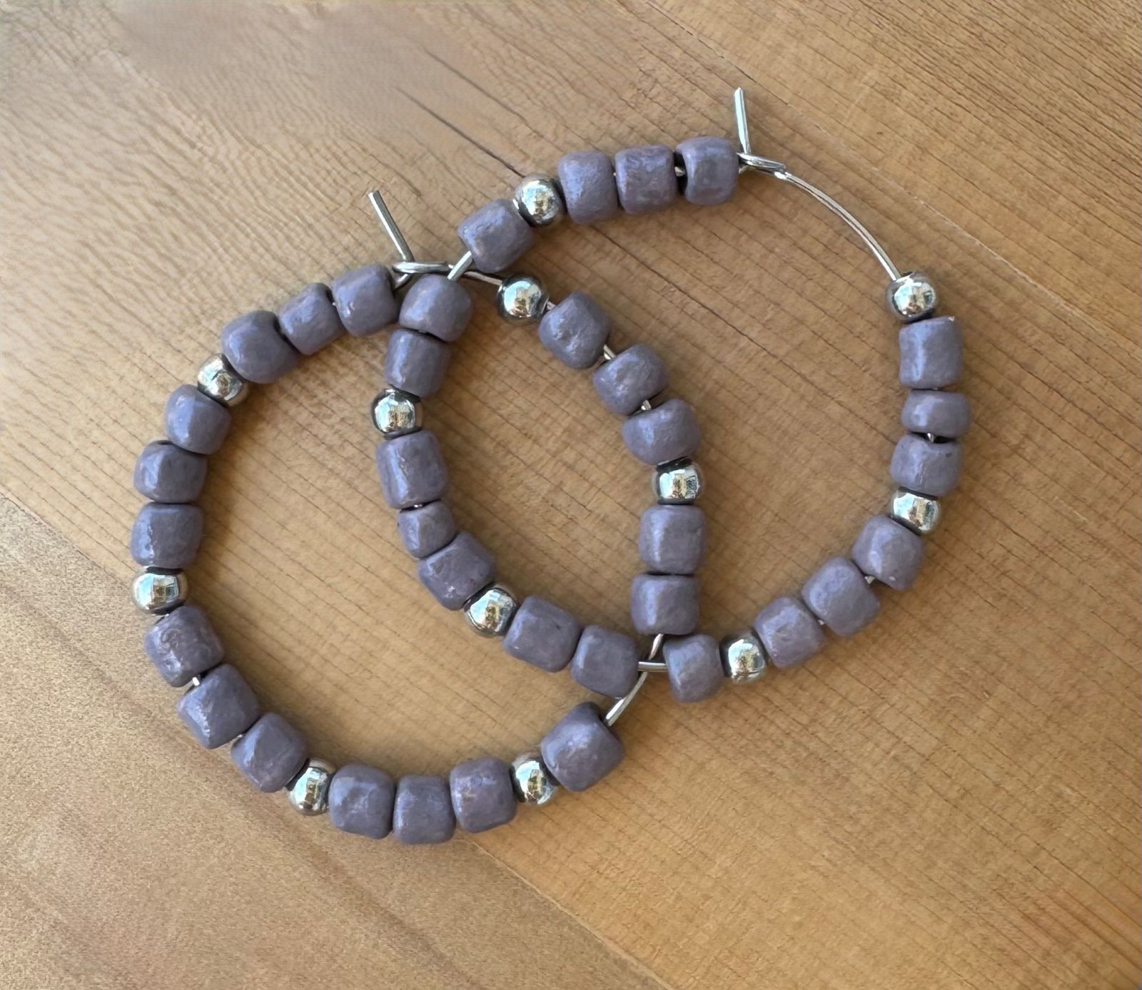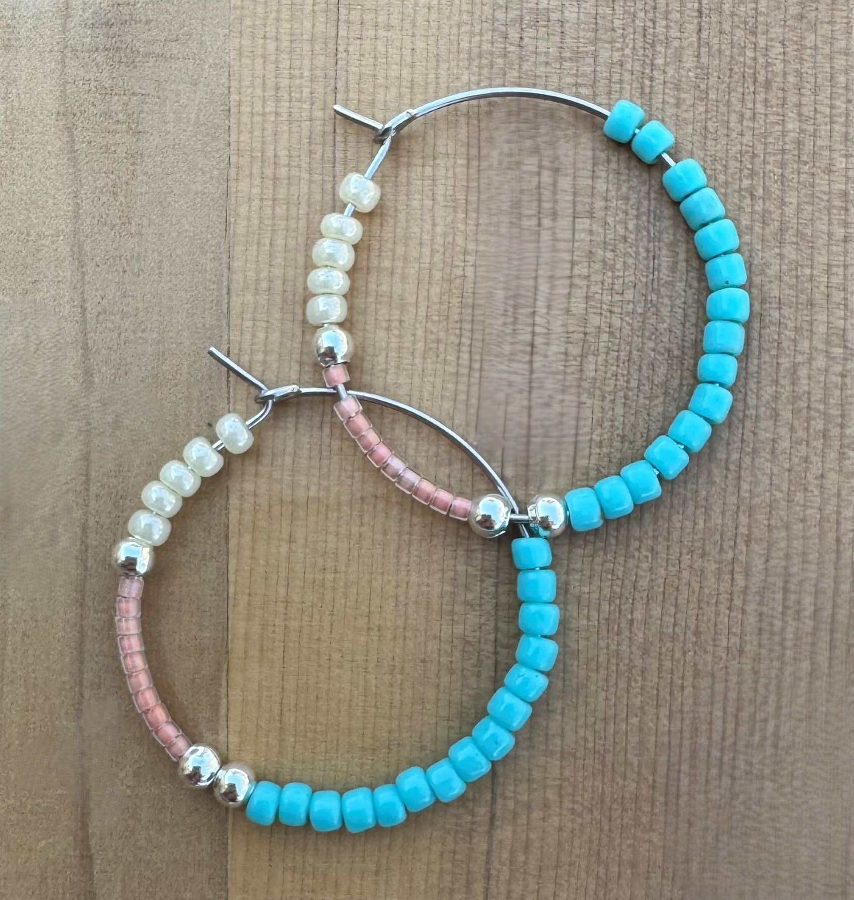 The beads vary in bead size from 3mm to 6/0mm. The hoops are sized at 30mm (1 1/4"). The hoops are lead and nickel free.