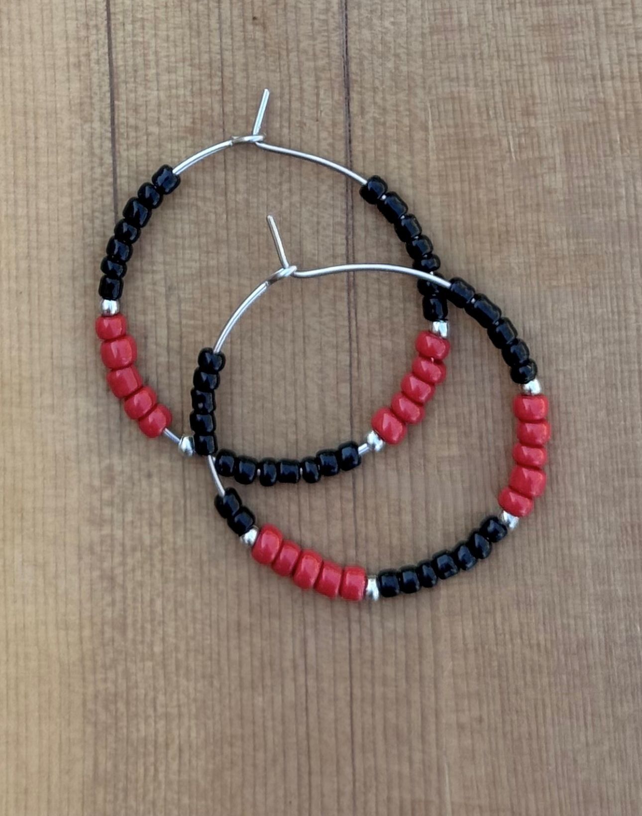 Each pair is hand crafted of glass beads and stainless steel hoops.