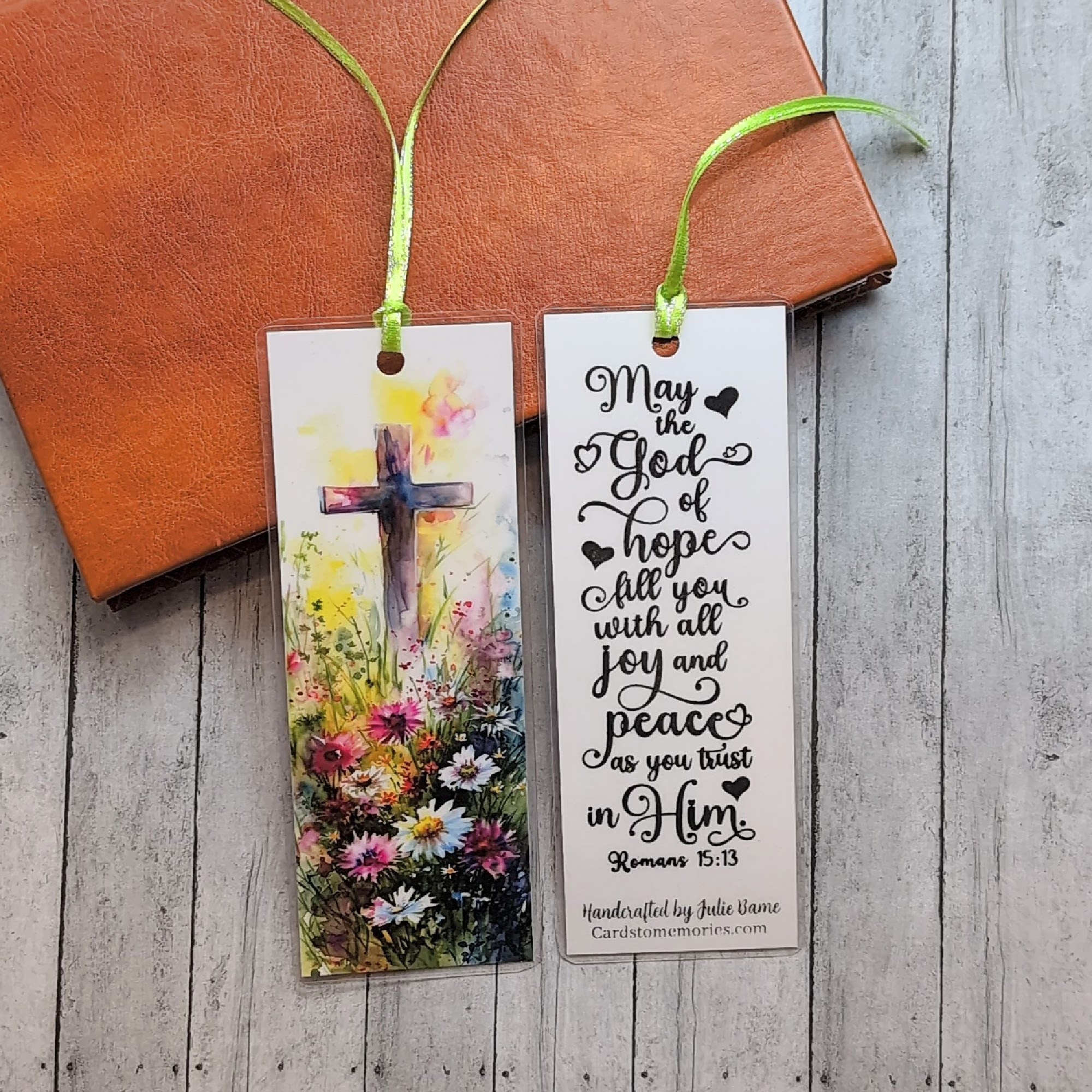 This handcrafted card and bookmark set offers a gentle expression of faith and encouragement. The card features layered textures and a front pocket holding a coordinating bookmark with a watercolor-style cross surrounded by wildflowers. Finished with a green ribbon, the bookmark’s reverse carries the full verse from Romans 15:13: “May the God of hope fill you with all joy and peace as you trust in Him.” Blank inside for your personal message, this faith-forward combo is ideal for spiritual milestones, encouragement, or simply reminding someone they’re held in grace. A keepsake gift of scripture and handmade care.