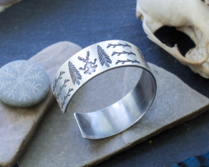 This horned god Cernunnos ring is inspired by traditional Shamanic and Viking jewelry. This Pagan Deity is sitting cross legged in the center, with pine trees on each side. The outer edges of the ring are adorned with rustic tree branches - a perfect symmetry. This is a cuff style ring, and though it can be adjusted, it should not be bent over and over. This is to prevent metal fatigue.