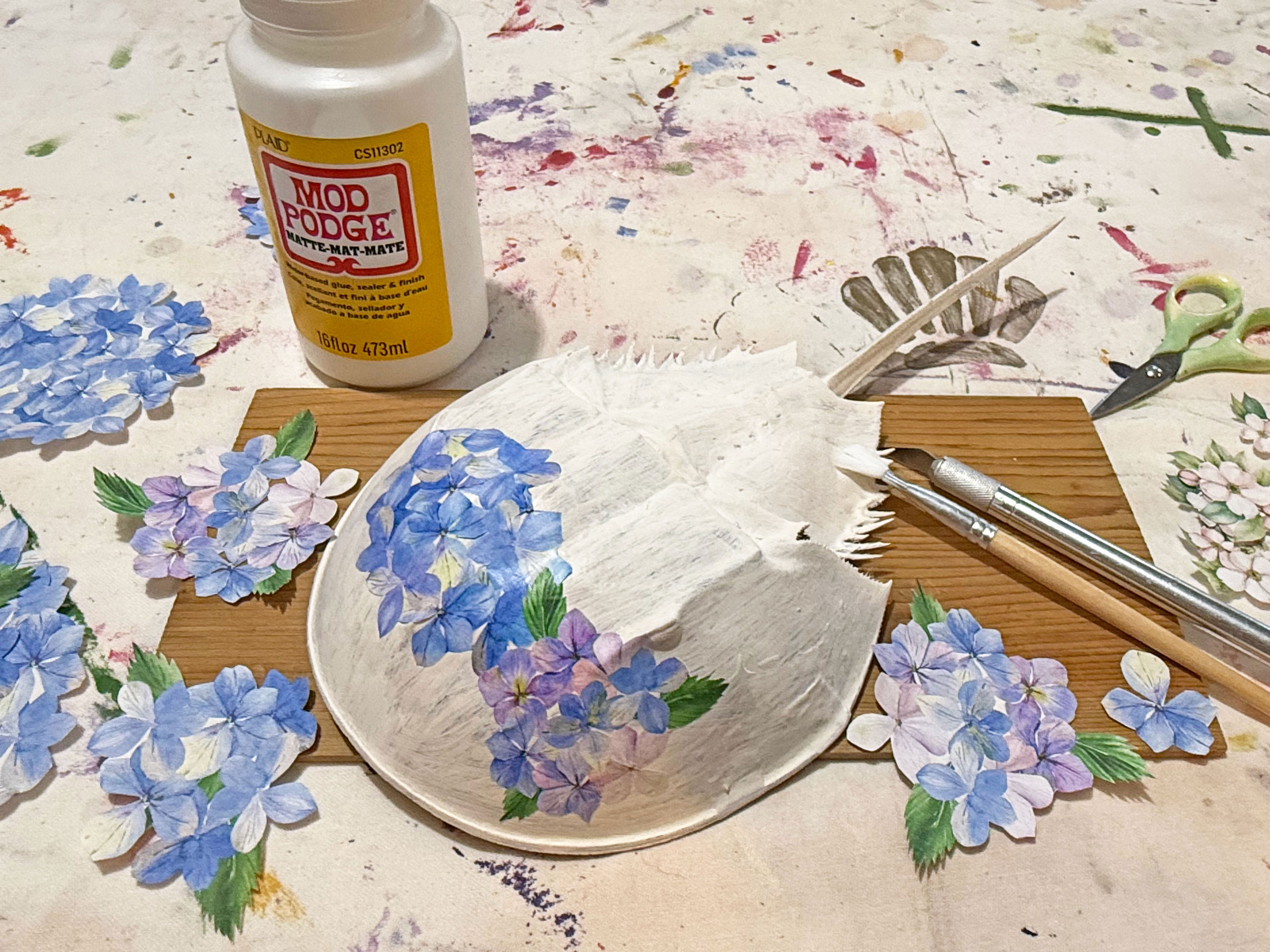 All of my pieces are one-a-kind, handmade by me. After cleaning the horseshoe crab shell, I sealed it with several coats of resin to give it strength, then I painted it off white, oyster white to be exact. Each hand-cut hydrangea blossom cluster was applied one at a time with modge podge. After drying, I sealed the entire shell with two more coast of resin to protect the decoupage. Notice that the underside of the horseshoe crab shell is still in it's natural, unpainted state. Due to drying and curing times, each decoupage piece takes almost a week to complete.