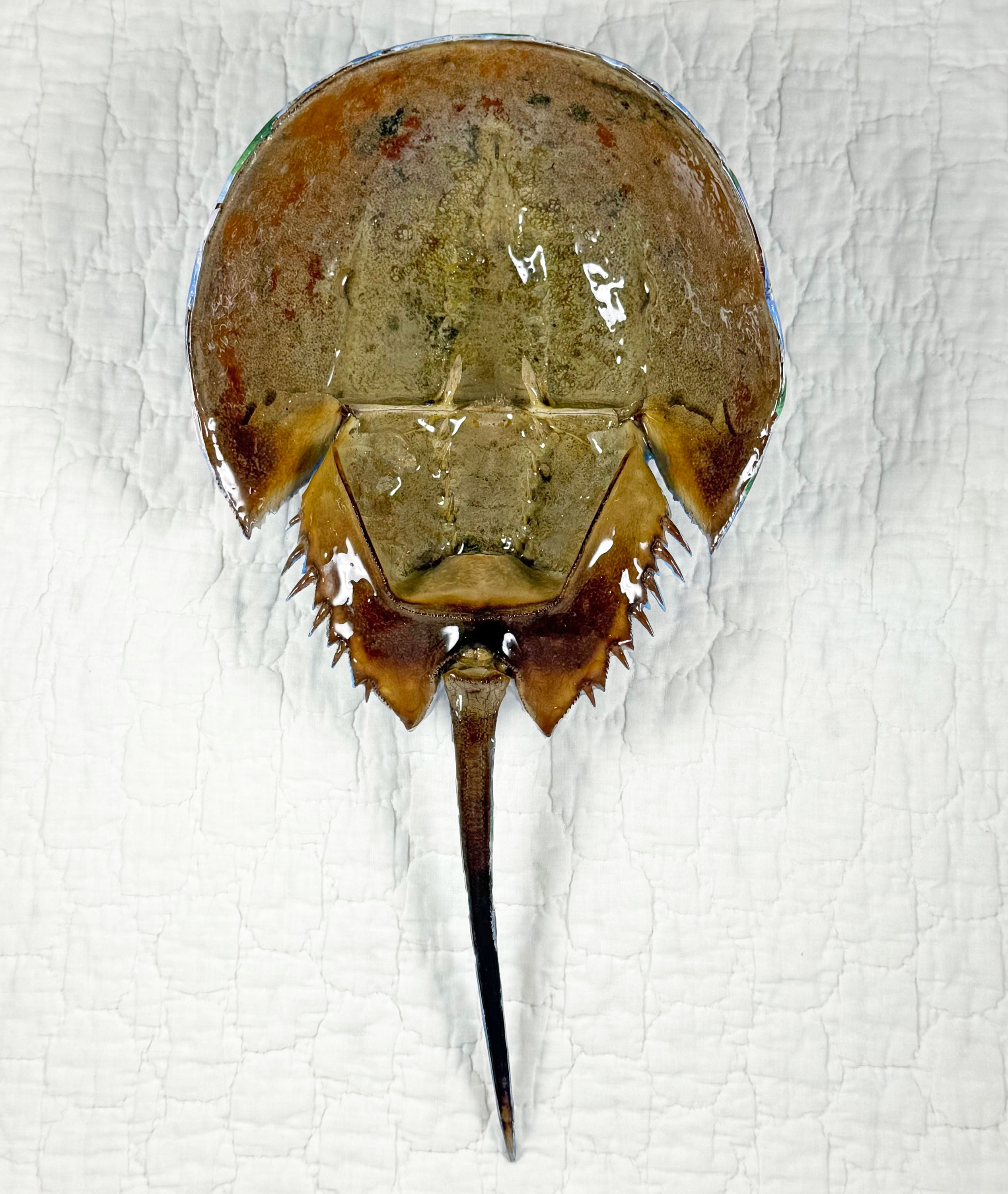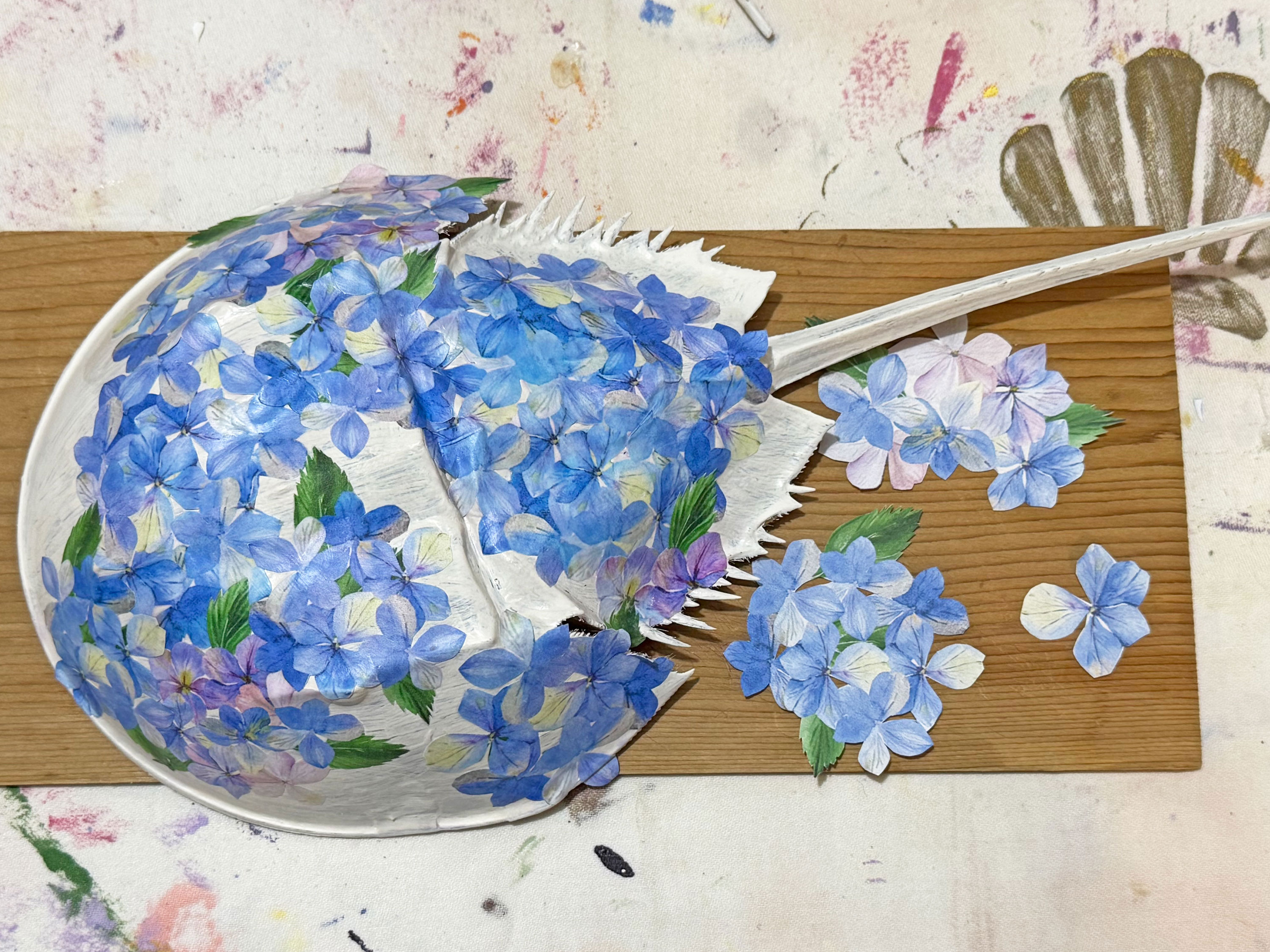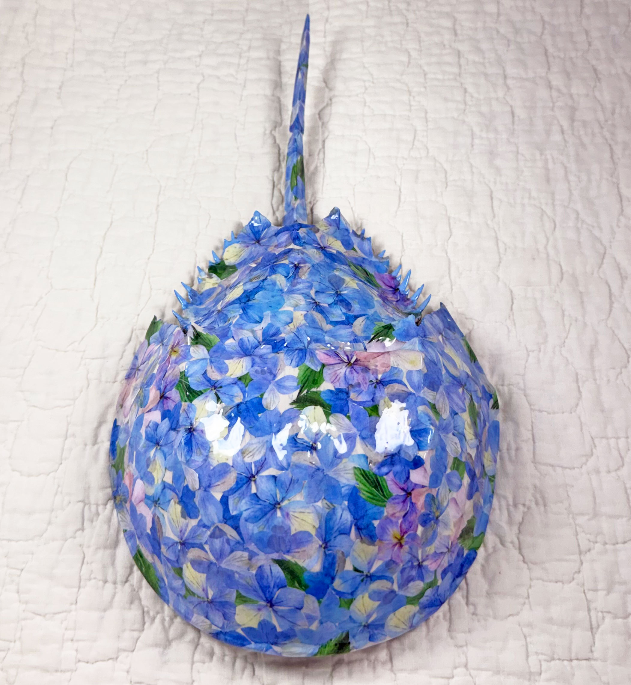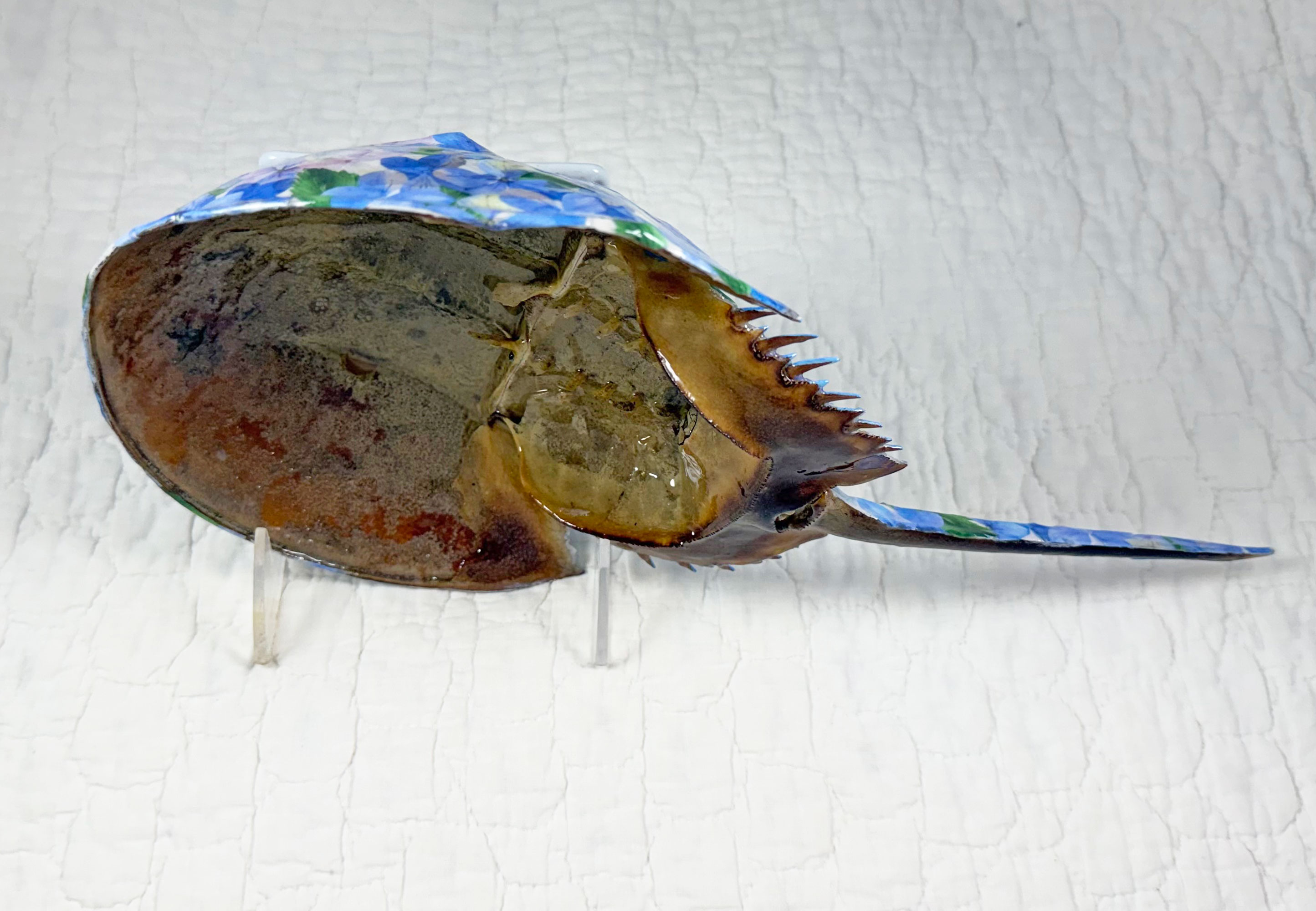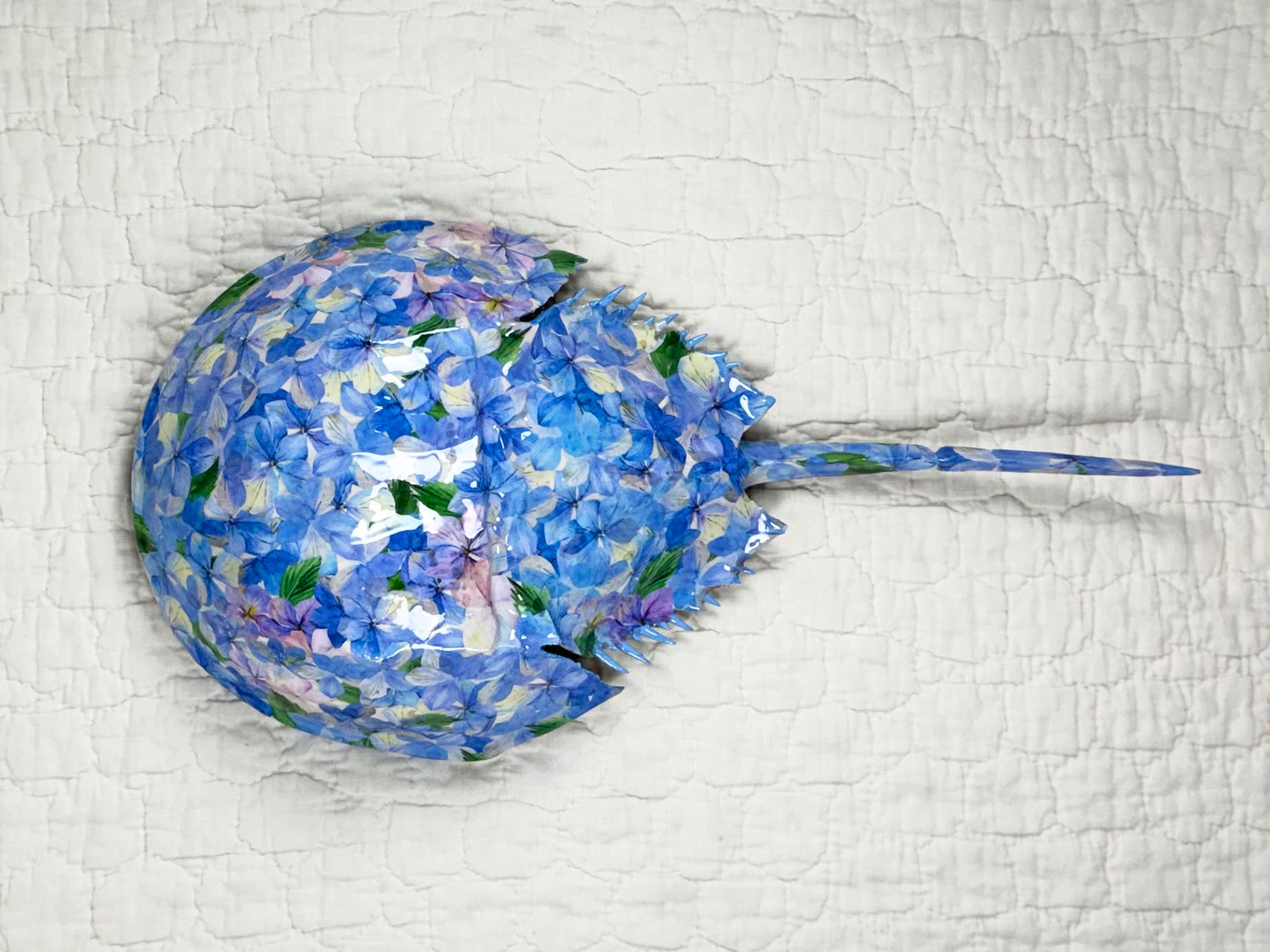 This piece was inspired by a recent trip to Cape Cod, Massachusetts, where the beaches were scattered with naturally molted horseshoe crab shells and classic seaside cottages were surrounded by lush hydrangea gardens. I was fortunate to bring home three ethically collected shells, and this artwork was created from one of them.