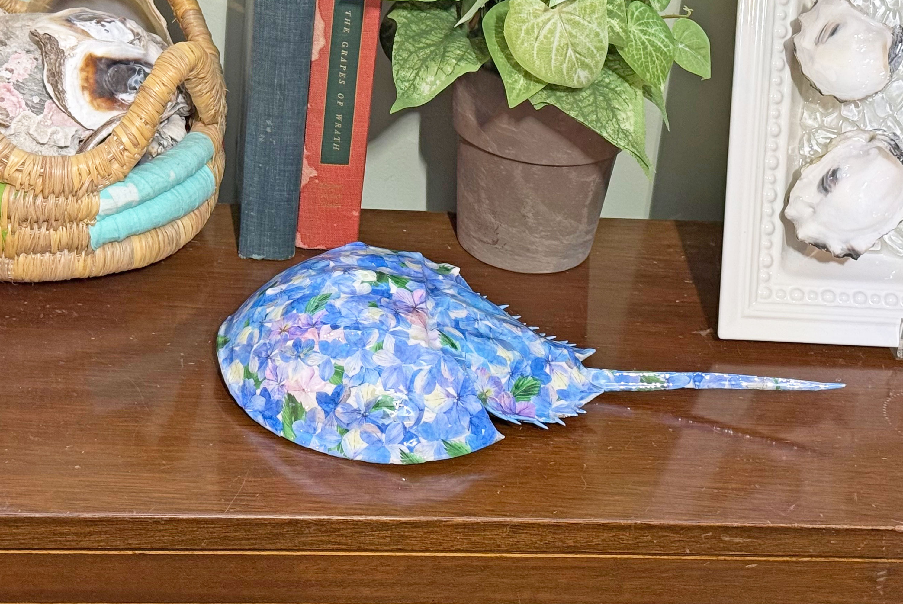 Designed as a table top piece, shelf accent, or mantle display, this hydrangea horseshoe crab shell makes a striking accent for coastal homes and beach cottages, and a thoughtful gift for ocean, nature, and beach lovers.