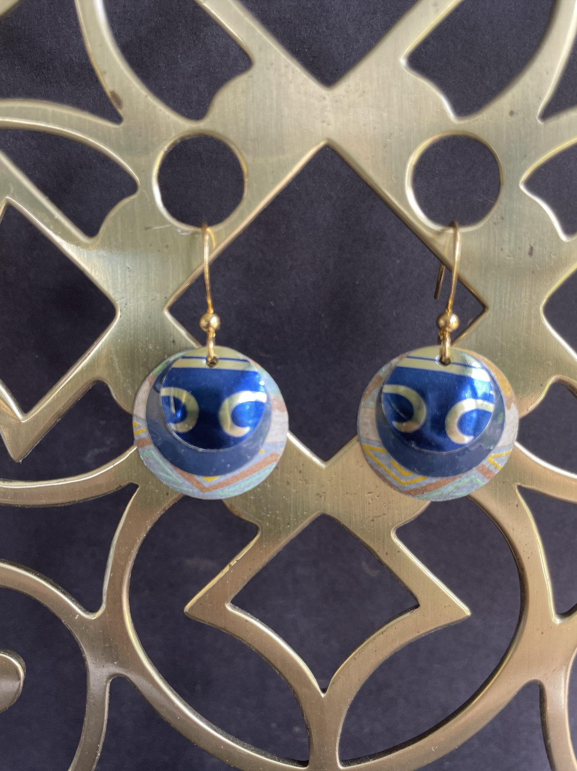 My original idea for making earrings out of tin was to do just this: nest several concave circles in one another. These specific nested earrings sport shiny designs that resemble horseshoes on the center piece. These gold plated earrings come with a rubber stopper so they won't fall out of your ears.