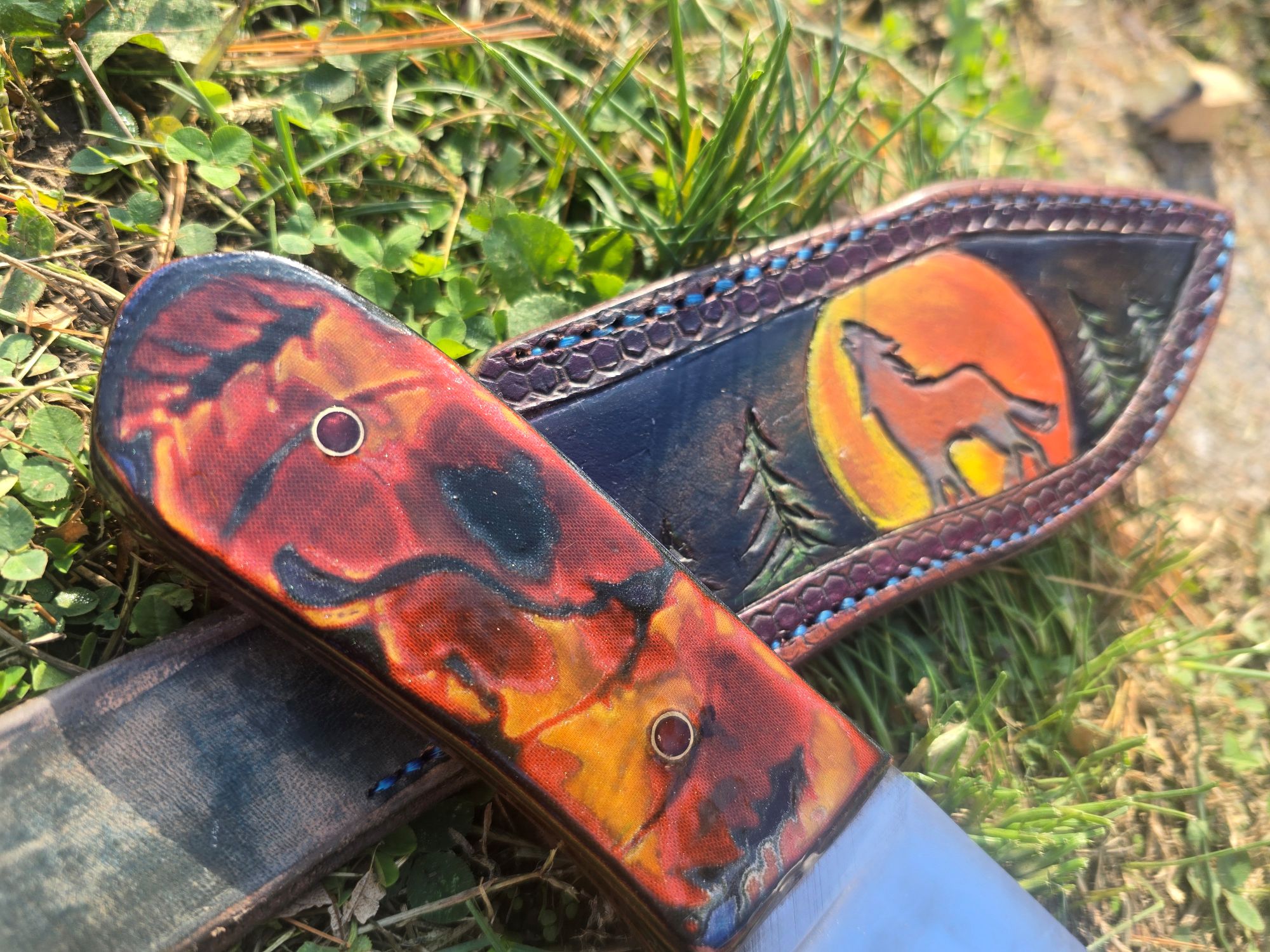 High carbon tool steel blade. The handle is my very own damascus micarta making this a one-of-a-kind useable work of Art. Even though I could recreate these handle scales for sale the colors and pattern itself will be unique. The leather sheath is all handmade. Tooled, dyed, and hand sewn.