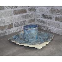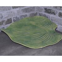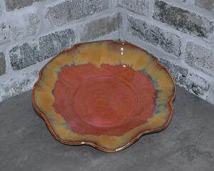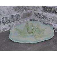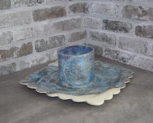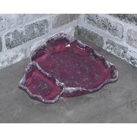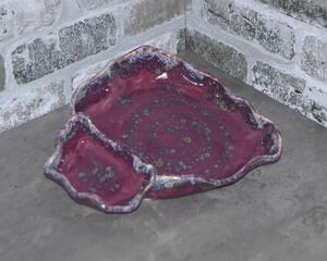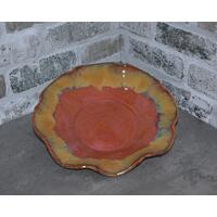 This handmade platter was made from a slab of stoneware clay which was then textured with a hummingbird and flower pattern usineg a wooden rolling pin, and altered by hand to form the fancy edge. After bisque-firing, it was hand-painted with cobalt, copper, manganese and rutile washes and pink and purple underglazes, then overglazed and fired again to cone 6. This stoneware piece is dishwasher, microwave and oven safe.