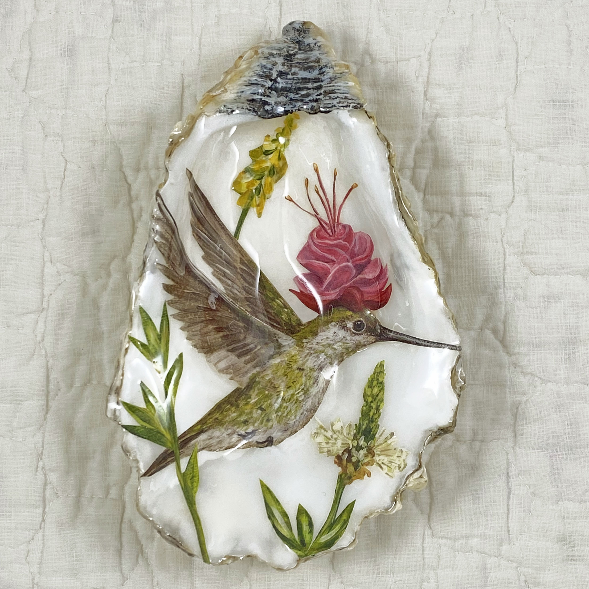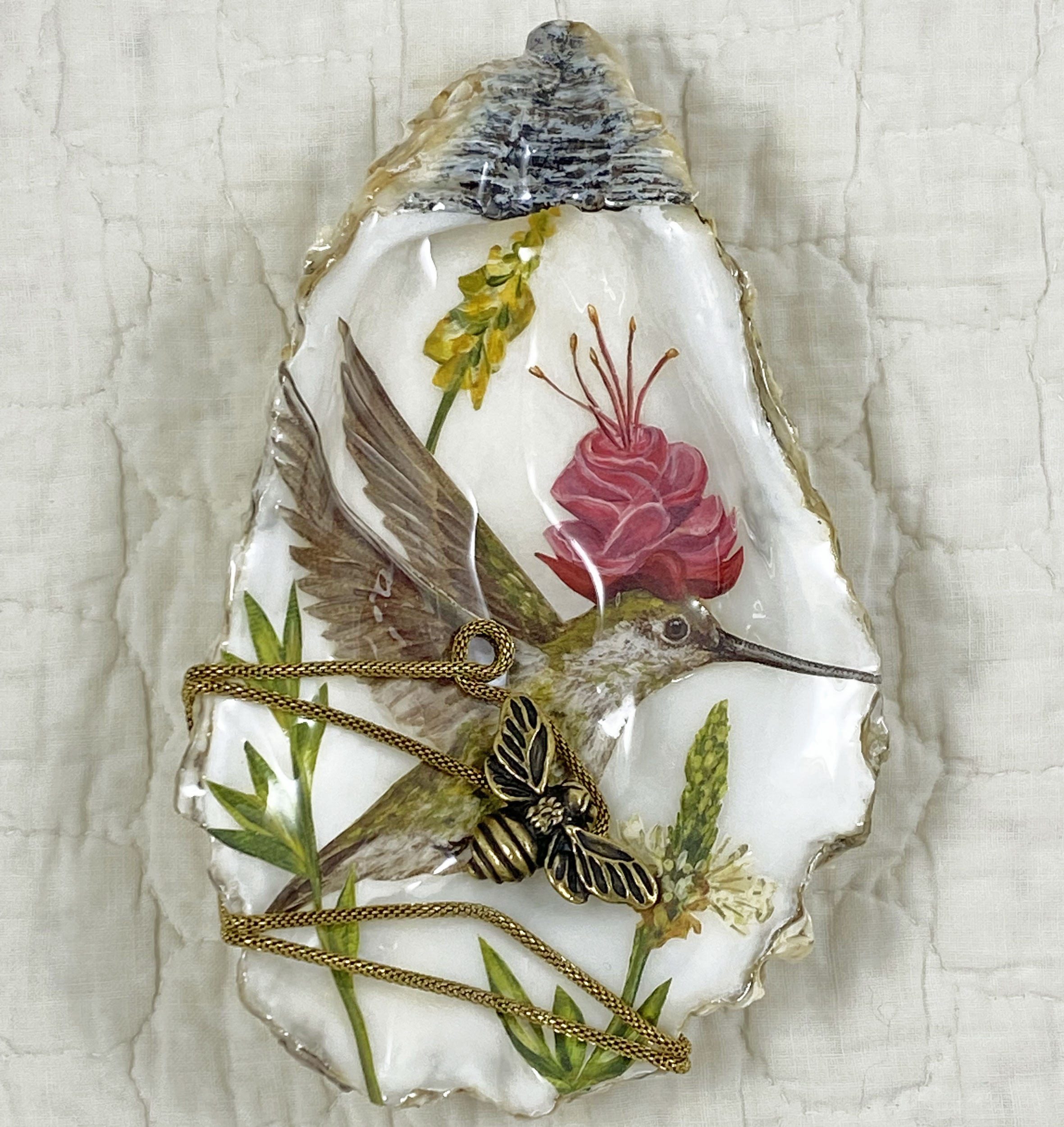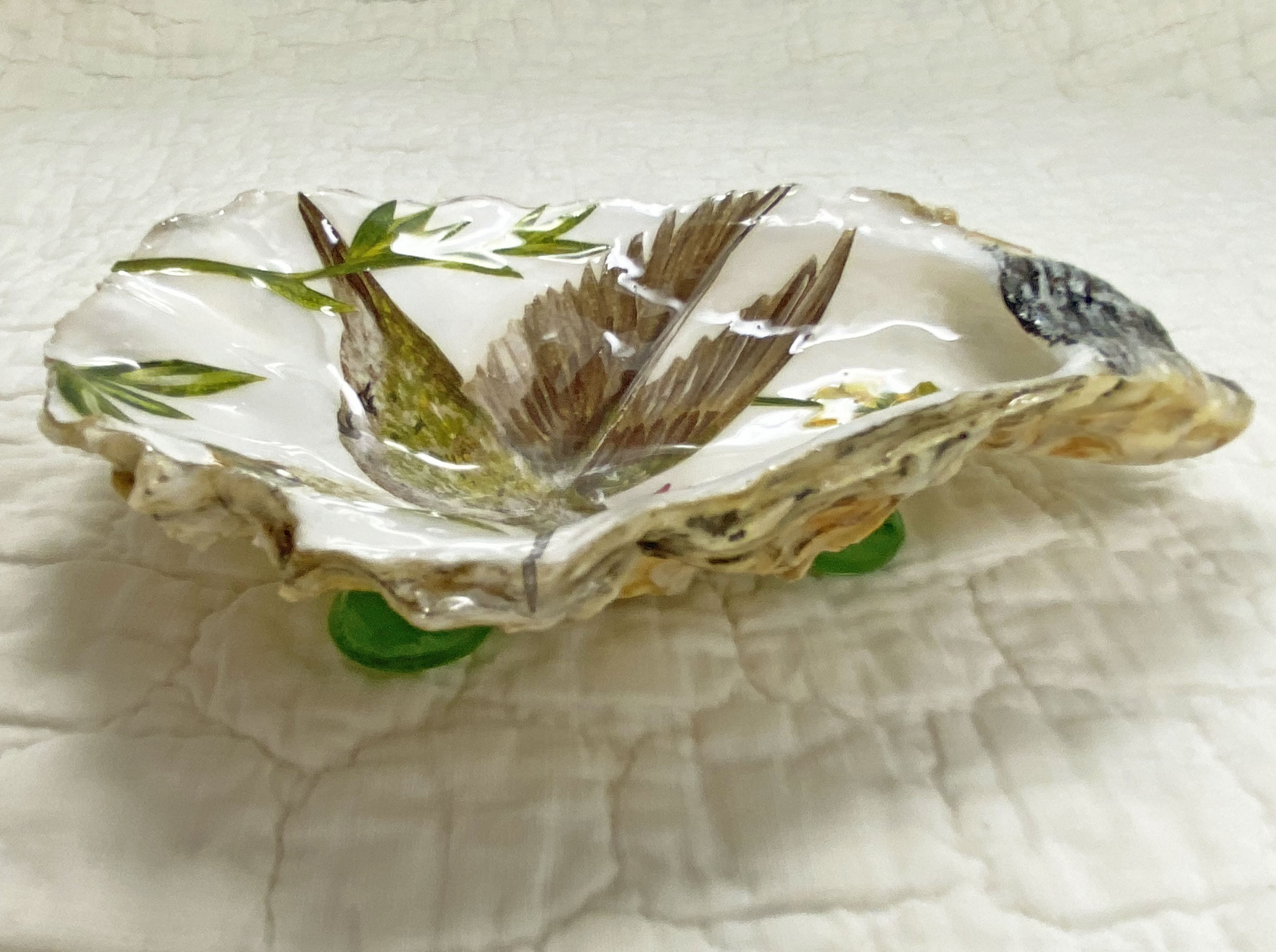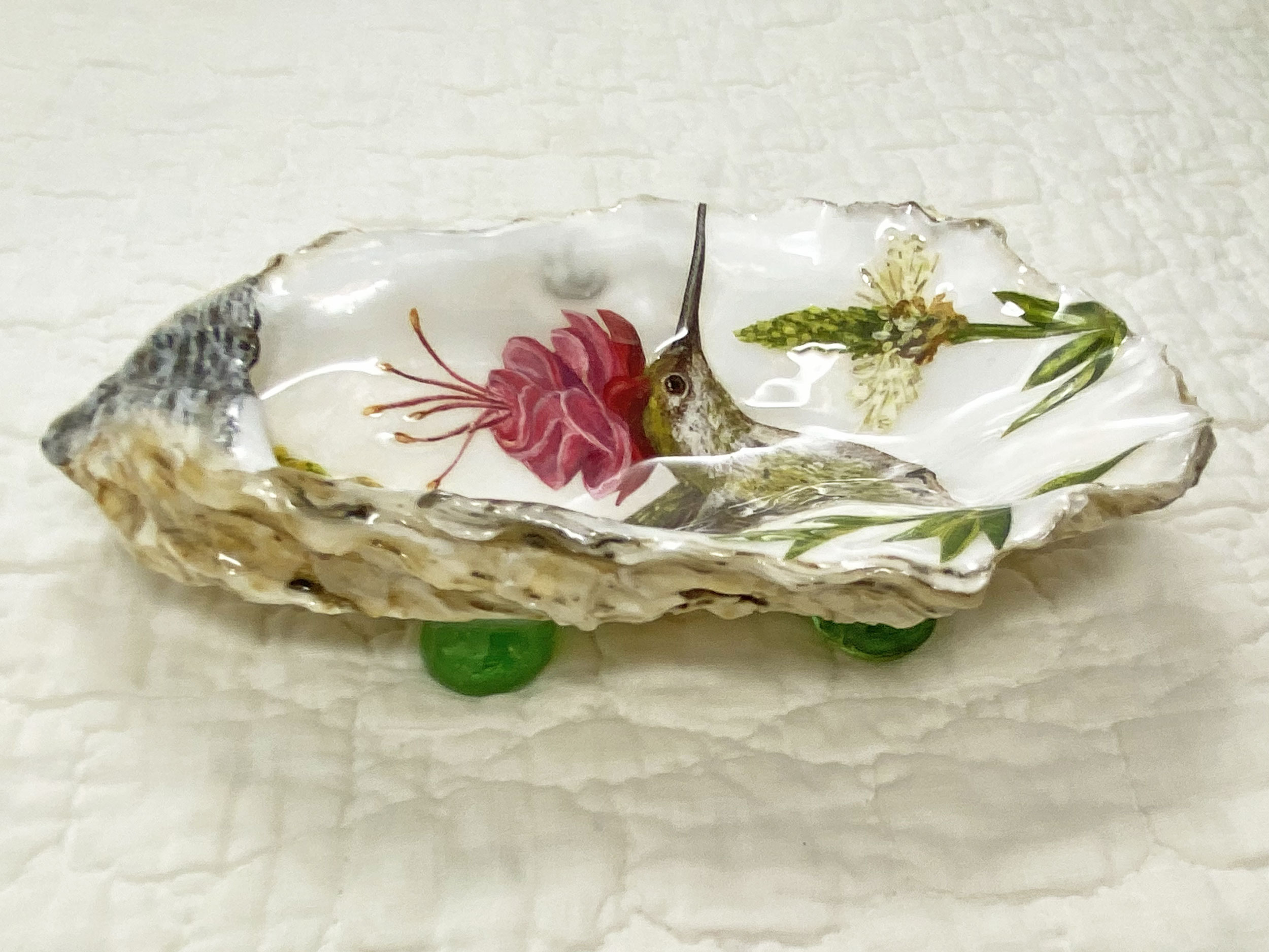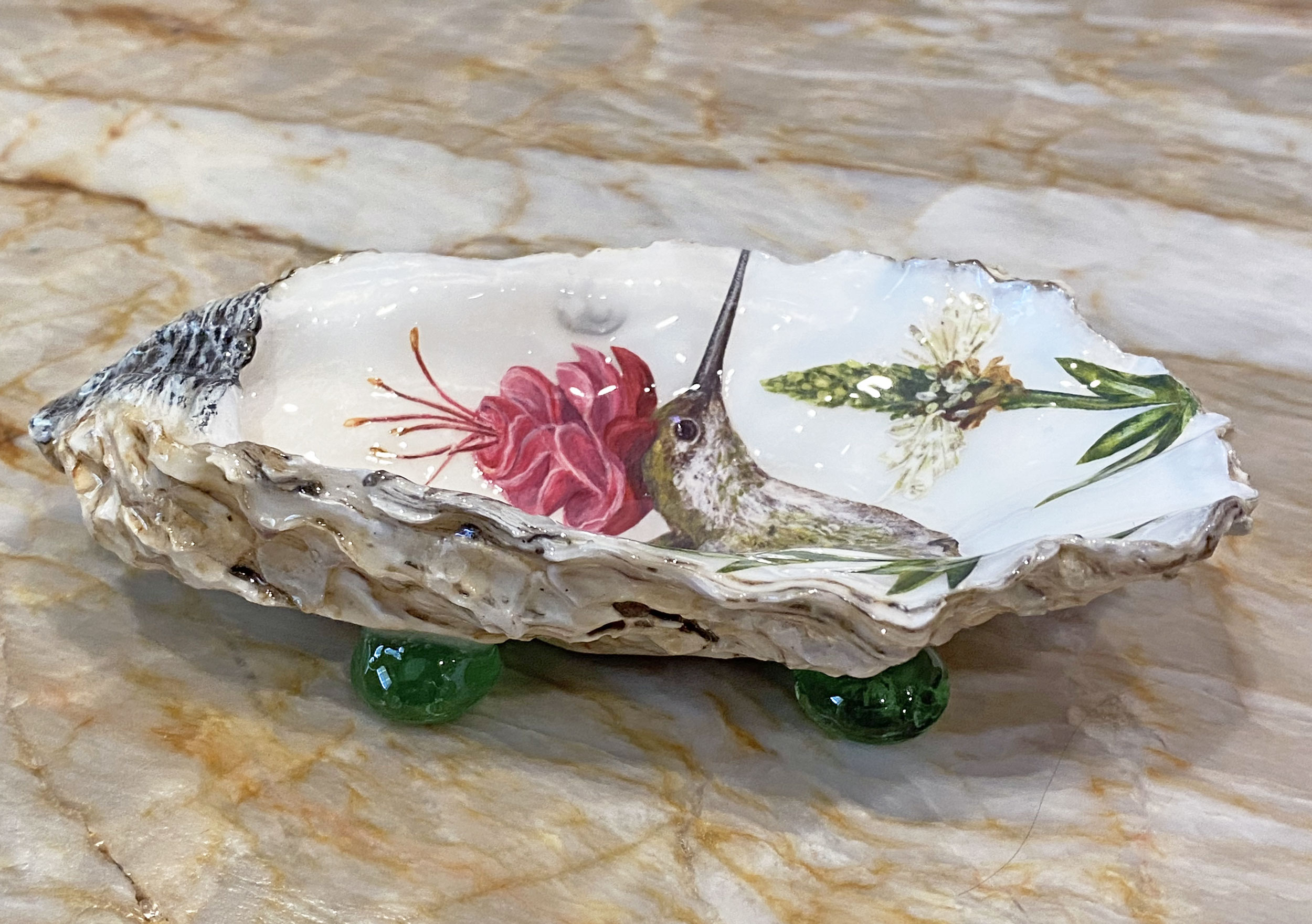 Where Whimsy Meets the Sea. This handmade oyster shell ring dish features a charming decoupaged hummingbird wearing a flower hat. Unlike most decoupage oyster shells, the hummingbird, flowers, and foliage are hand-cut and applied individually directly to the un-painted oyster shell highlighting the shell's natural beauty. Truly a one-of-a-kind jewelry catchall that’s both elegant and playful.