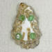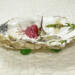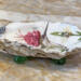 After selecting the right shape oyster shell, it is soaked in a vinegar bath to remove any algae and saltwater buildup from the shell exterior. The shell bottom is ground down to sit properly on the glass pebble feet, and the shell hinge is touched up with black, brown, and white paint. Each decoupage image is hand-cut out and applied to the shell interior one at a time. Unlike most decoupage oyster shells, the shell interior is left unpainted, so the natural shell finish is visible. After applying several coats of resin, to protect the decoupage and enhance the shell's natural colors, the oyster shell ring or trinket dish is complete.