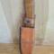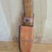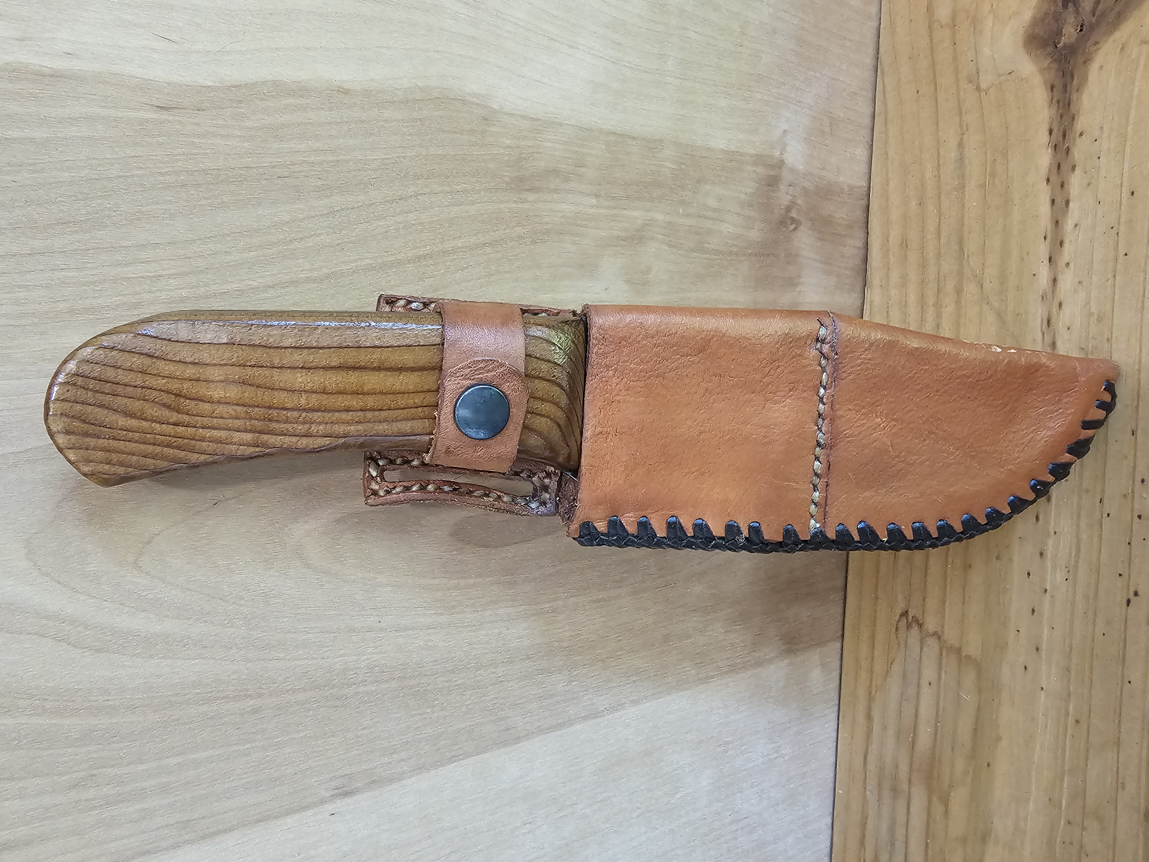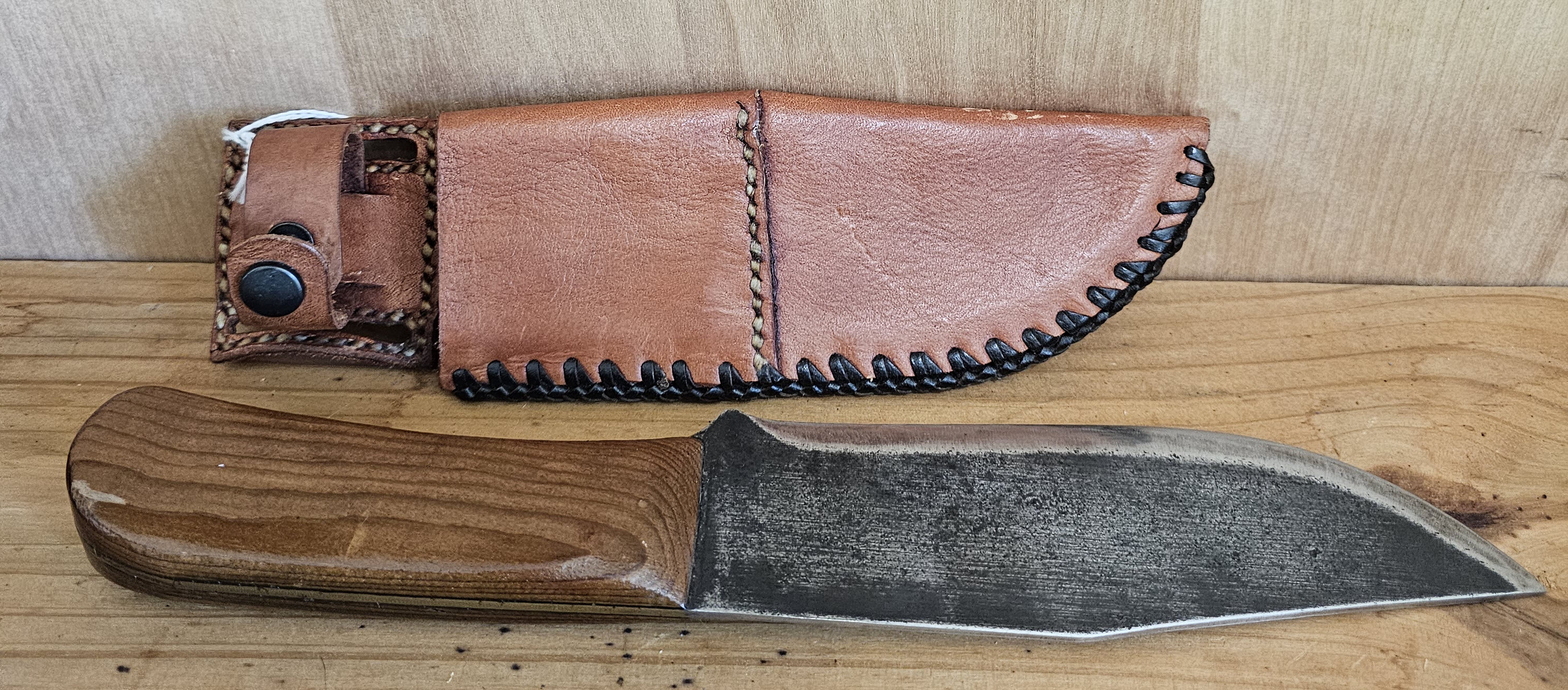 Repurposed Kitchen butcher knife blade into a camping/hunting knife. The handle is wood the sheath is genuine leather.