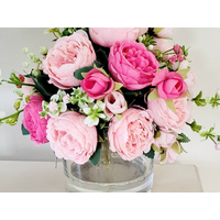 ▪ Silk faux flowers and artificial greenery ▪ Silk faux hydrangeas, driftwood ▪ Glass vase, quality resin faux water