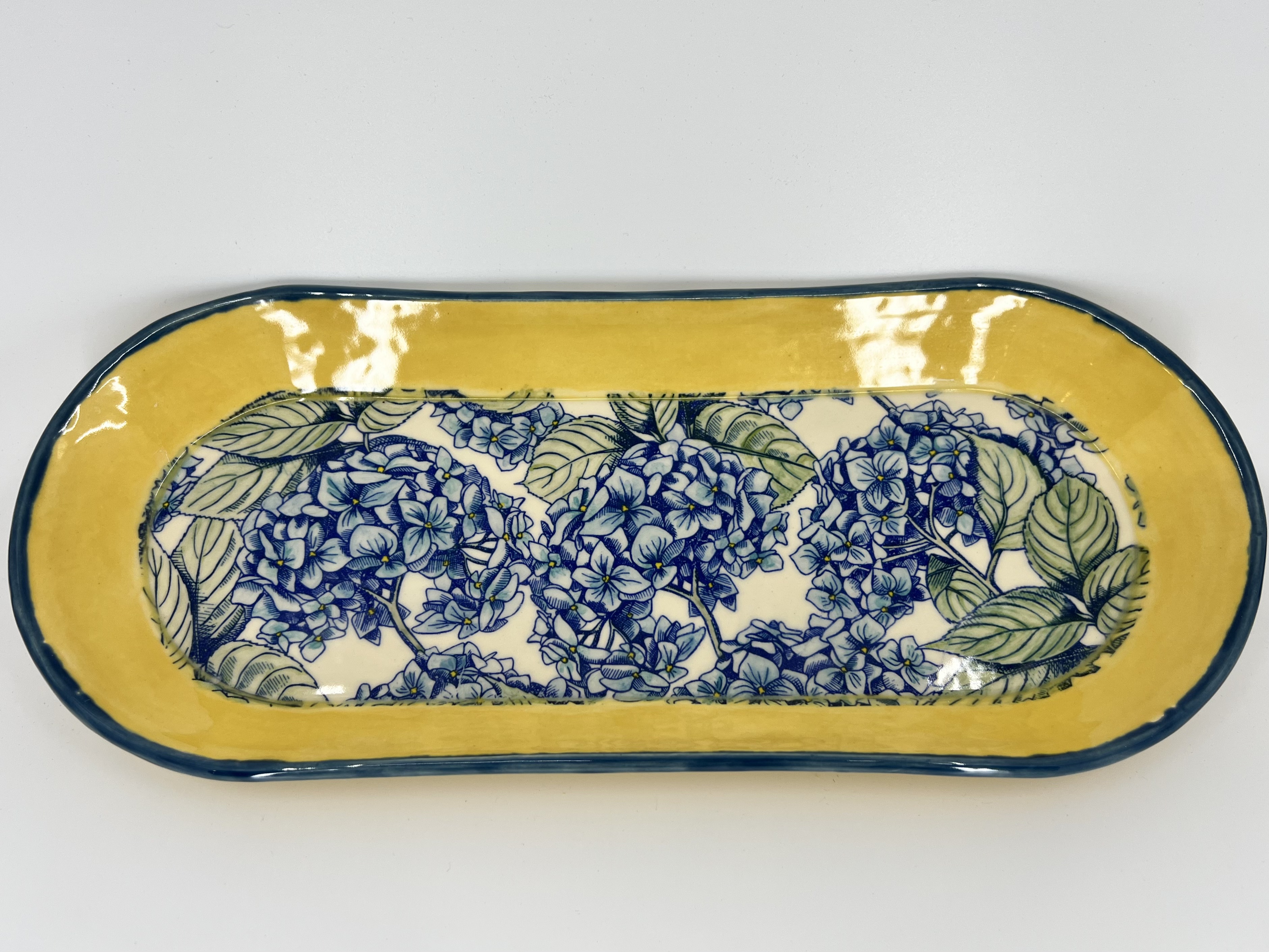 This oblong platter features a blue underglaze print of hydrangeas that have been hand painted. The yellow glaze on the body is accented with blue on the rim.