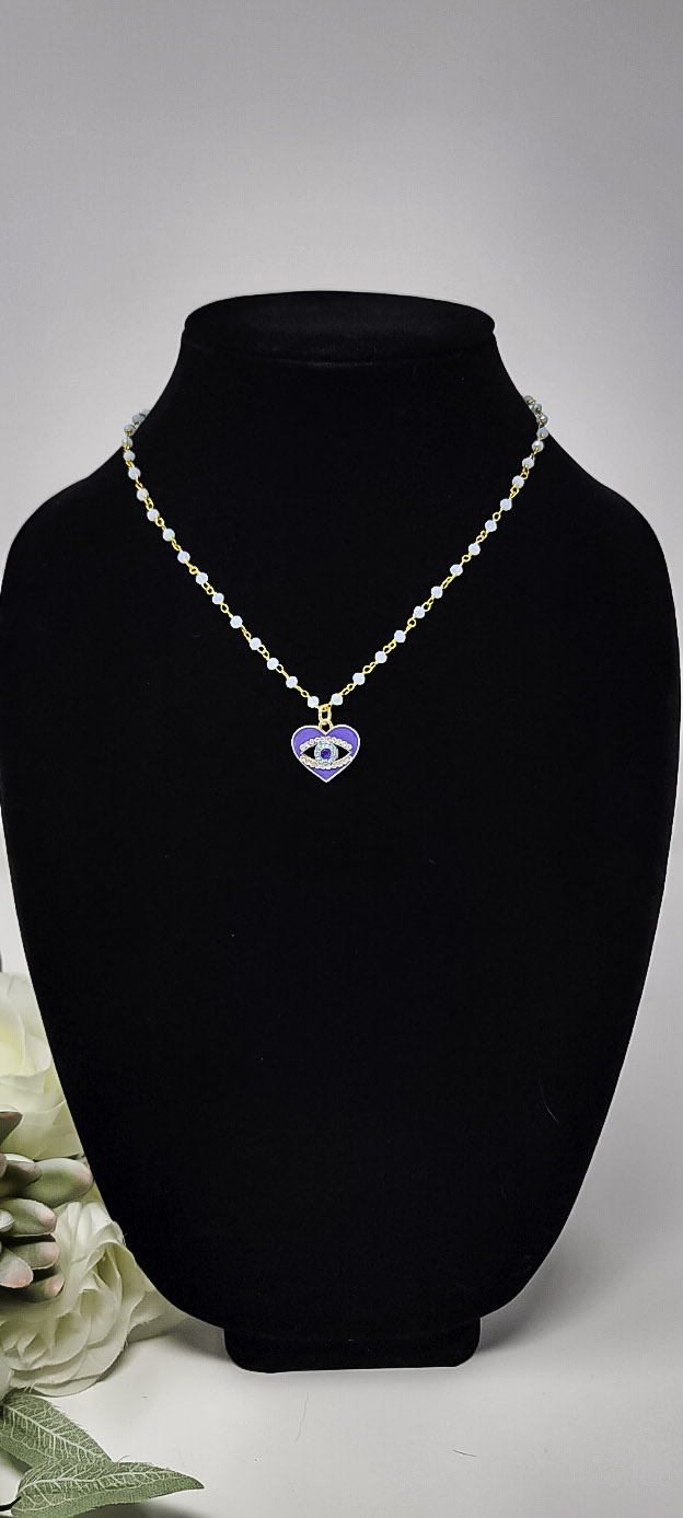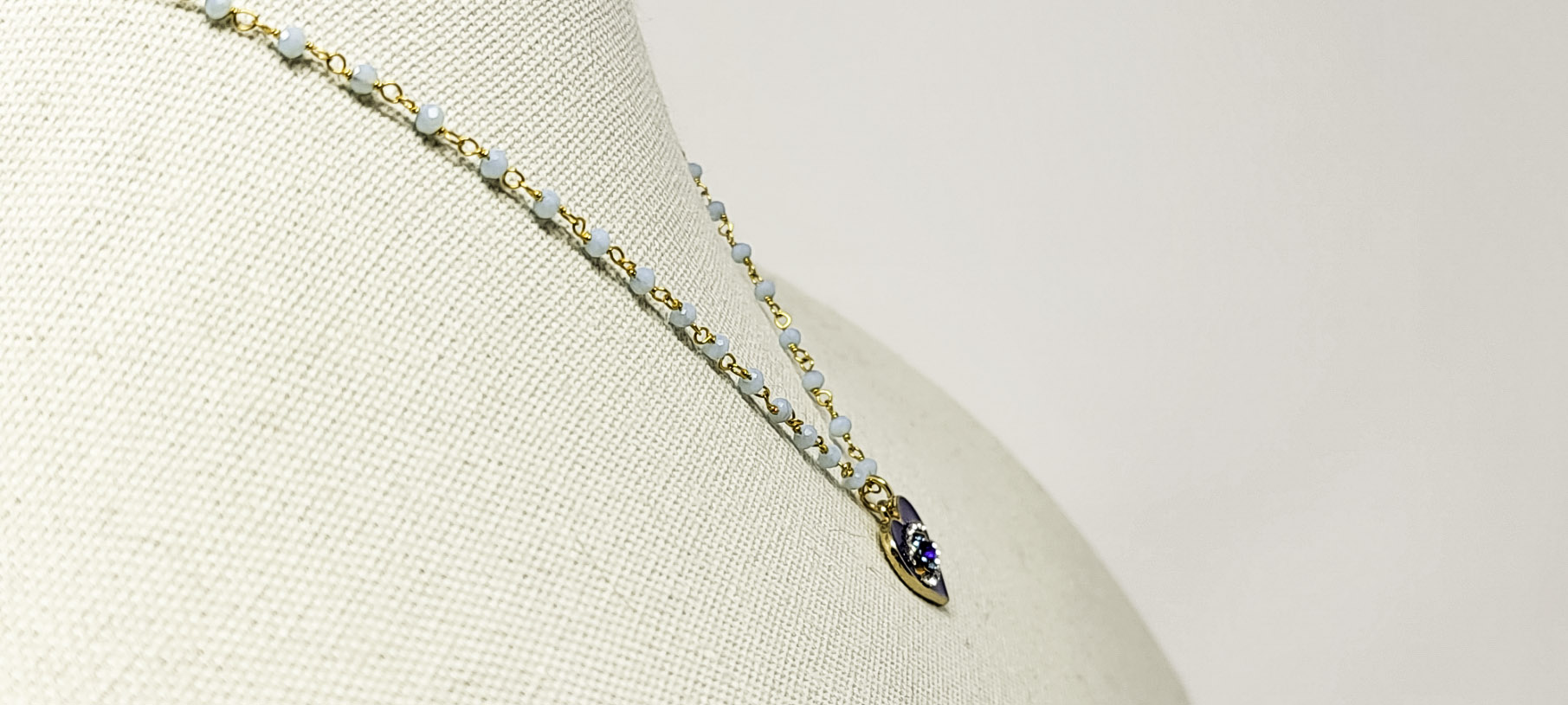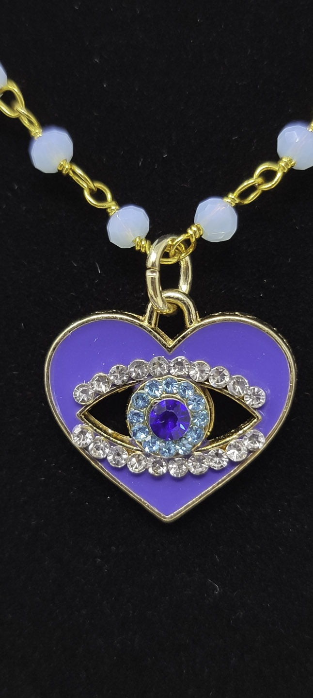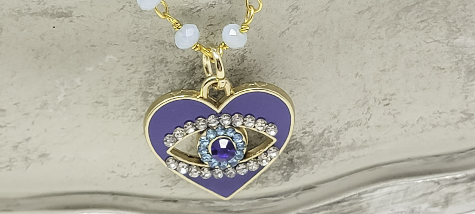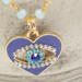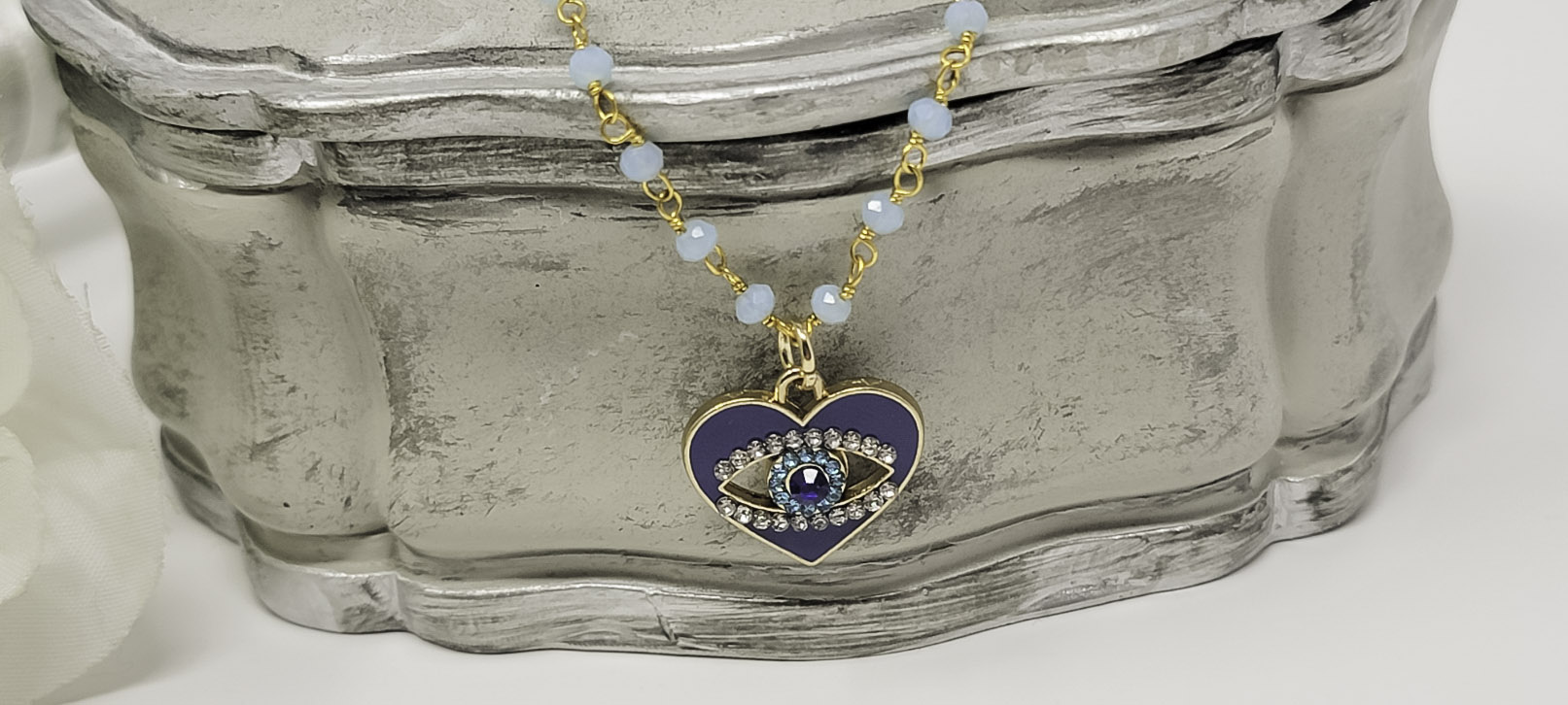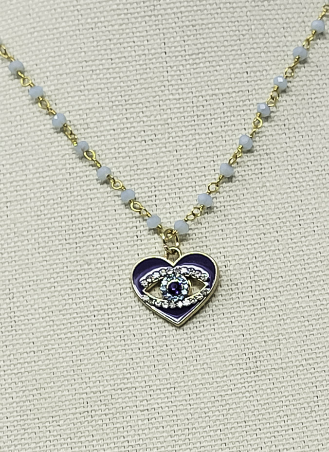 Bring love, luck, and luminous beauty together with this enchanting Hydro Quartz Enamel Heart Rhinestone Evil Eye Necklace. Handcrafted with radiant detail, this necklace features shimmering icy blue hydro quartz gemstones, a glossy enamel heart pendant, and a dazzling evil eye charm accented with sparkling rhinestones for a touch of glamour and protection.
