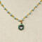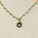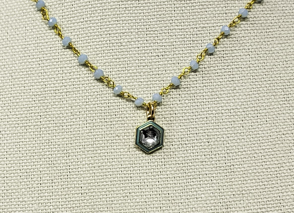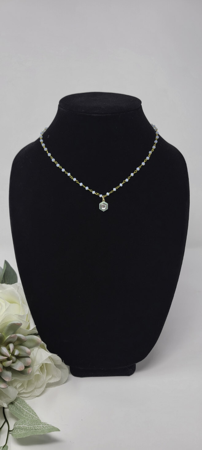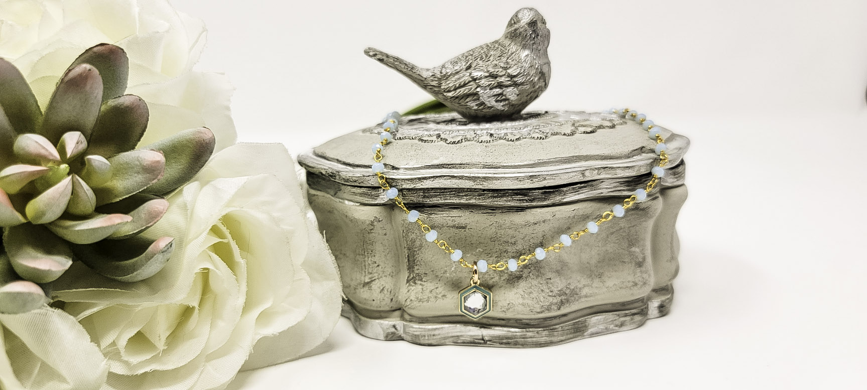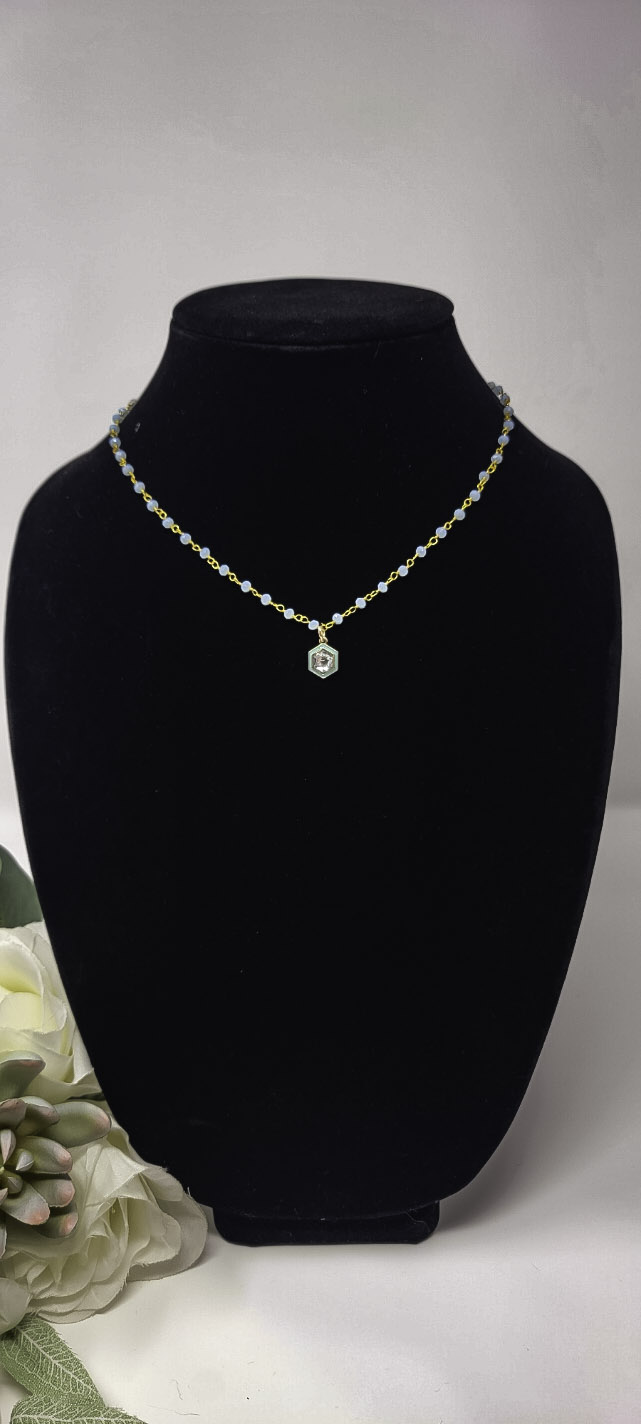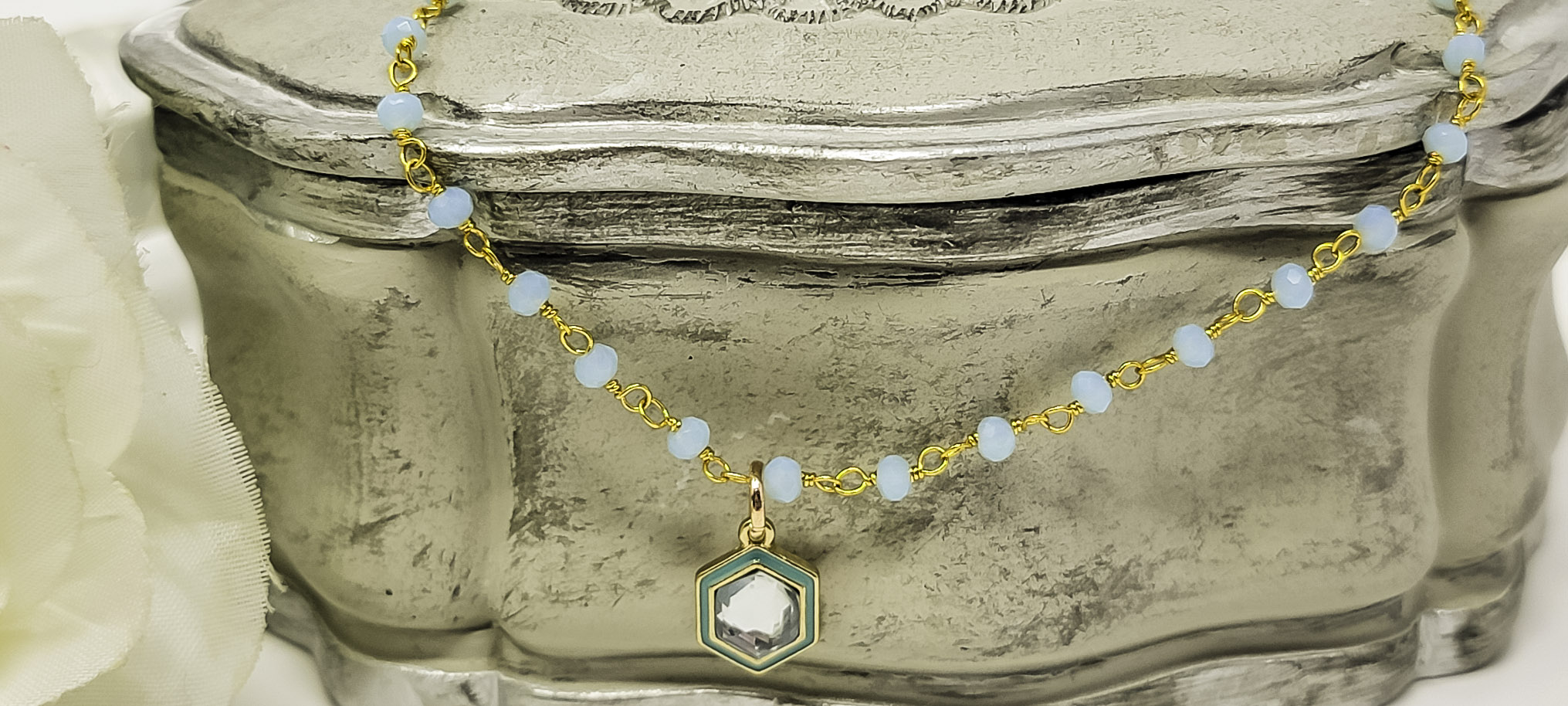 Each stone reflects soft, soothing tones of sky blue and aqua, wire-wrapped in warm gold for a luminous finish. The geometric enamel centerpiece adds a unique artistic flair, making this necklace ideal for both everyday wear and special occasions.