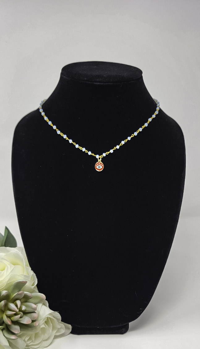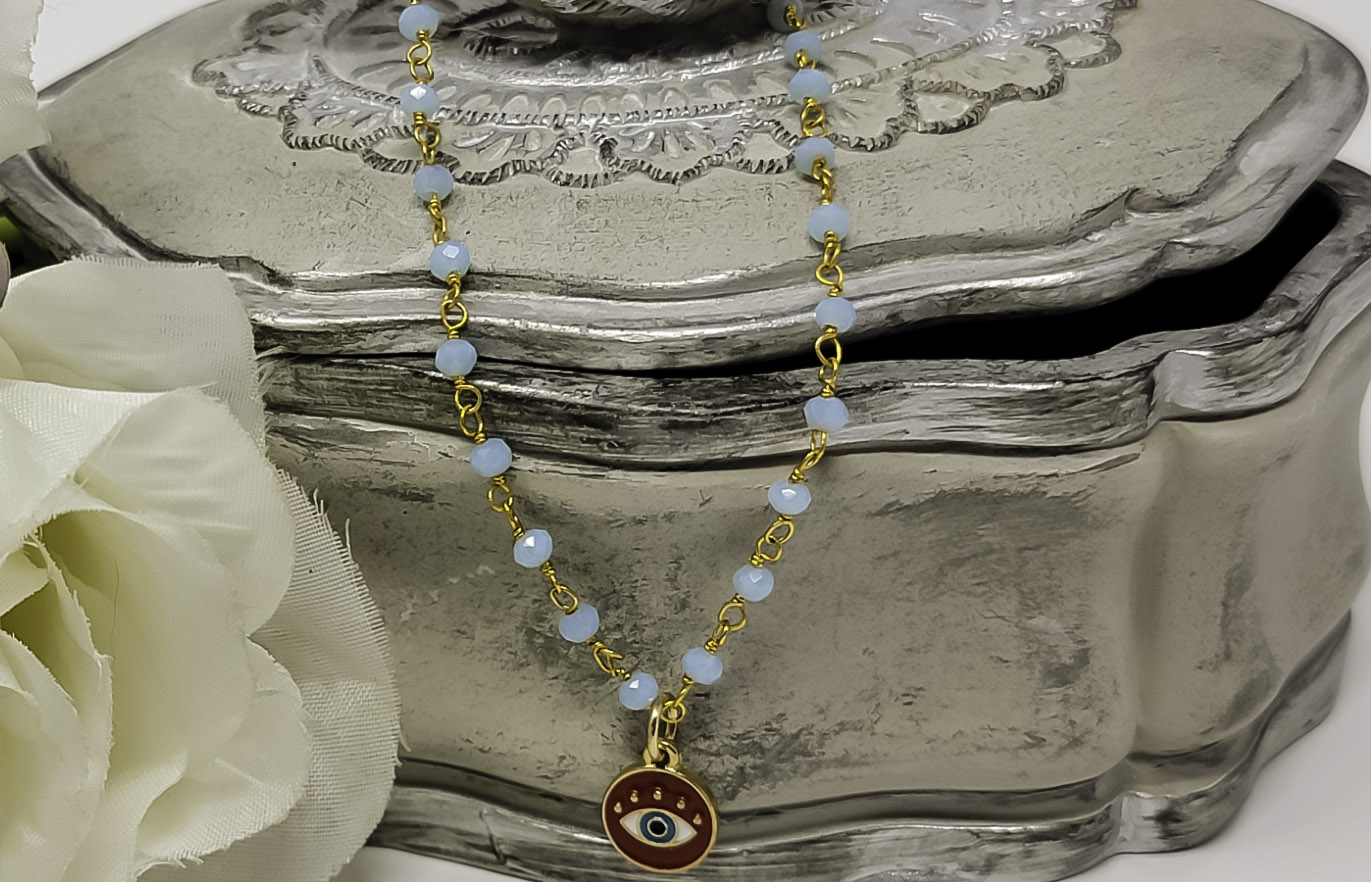 Add a touch of color and protection to your jewelry collection with this stunning Icy Blue Hydro Quartz and Red Enamel Evil Eye Necklace. Handcrafted with care, this captivating piece combines faceted icy blue hydro quartz gemstones with a bold red and turquoise evil eye charm, symbolizing protection, strength, and positive energy.