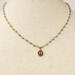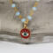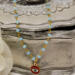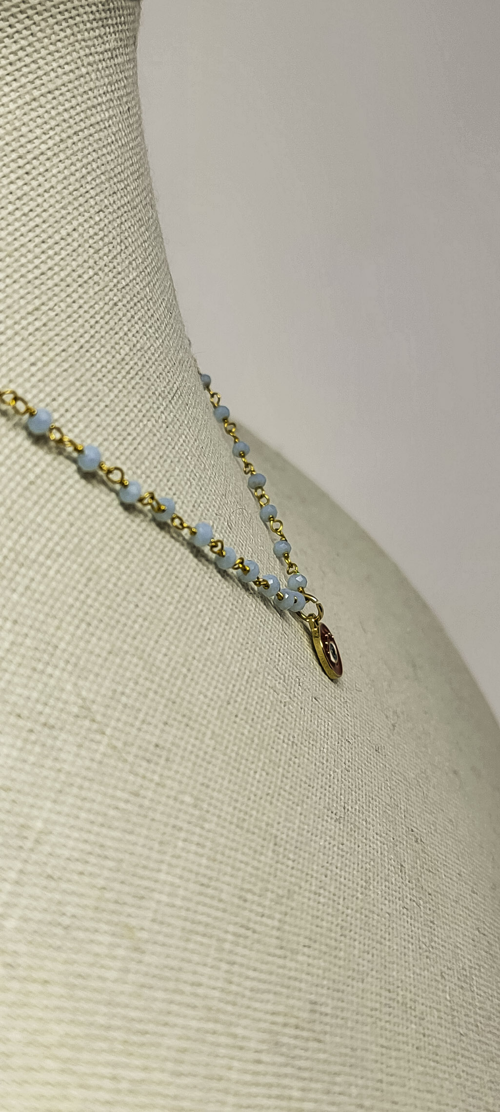The luminous blue quartz beads glisten beautifully in any light, creating an elegant contrast against the vibrant red enamel charm outlined in gold. The design radiates both modern sophistication and timeless spiritual meaning, making it the perfect accessory for everyday wear or special occasions.