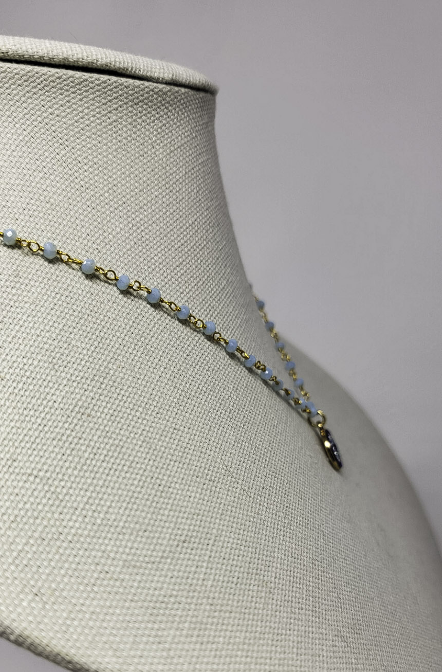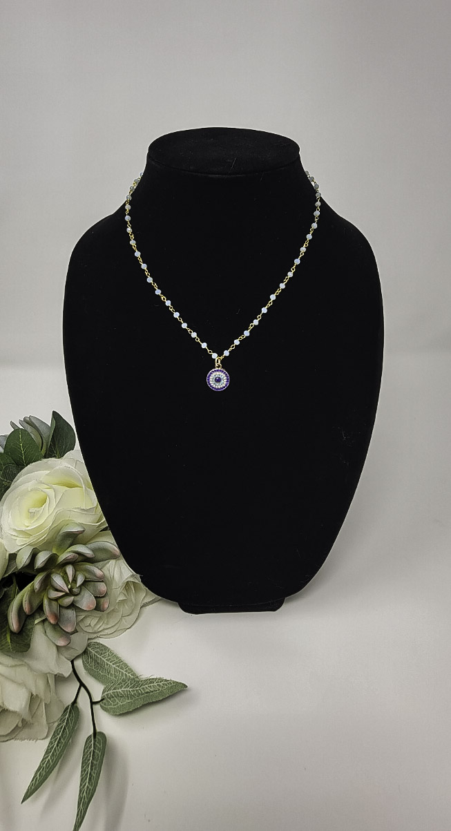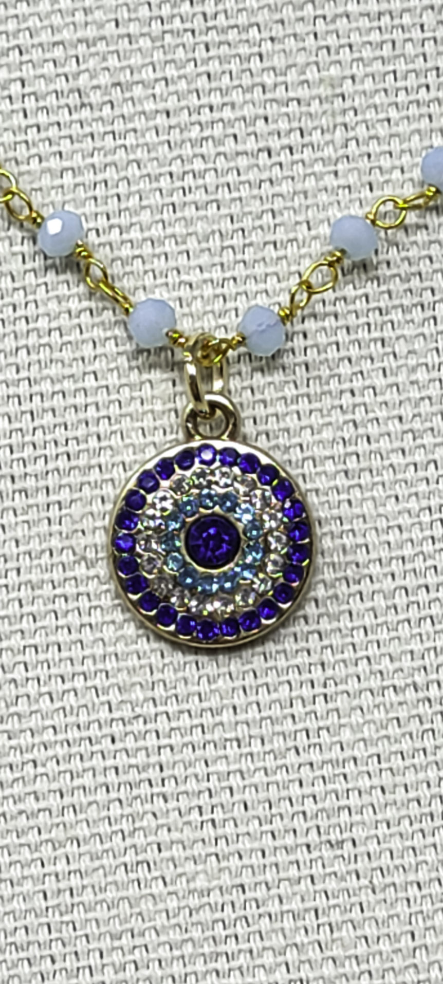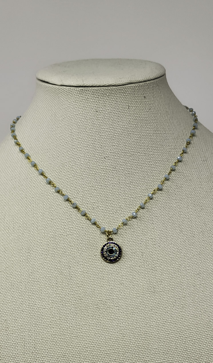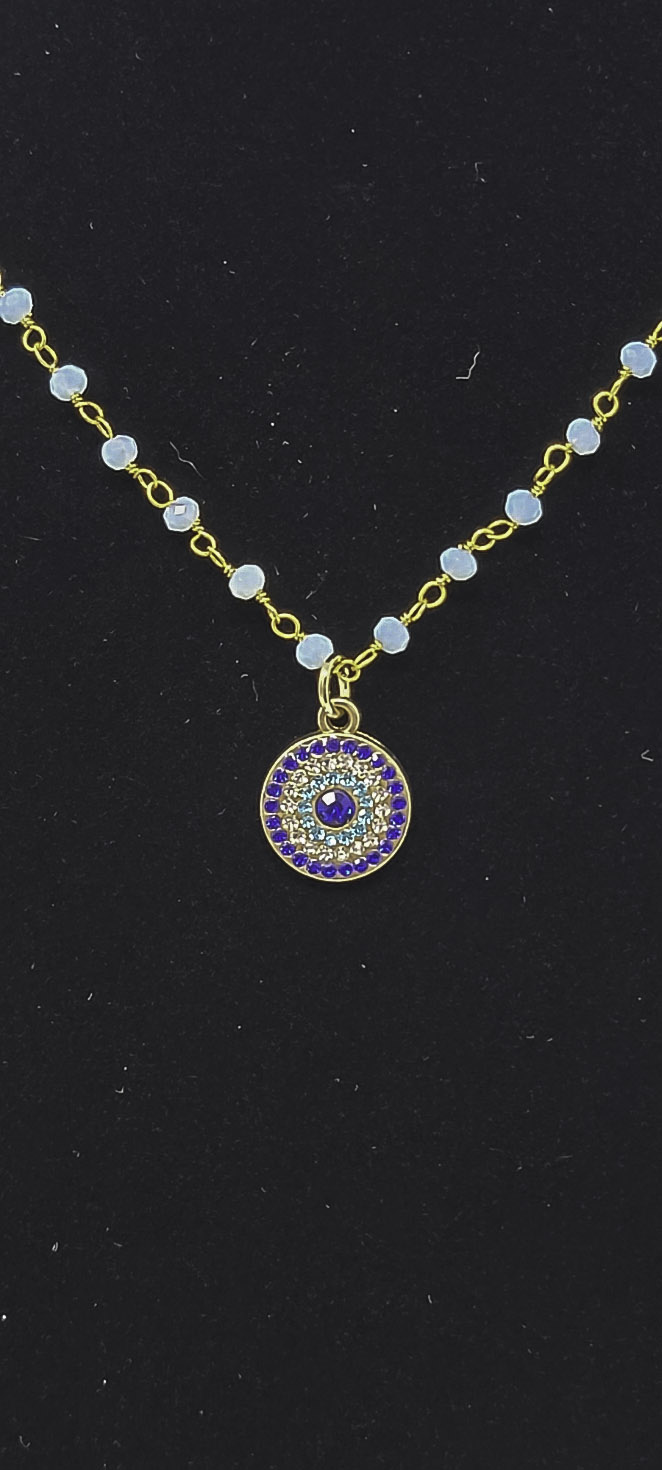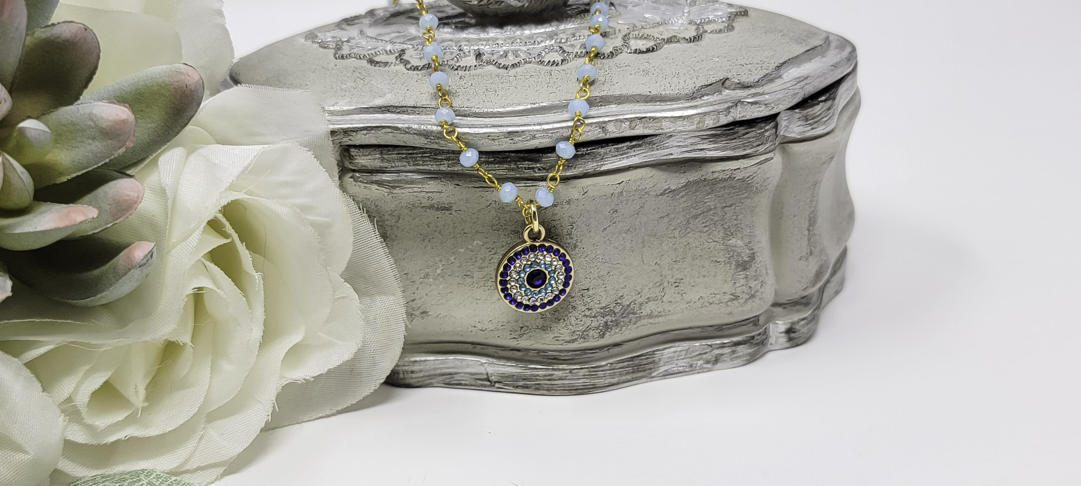 This necklace features a 17-inch length, perfect for versatile styling. The rhinestone evil eye pendant adds a touch of sparkle and protection. The hydro quartz chain complements the pendant beautifully. Ideal for those seeking a stylish yet meaningful accessory.