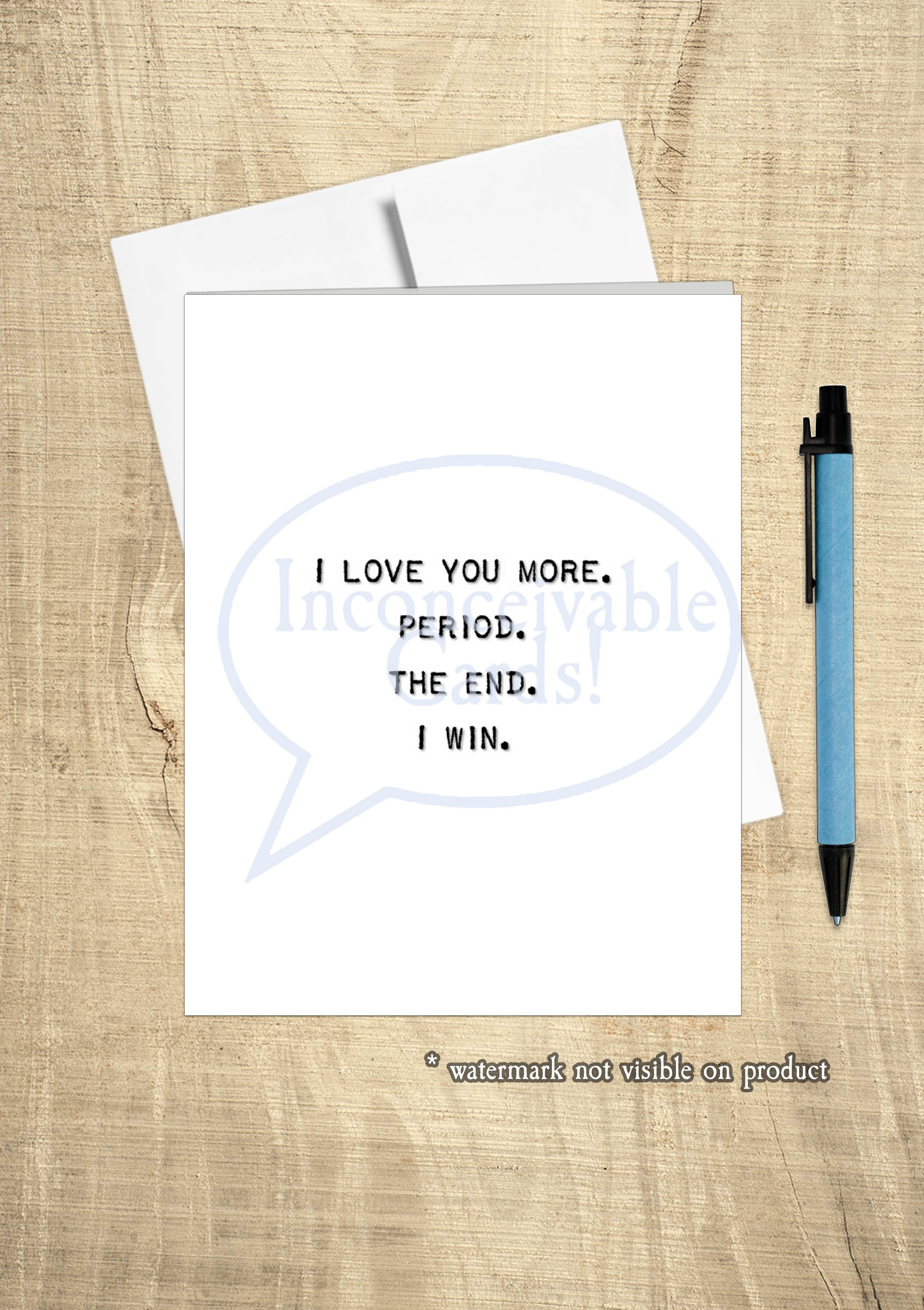 This hilariously blunt love card is for the partner who thinks they love you more — but you’ve got the receipts, the stubbornness, and this card. Great for Valentine's Day, anniversaries, or just flexing your emotional dominance.