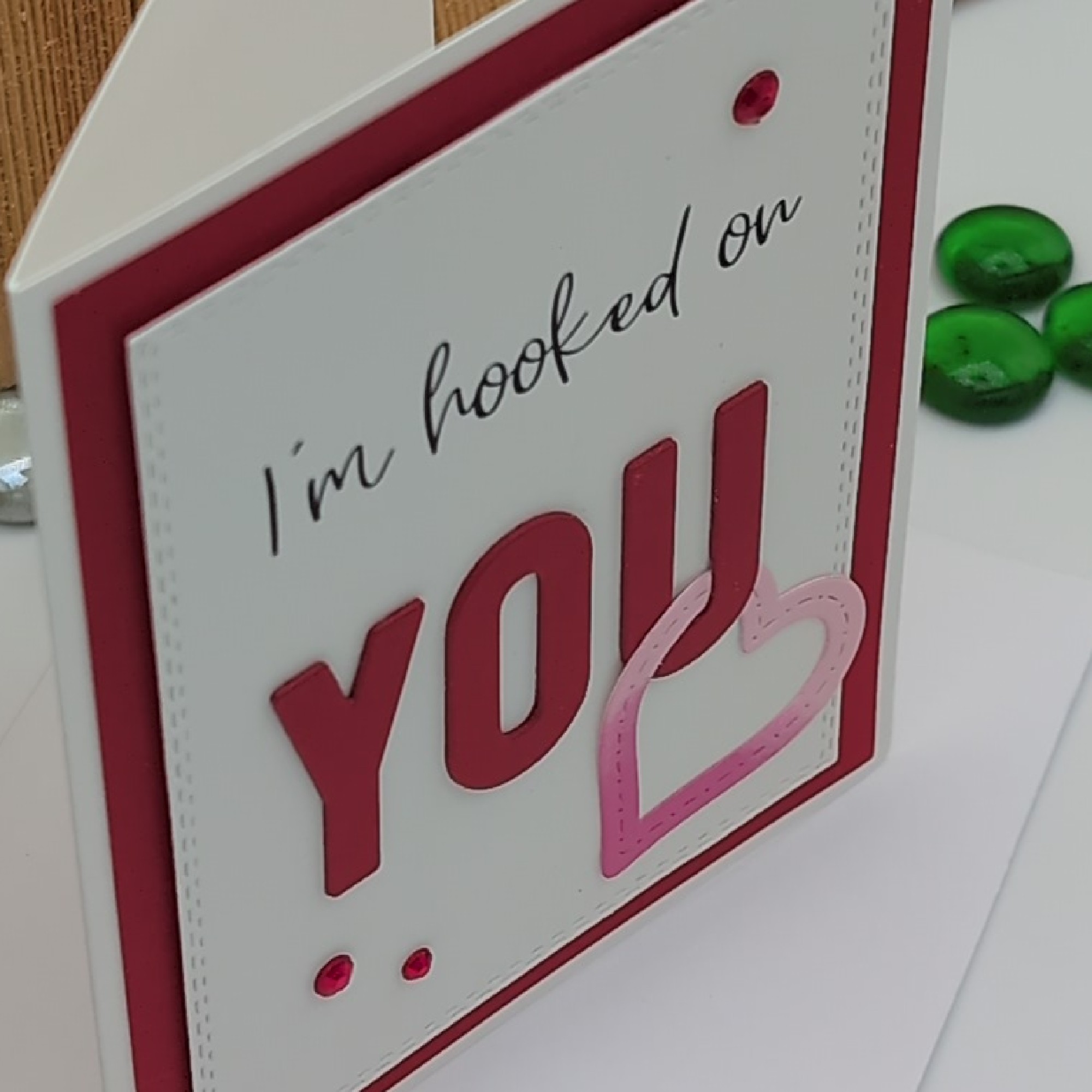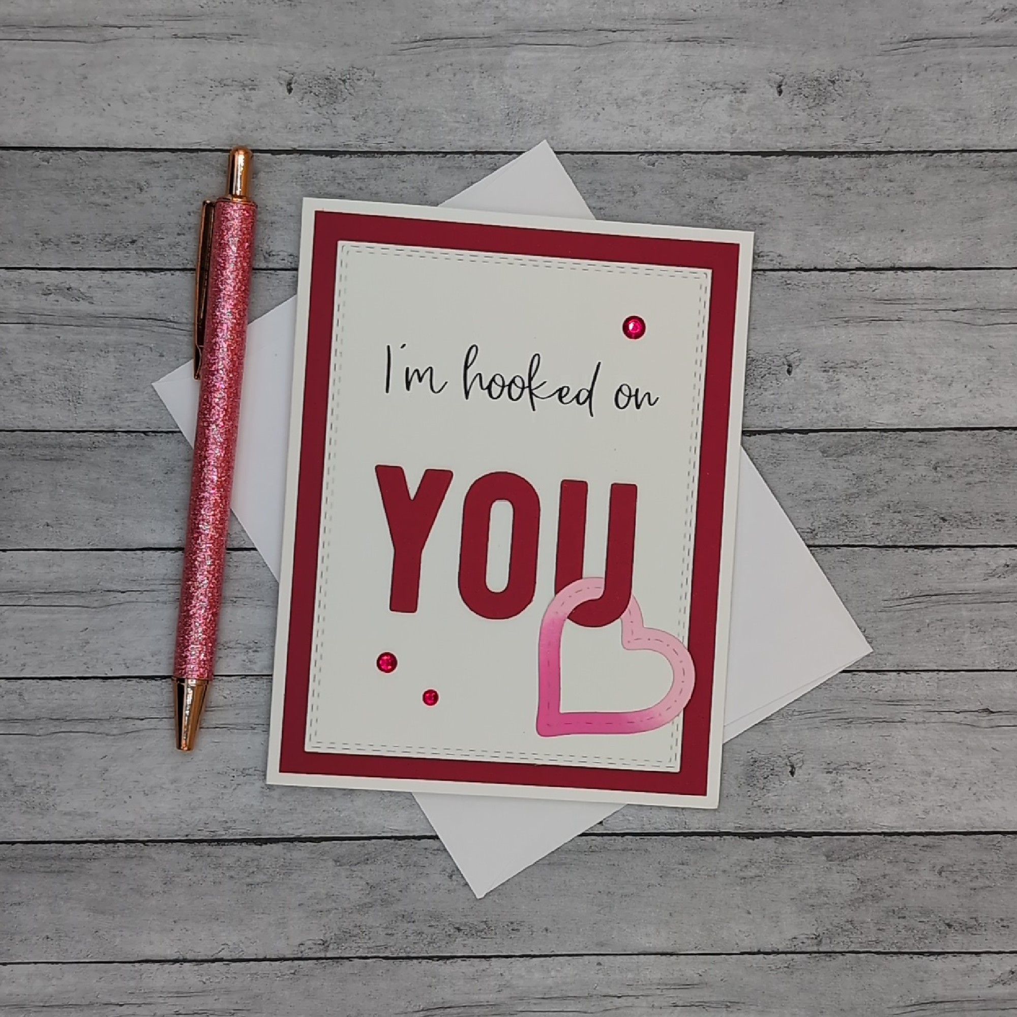 This handcrafted card reels in romance with the playful phrase “I’m hooked on YOU.” Featuring bold red lettering and a heart charm hanging from the “U,” it’s a sweet visual metaphor for love that sticks. With rhinestone embellishments and a blank interior, it’s perfect for Valentine’s Day, anniversaries, or spontaneous love notes. A flirty, heartfelt keepsake for the one who has your heart.