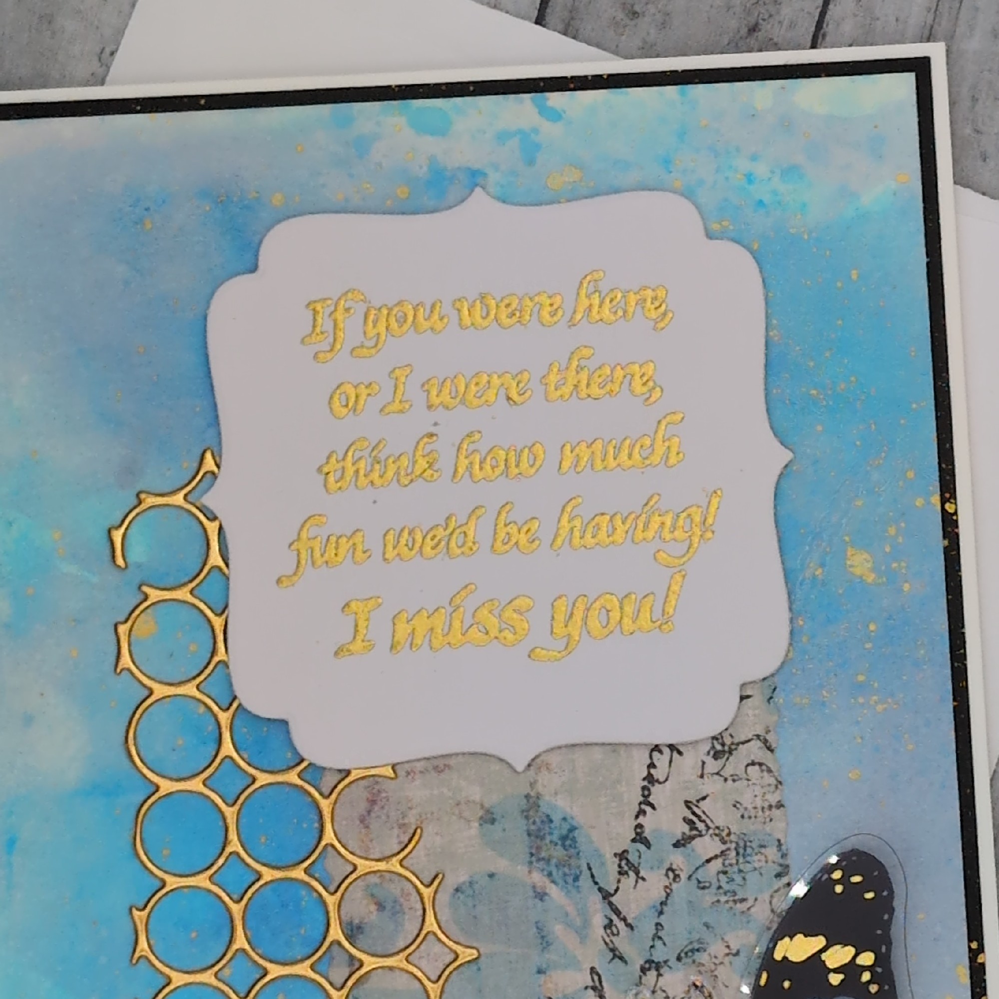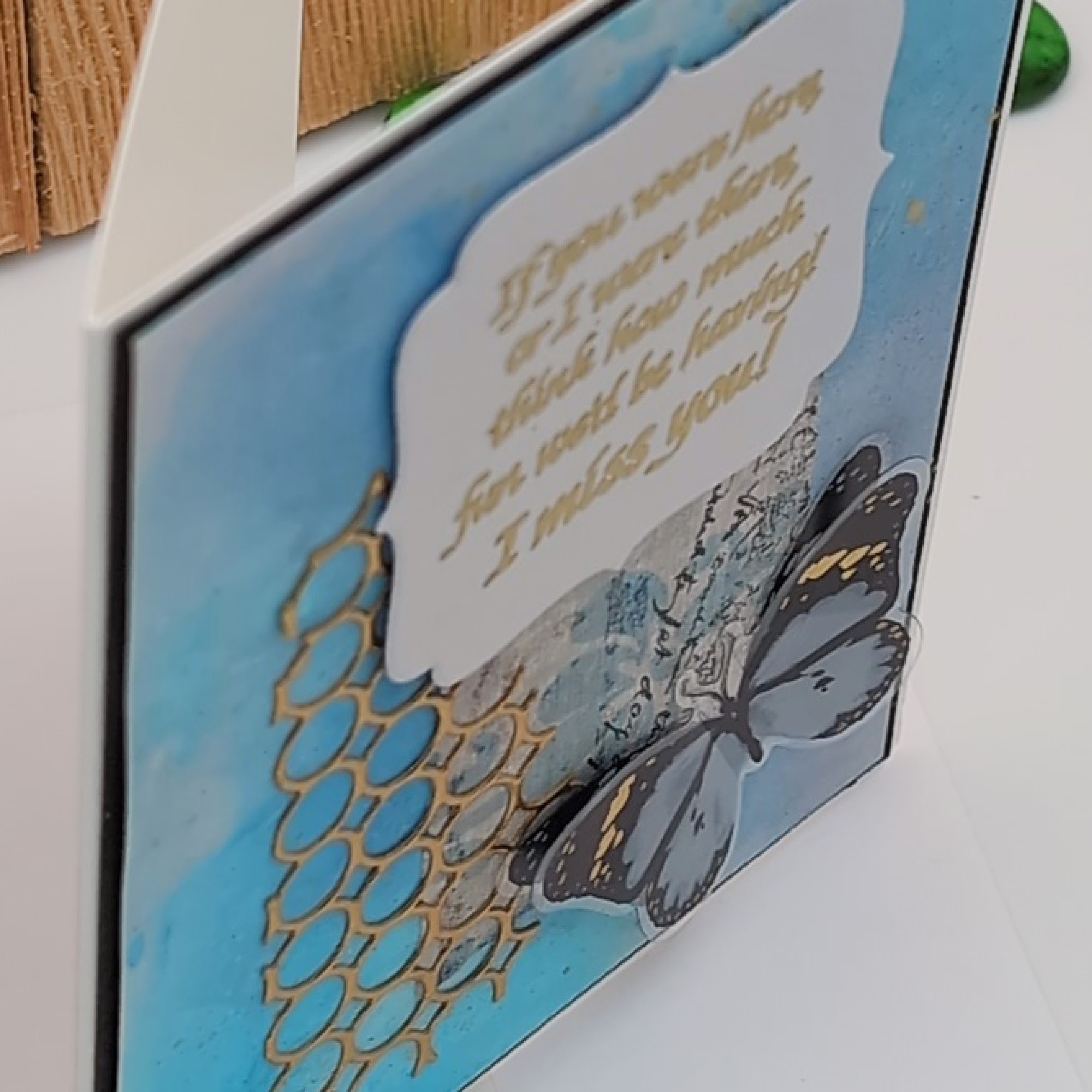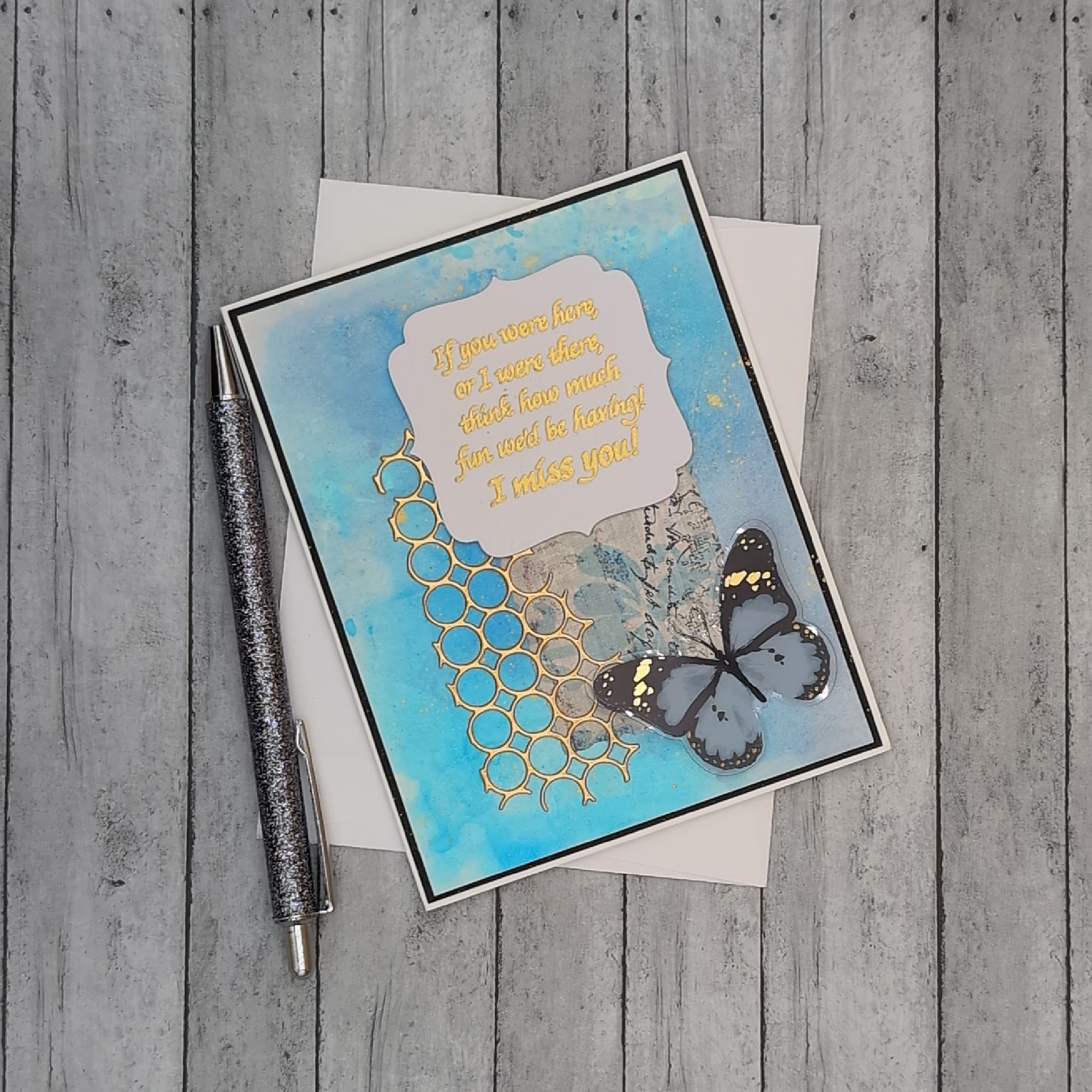 This handmade card captures the joy of connection and the ache of distance. The front reads, “If you were here, or I were there, think how much fun we'd be having! I miss you!” — set against a blue watercolor-style background with butterfly art and gold honeycomb accents. Blank inside for your personal message, it’s perfect for long-distance friendships, family, or anyone you’re missing. A painterly, heartfelt way to stay close even when apart.