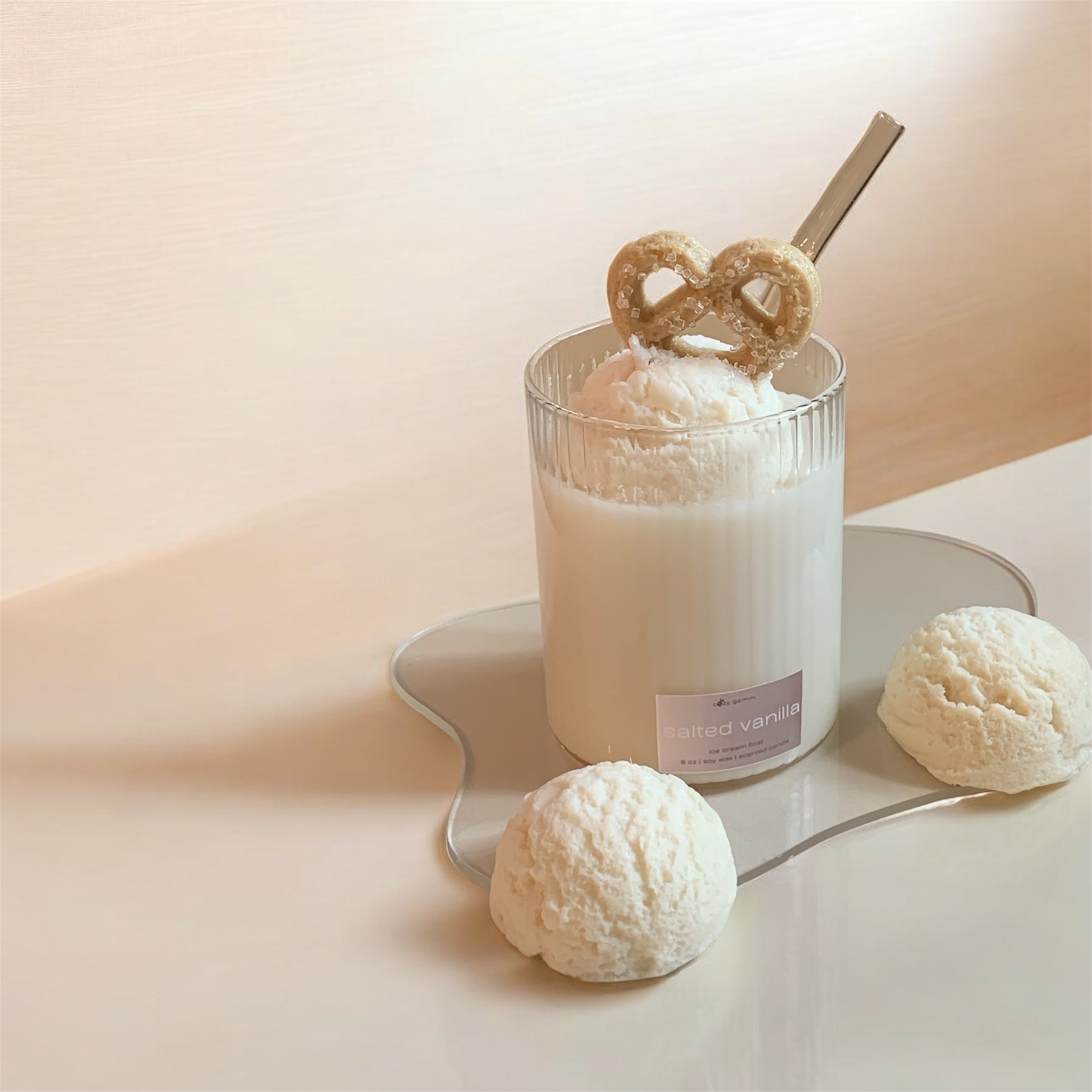 Light up some sweet moments! Our Ice Cream Float Candle Collection is aesthetic, highly fragrant, all the good feels in a jar, blending your love for ice cream with the cozy ambiance of a candle. Each one is hand-poured with 100% soy wax, a clean cotton wick, and topped with the cutest little wax ice cream scoop that looks just like the real deal (minus the brain freeze).