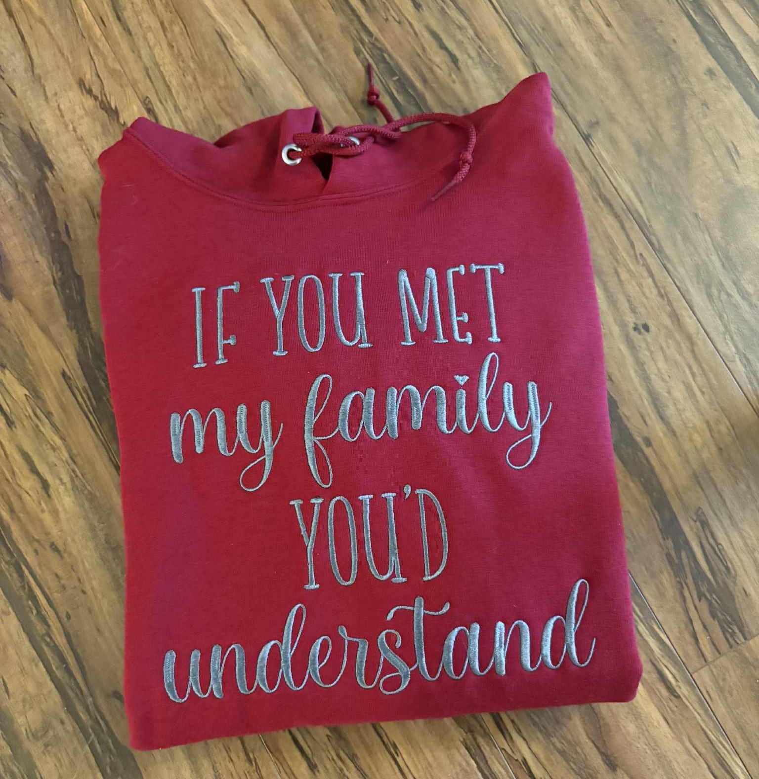 This explains it all, doesn't it? Humorous embroidered hoodie will keep you warm at all those family get togethers. If you need a different size, send me a message and I will try my best to help you out.