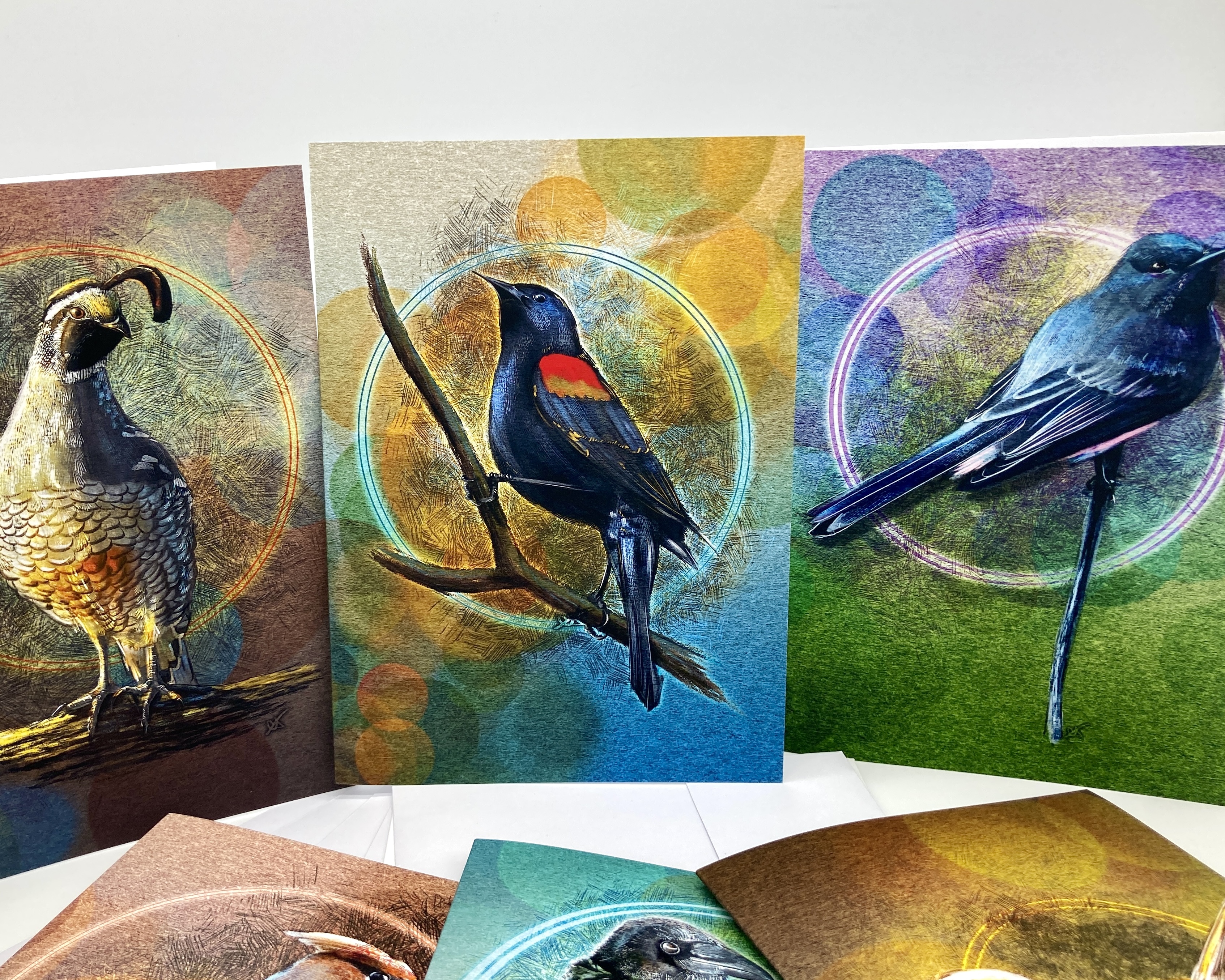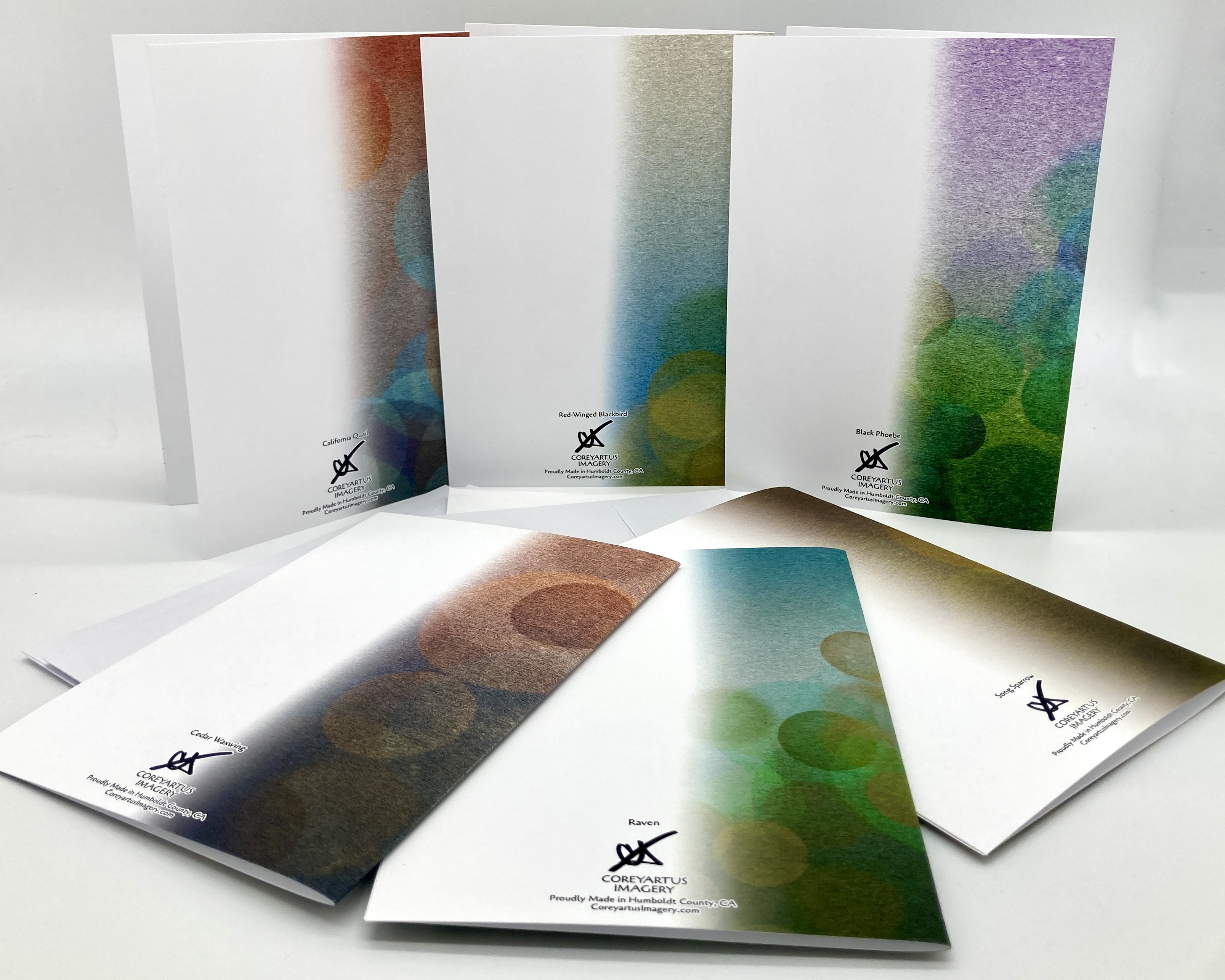 This variety pack of cards features birds found along the Redwood Coast of the Pacific Northwest of the United States. The pack contains six different birds and six envelopes. The birds in the pack include a Raven, a Cedar Waxwing, a Black Phoebe, a California Quail, a Redwinged Blackbird, and a Song Sparrow.