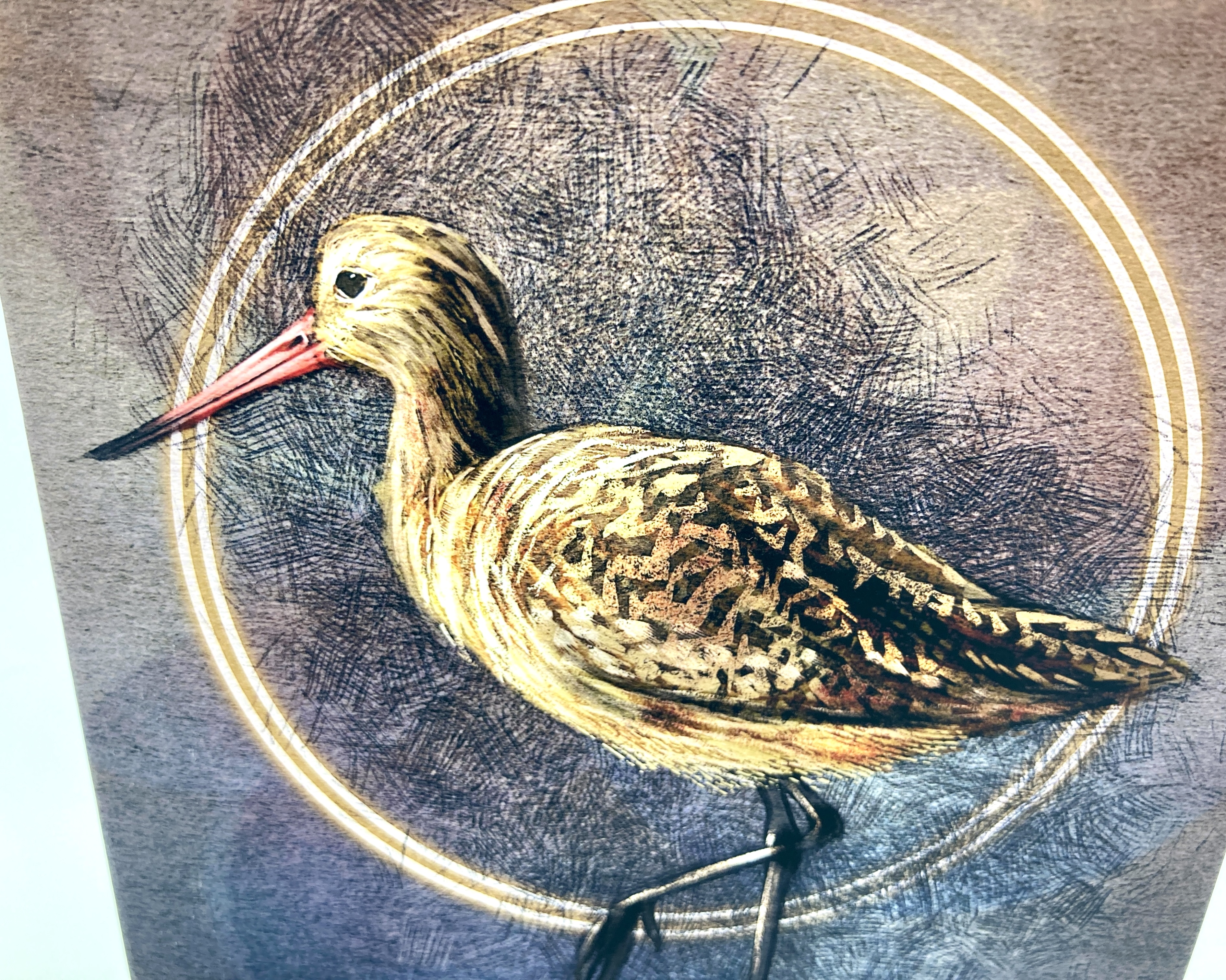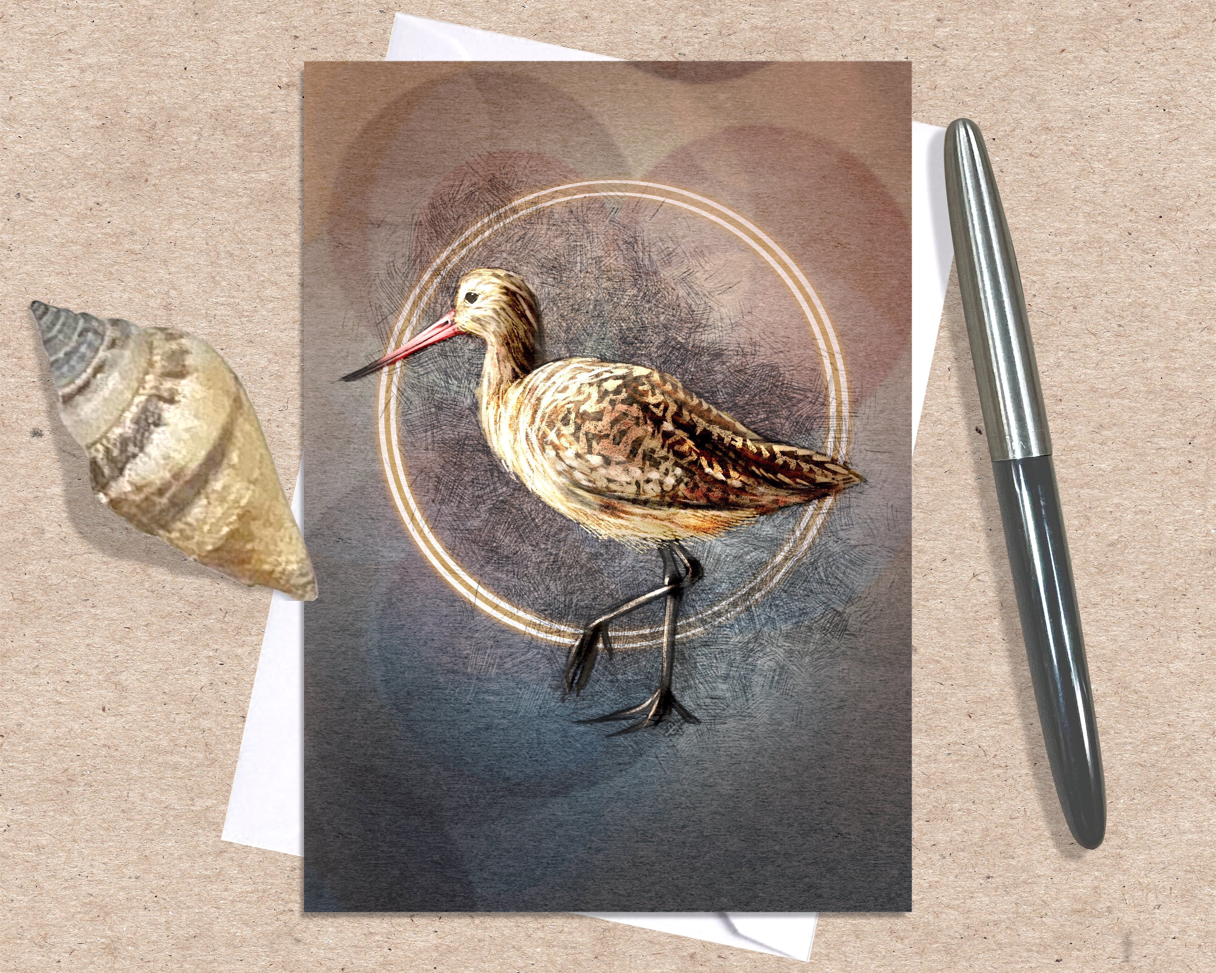 Vibrant Handmade Illustration Made in the USA: This hand-made greeting card set features an Marbled Godwit on a paper textured background and dramatically lit with a focused light.The illustration on the front was illustrated by Eureka, CA artist Corey Johnston using Procreate on the iPad, making the image a hand-made special edition.