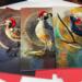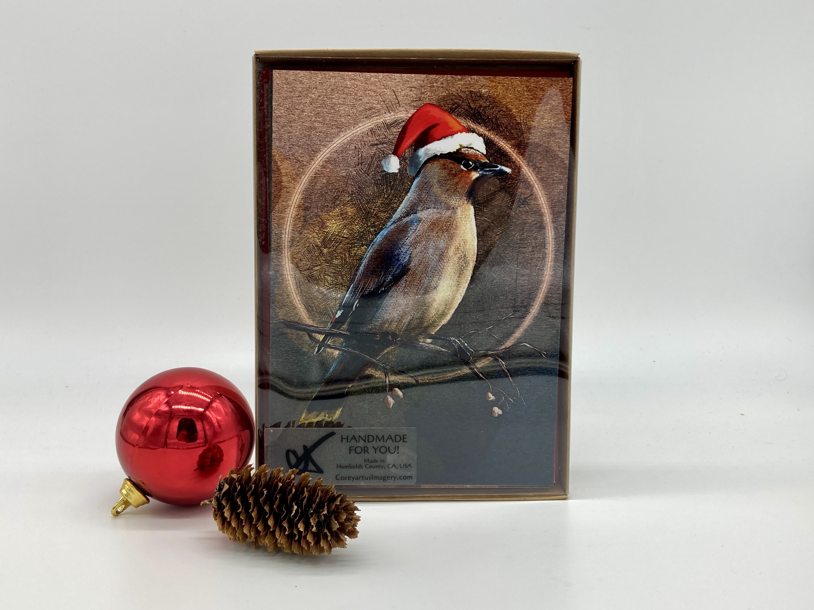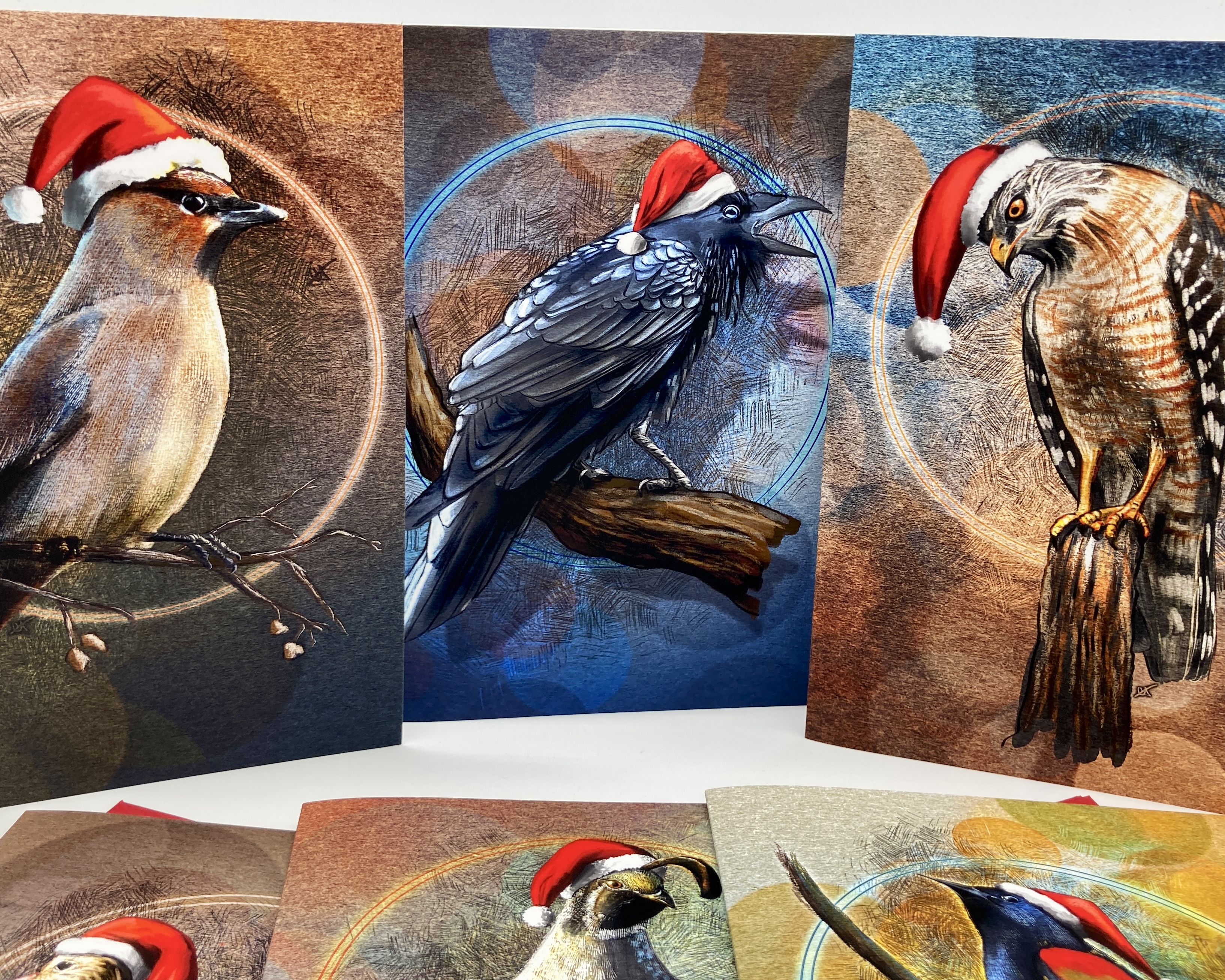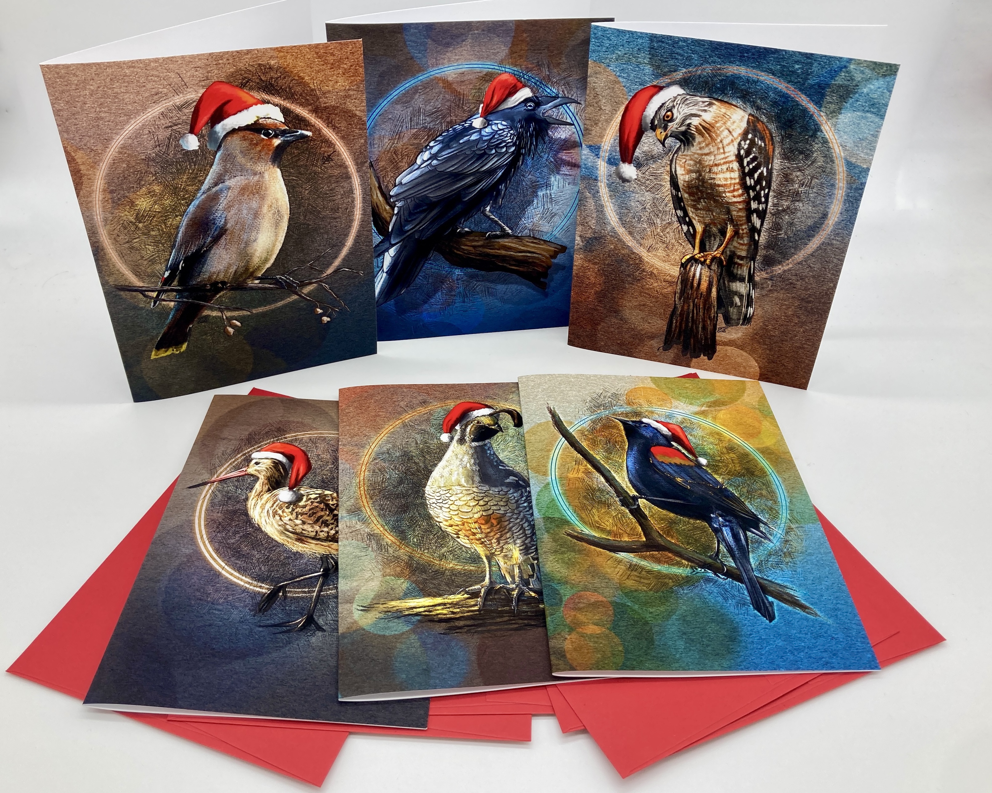 These birds are all dressed up for the Season! Each bird wears a Santa hat of brilliant red, perched on the head of its beautifully rendered form. Birds include a Red-Winged Blackbird, a California Quail, a Marbled Godwit, a Red-Shouldered Hawk, a Raven, and a Cedar Waxwing--all birds found along the Redwood Coast in Humboldt County in northern California.