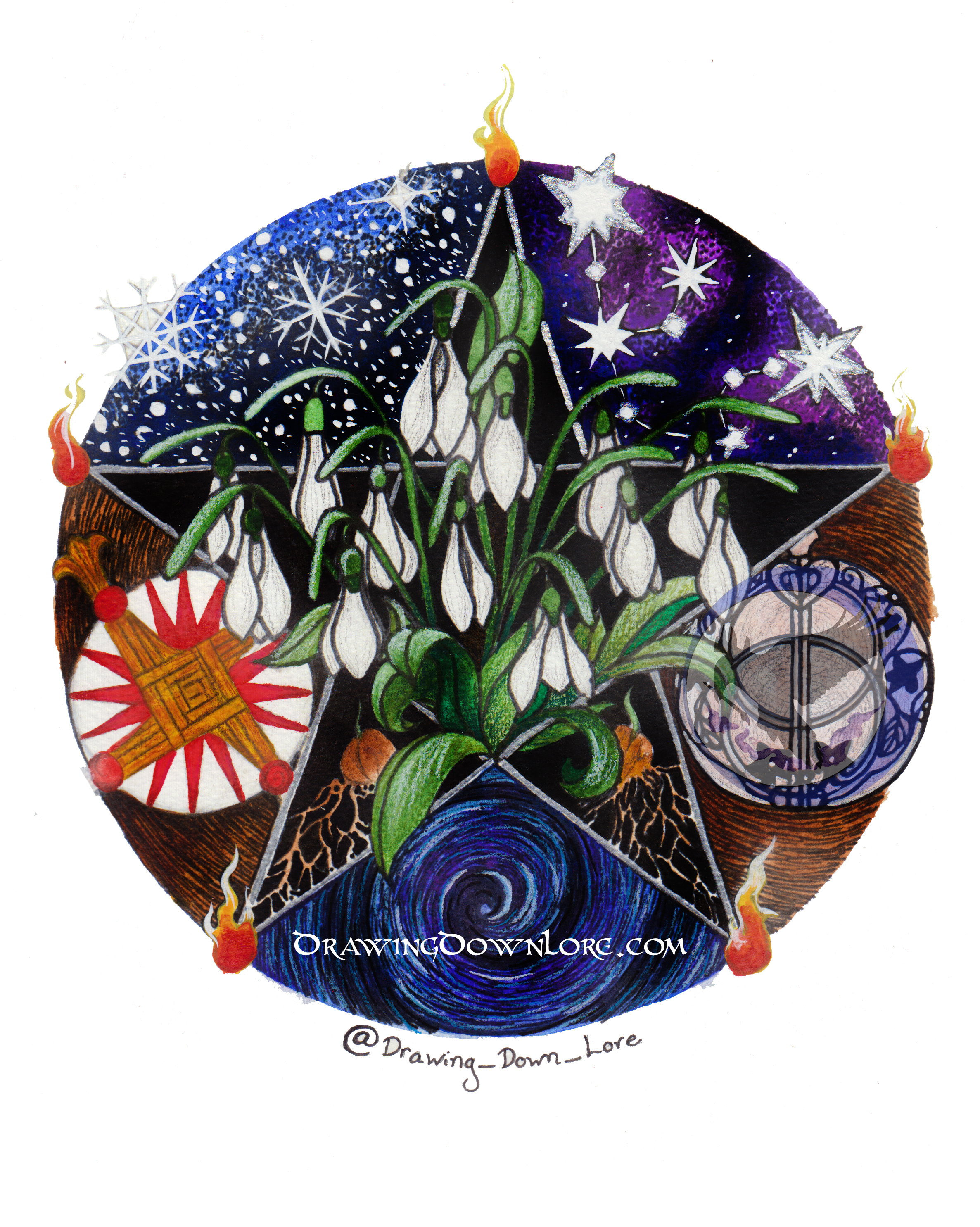 This is the fourth piece in my Wheel of the Year series. Winter snowdrops bloom from the center of the pentacle, surrounded by snow, stars, the Chalice Well from Glastonbury, and Brighid's Cross.