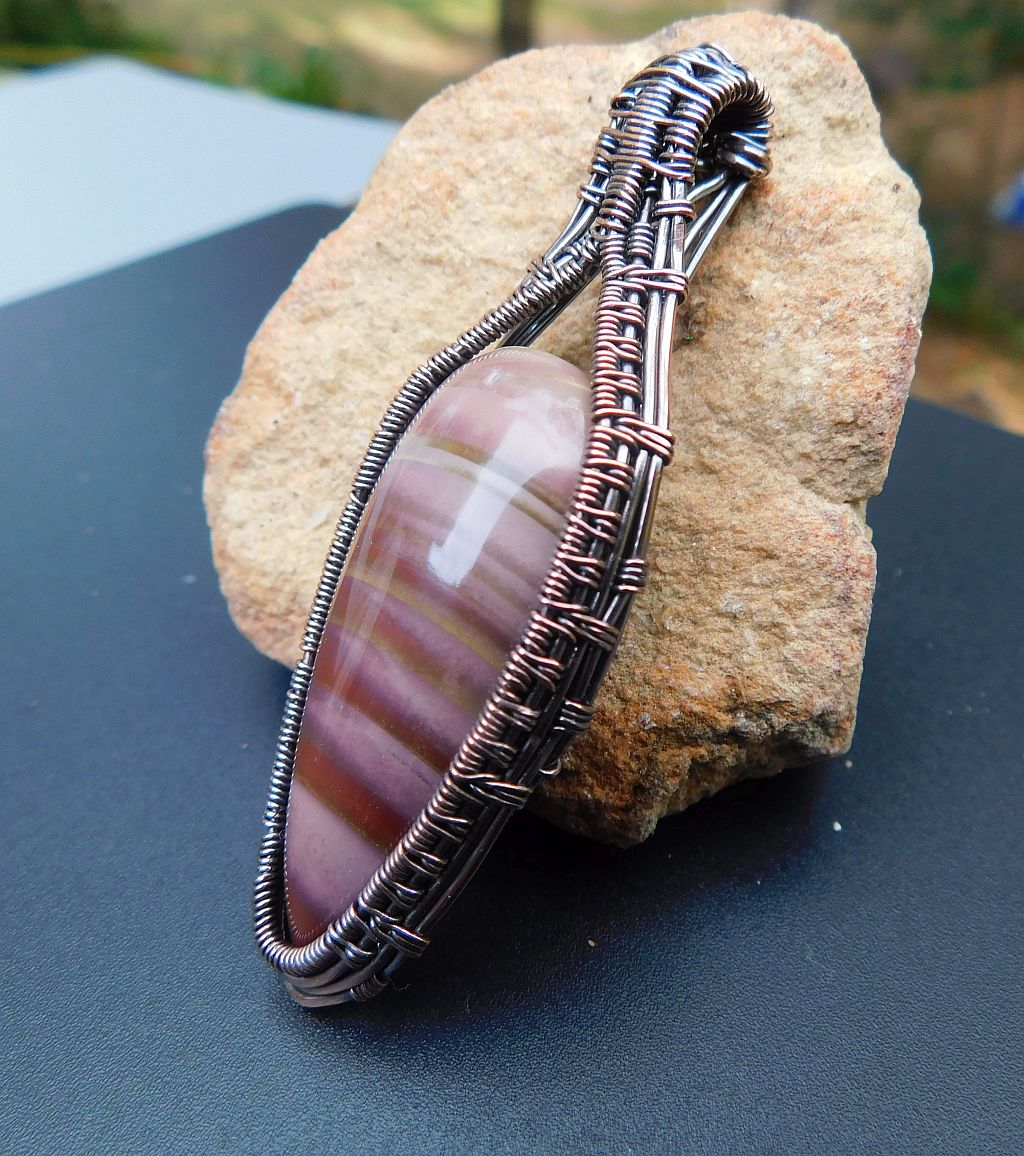 An intricate woven border wrap secures this gleaming, polished cabochon.