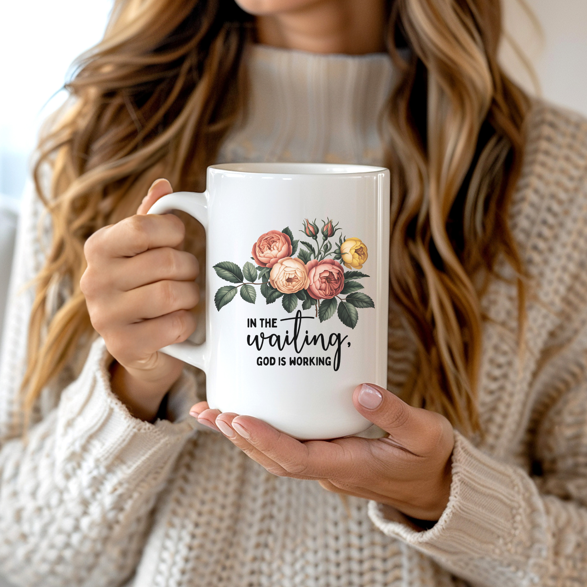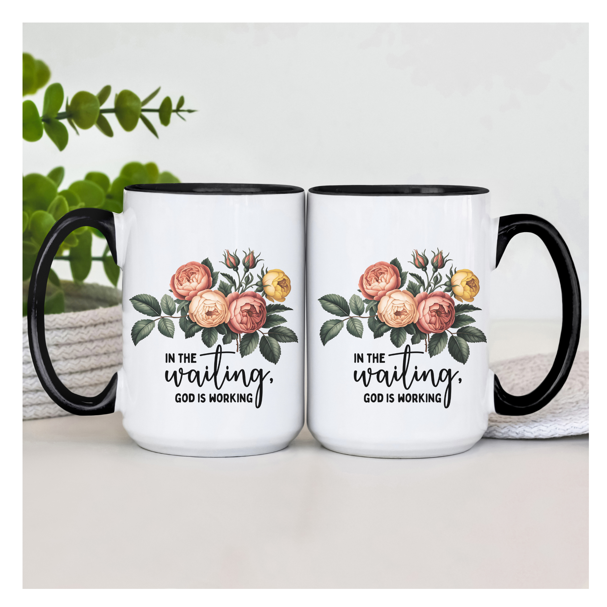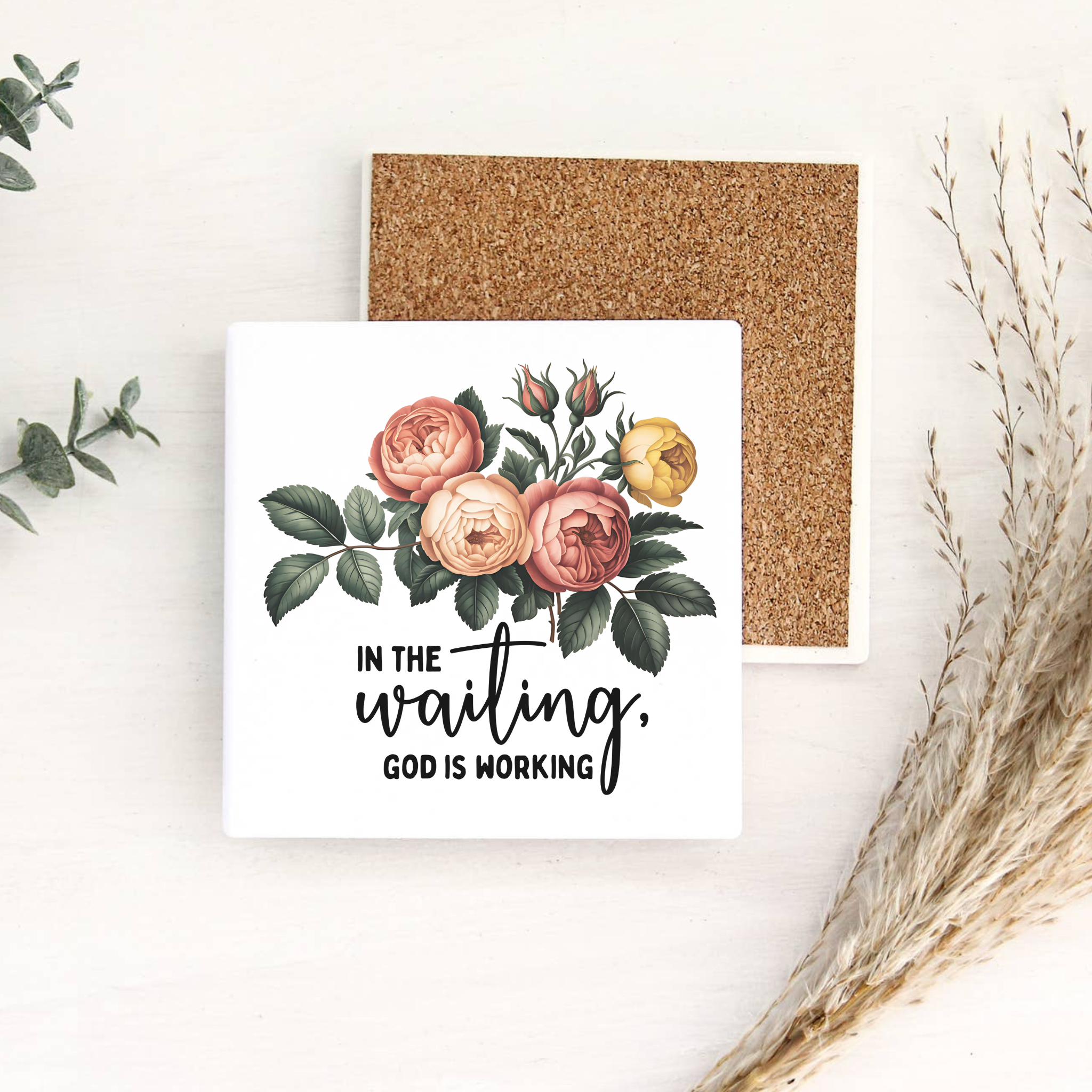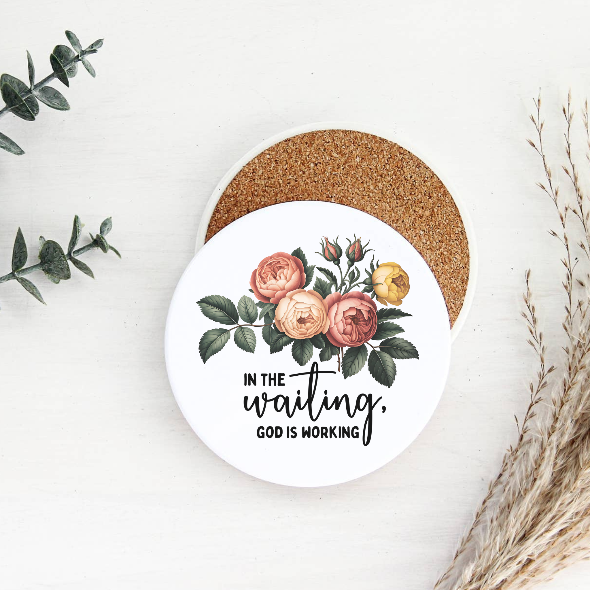 Color mug with quote, "In the waiting God is working." and you also have the option to add a round or square sand stone ceramic coaster.