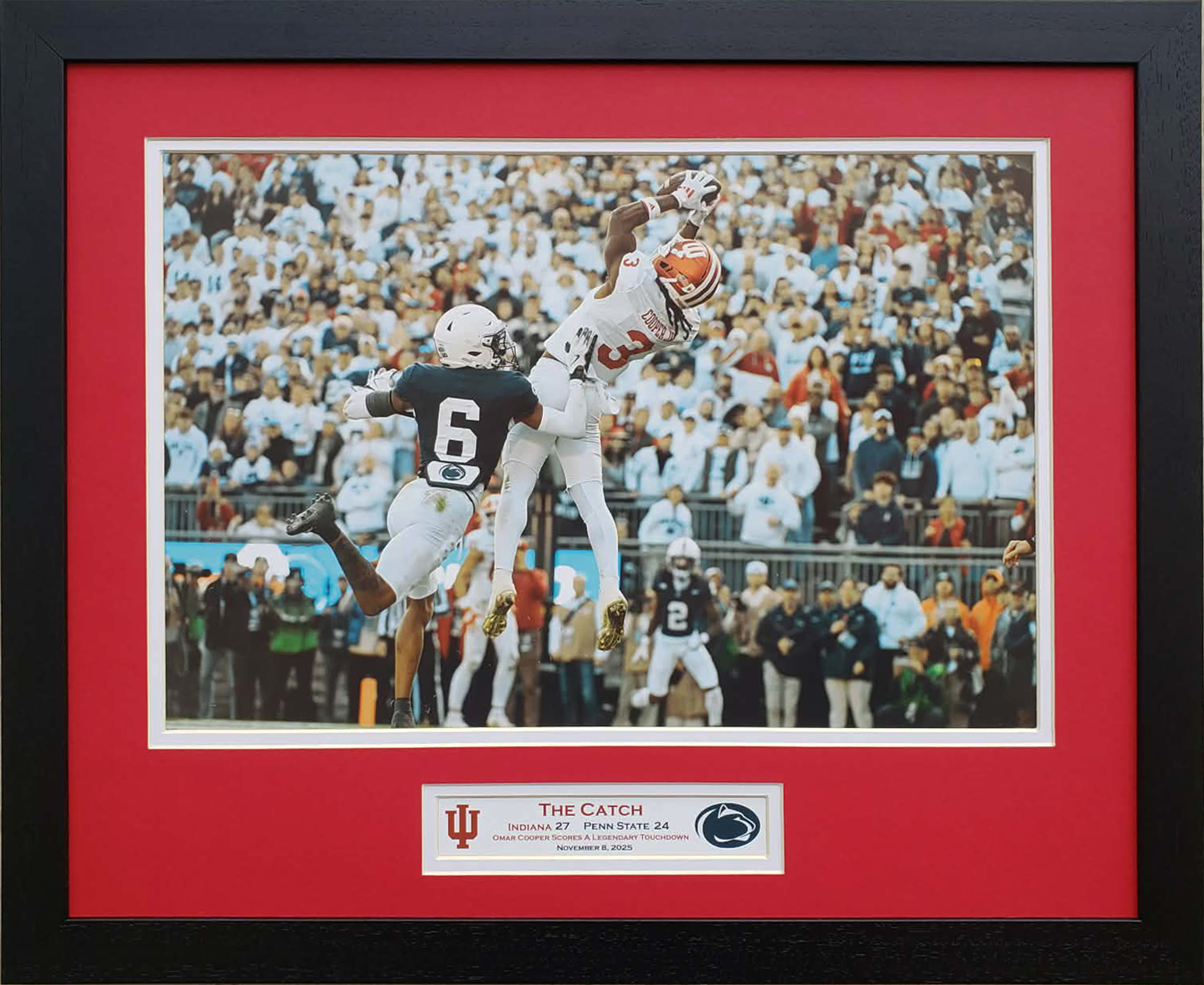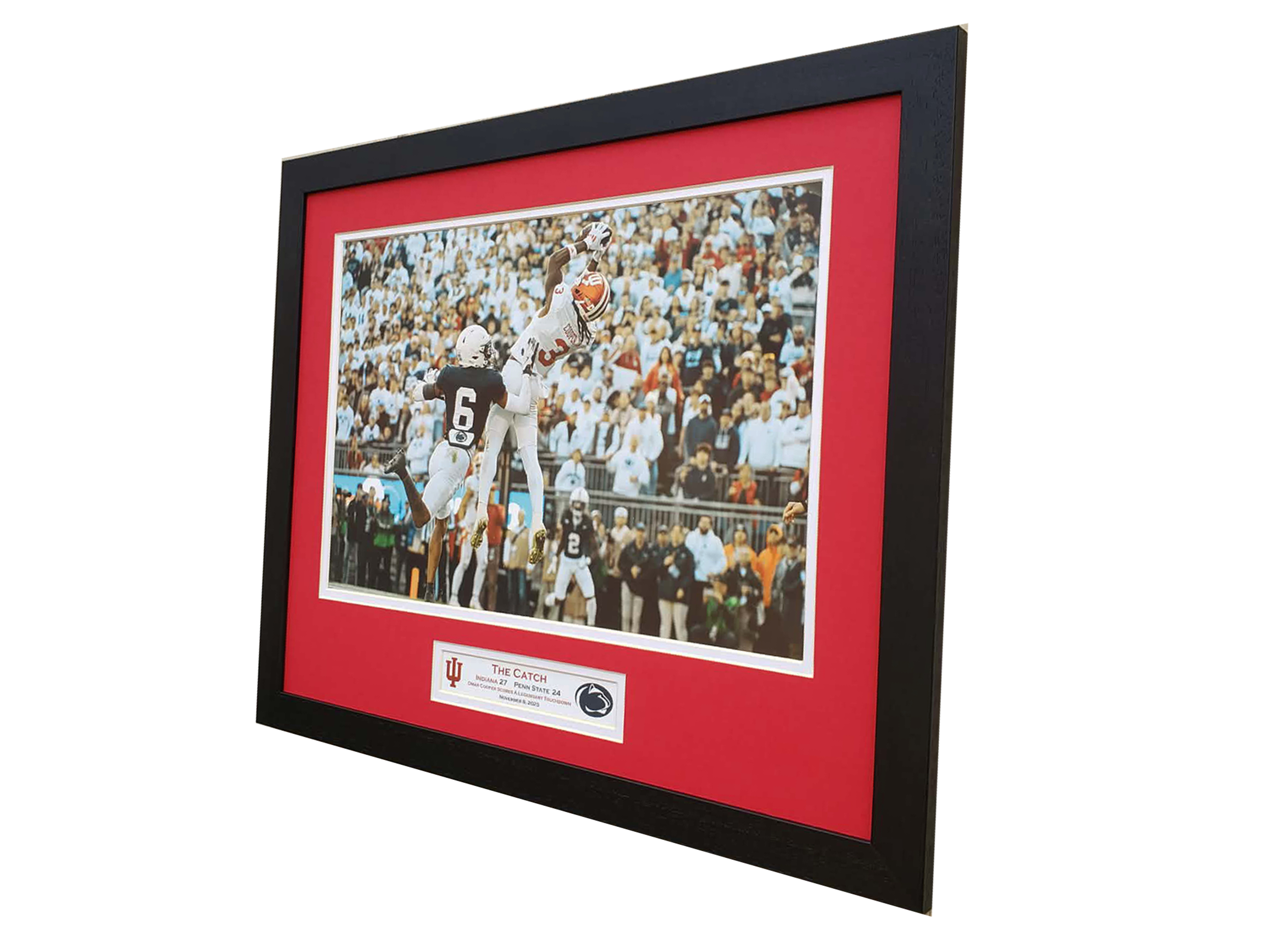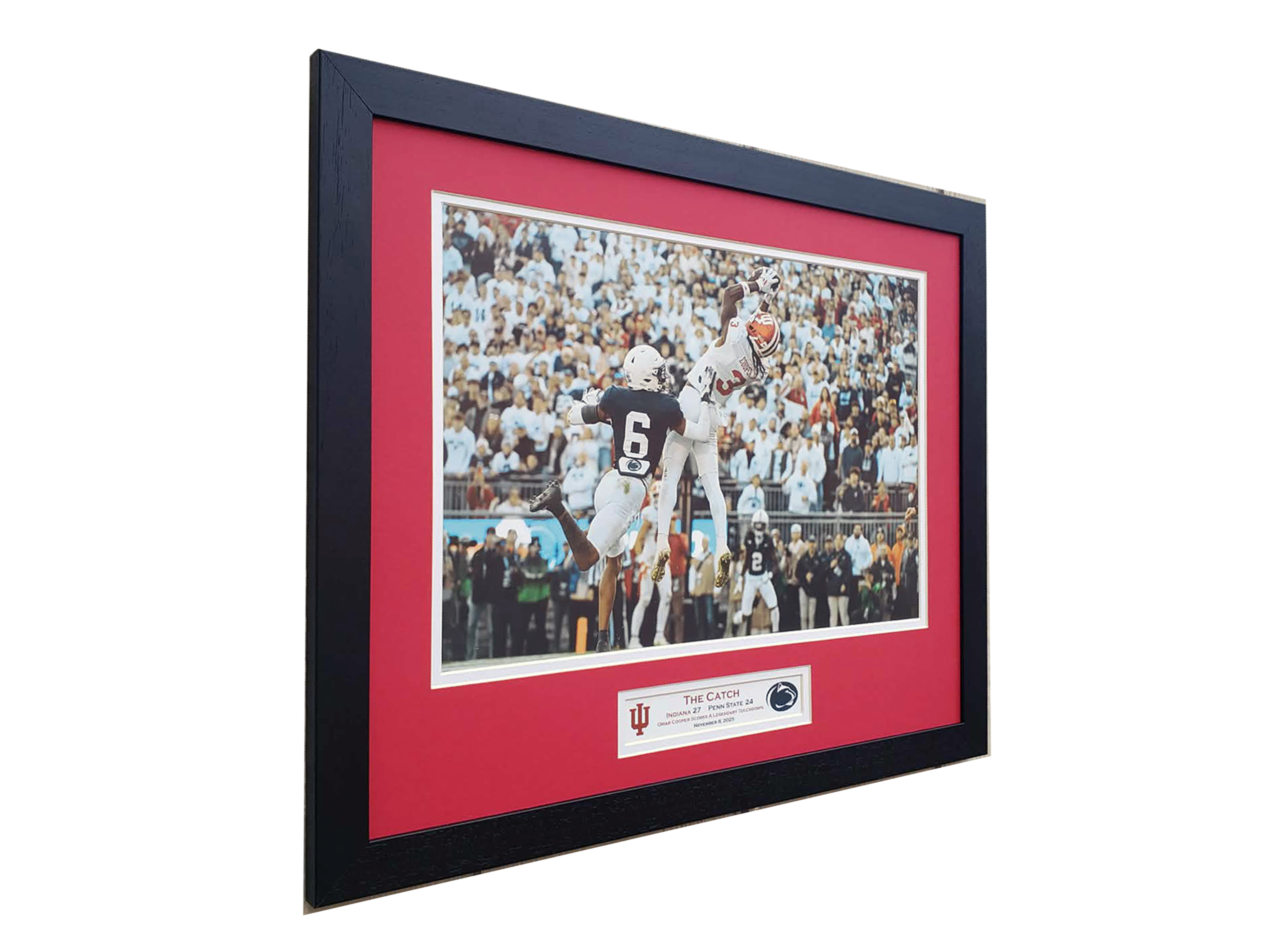 Celebrate the Indiana Hoosiers 2025 victory over Penn State with this one of a kind custom framed picture. Featuring the moment that Omar Cooper caught the ball for the game winning touchdown barely landing a foot in the endzone to win the game. A truly Legendary moment in Hoosiers history. A very special gift for your very special fan. Measuring 20 x 16 inches or 24 x 30 inches and framed in durable hand crafted moulding from the species White Oak. Double matted in Cresent Select matting with logo cut directly into mat and nameplate depicting the event. Permanently dry mounted to Bainbridge foam core to ensure the print never wrinkles or bubbles even in the most severe environments. Encased in Tru Vue UV protected acrylic glass to ensure superb clarity and intact shipping. Heavy duty black craft paper dust cover or backing. Heavy duty AMS hangers with 150 pound rated braided steel wire hanger. Complimentary artwork hanger with every order for effortless installation. Handmade in Kentucky. Fast and Free Shipping. Materials Used: -Handmade wooden moulding from the species oak -AMS heavy duty wire hangers -Tru Vue UV protected acrylic glass -150 pound braided steel wire hanger -Bainbridge foamcore -Cresent Select matboard -Complimentary artwork hanger -Heavy Duty black craft paper backing -Premium drymount tissue -Fletcher Terry framers points -Scappa double sided professional grade tape -Epson premium luster photo paper 100 pound