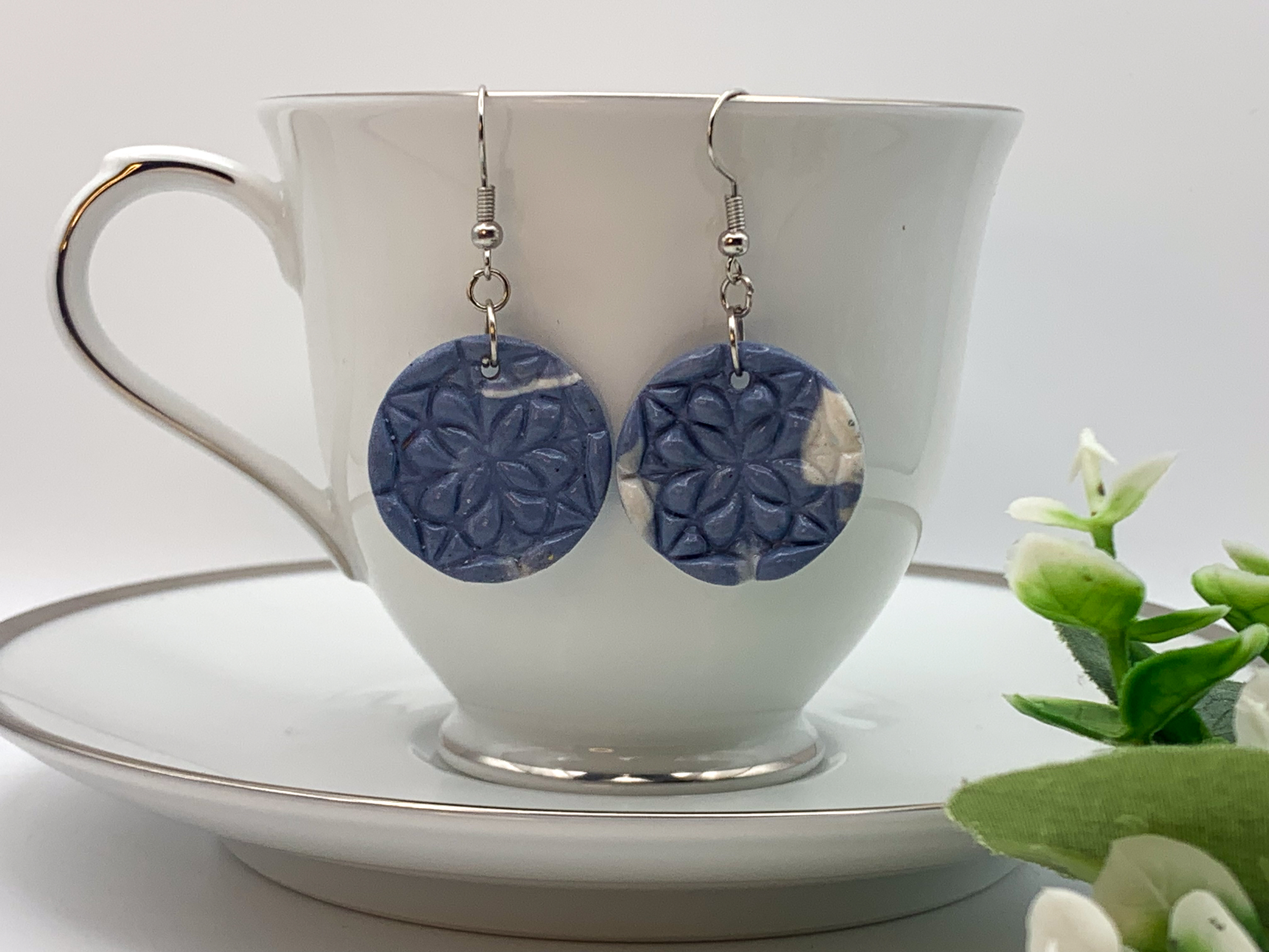 These round earrings feature a delicate embossed mosaic pattern in calming shades of blue and cream. Perfect for nature-inspired looks!