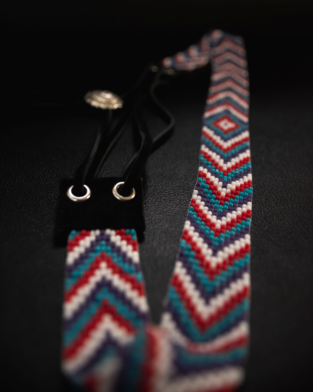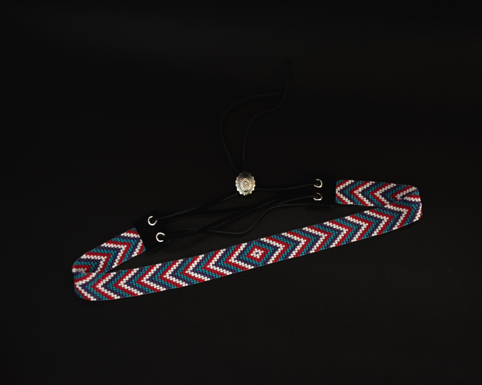 Loom beaded Infinity Diamond Seed bead hatband with white, red, turquoise and purple seed beads. Black suede leather ends, silver eyelets, black suede leather lace tie and silver concho. Adjustable tie concho closure.