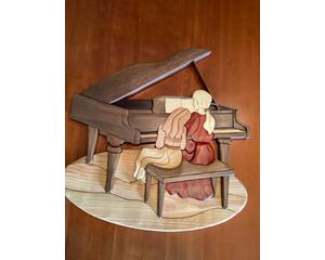 The 70+ pieces are hand cut on the scroll saw. They are shaped and assembled and a back is added. No stains or dyes are used, just natural wood colors.