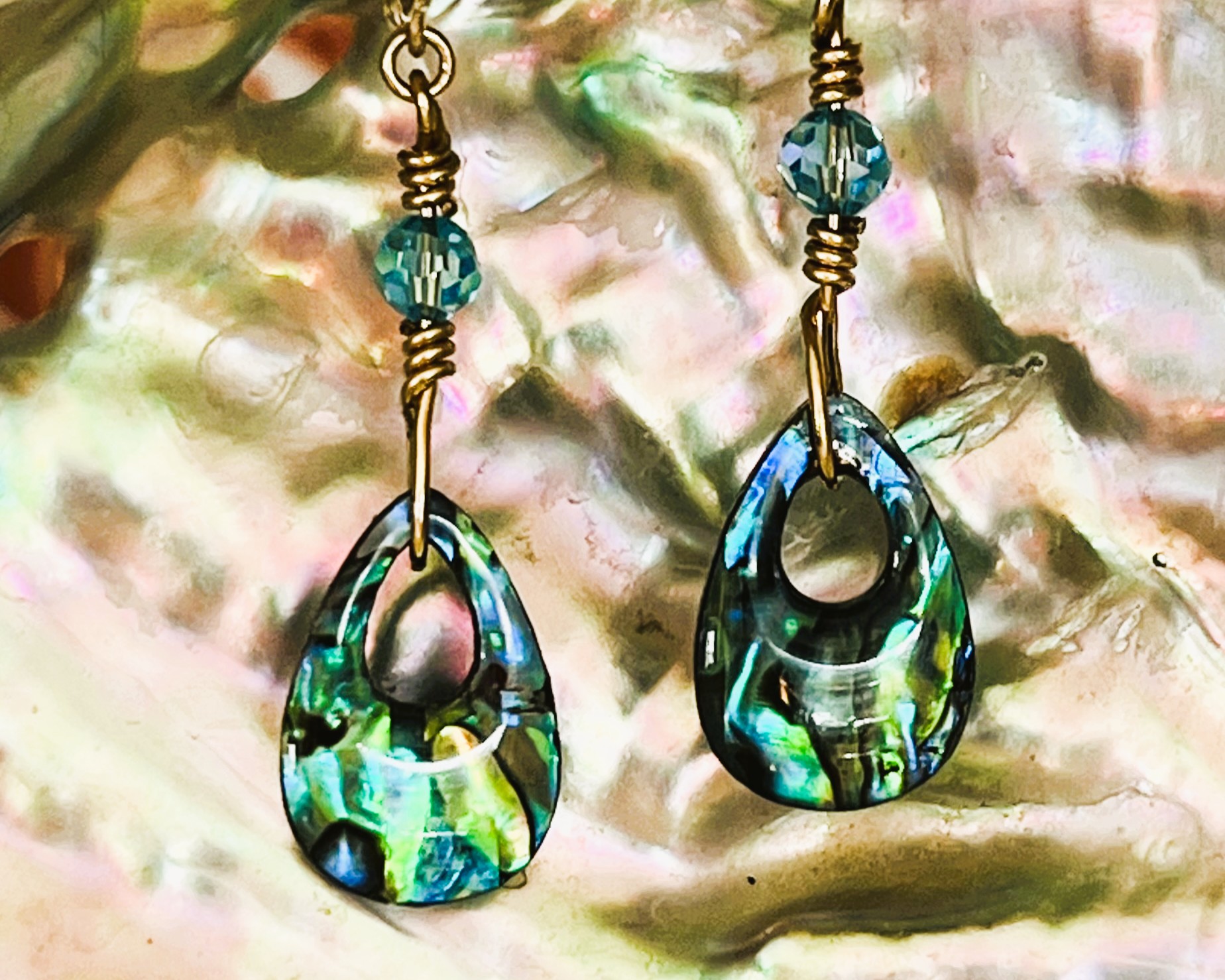 From the sea, these earrings are made with the iridescent interior of the abalone shell. In motion, an eye- catching color display ensues in greens and blues, with hints of lavender, pink, and yellow.
