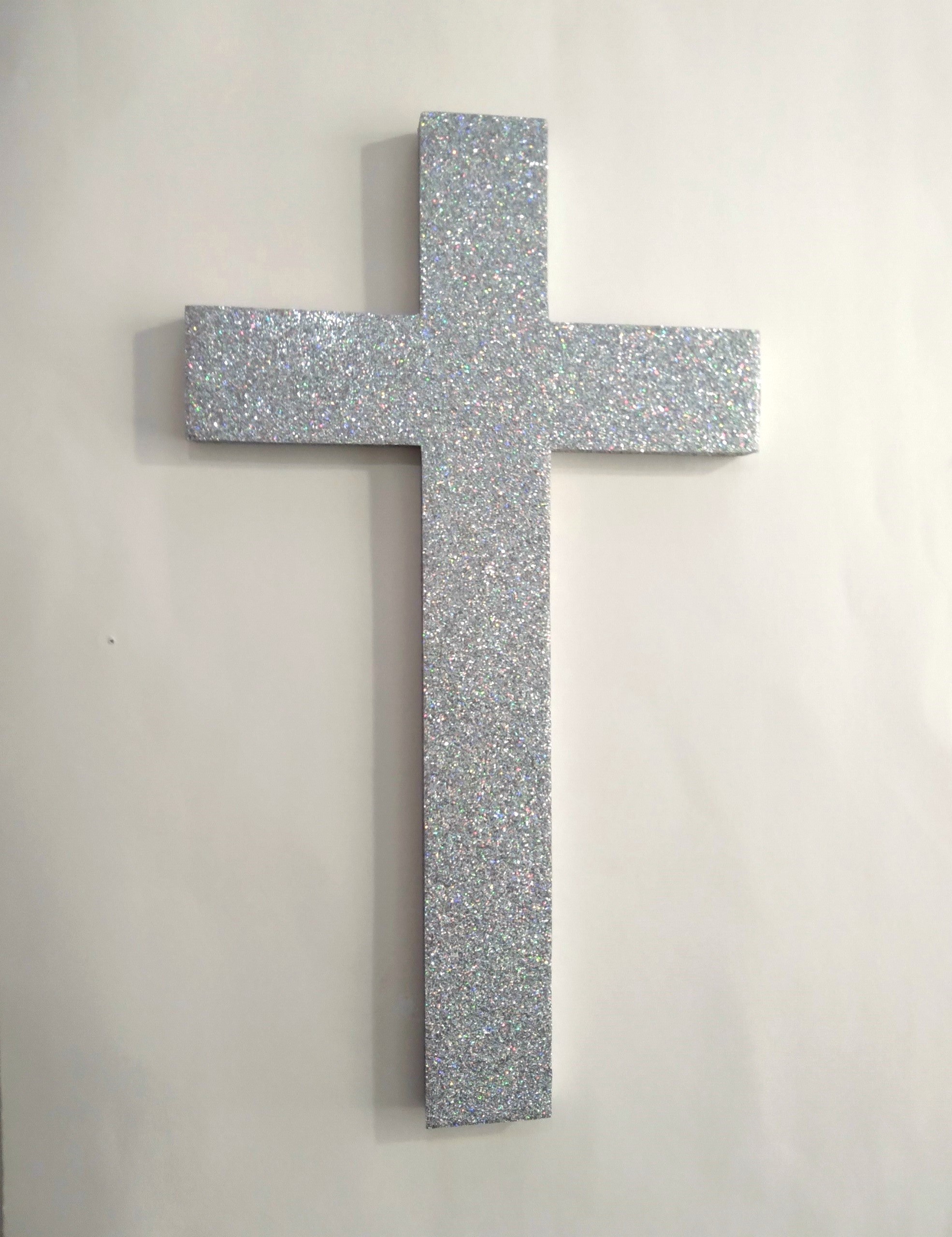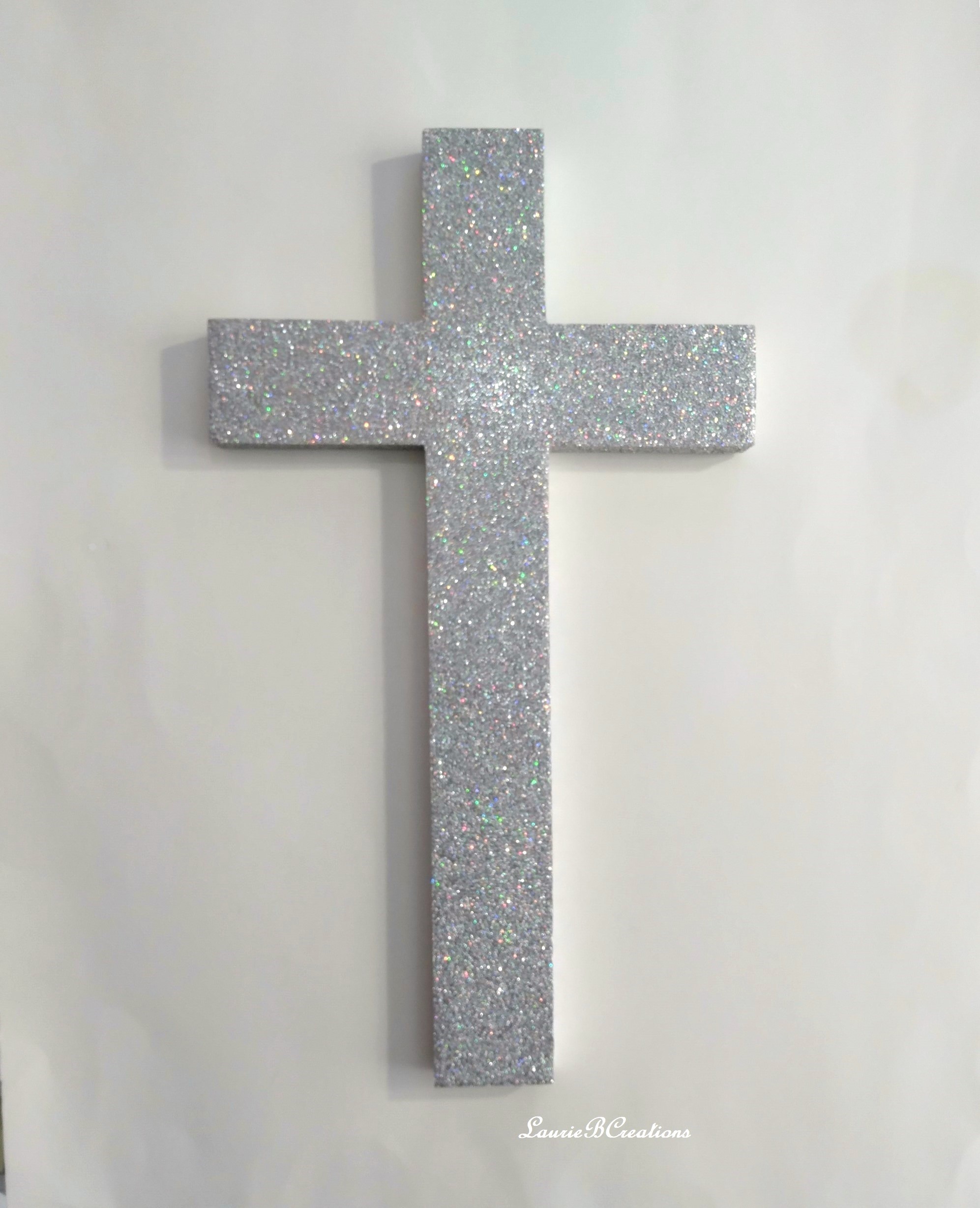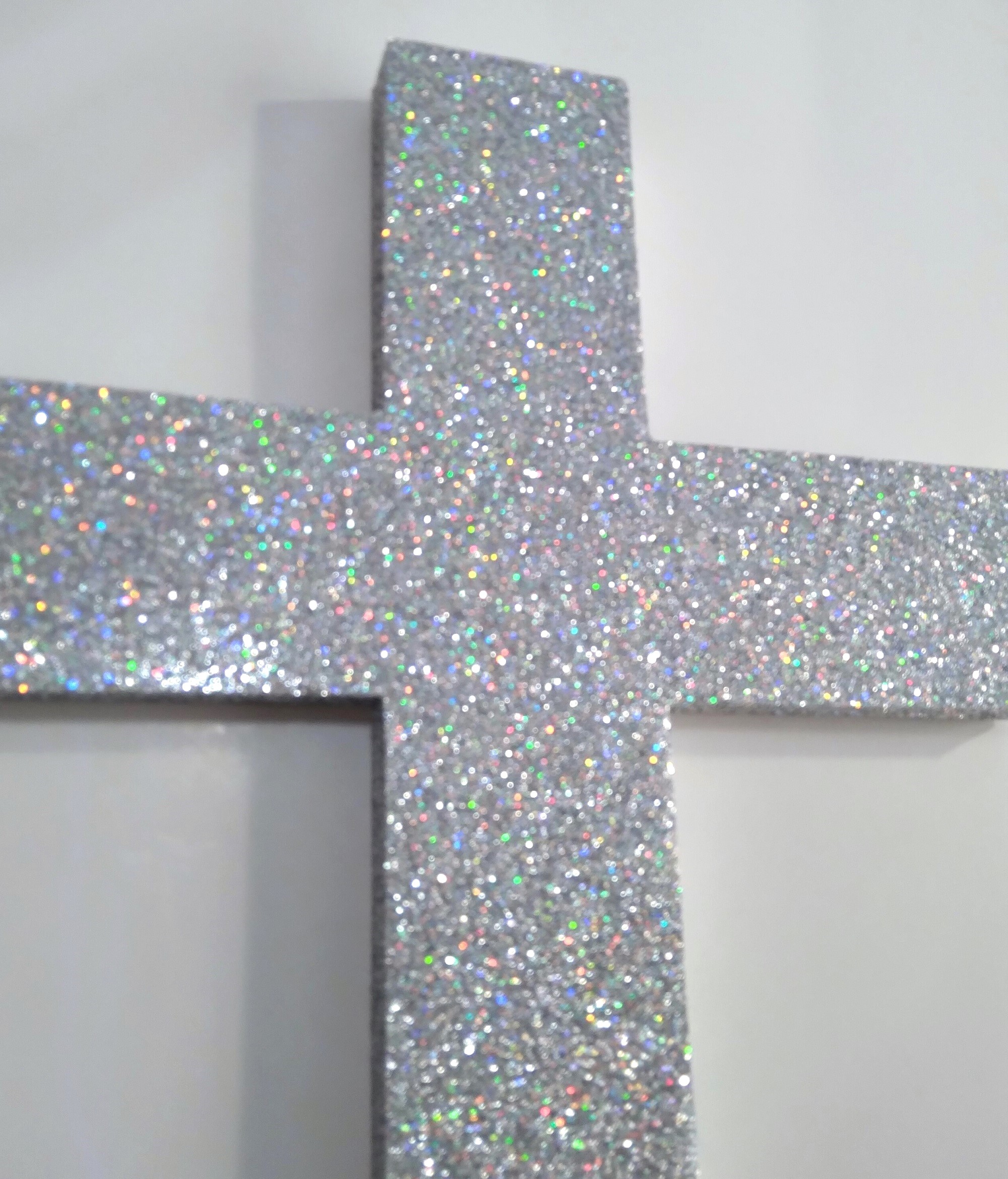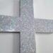 Add sparkle and faith to any room! This iridescent silver glitter wall cross has beautiful sparkle from every angle! It has a combination of fine silver glitter and fine iridescent glitter, giving a slight holographic color to it. The glitter is in the glitter stock material, so there is no loose glitter or shedding. The glitter surface covers the front and all sides and has a clean fine edged look. The cross is made from pine wood. Comes ready to hang. Very beautiful, especially in person! If you like sparkle or glitter, you will love this! Available in 9.5" L x 5.5" W or 12" L x 7.5" W. It is 1/2 inch thick. When ordering, please select from the drop down menu which size you prefer. Also available in other fine glitter varieties (see other listing). Handmade to order..please allow 5-7 business days to make and ship.